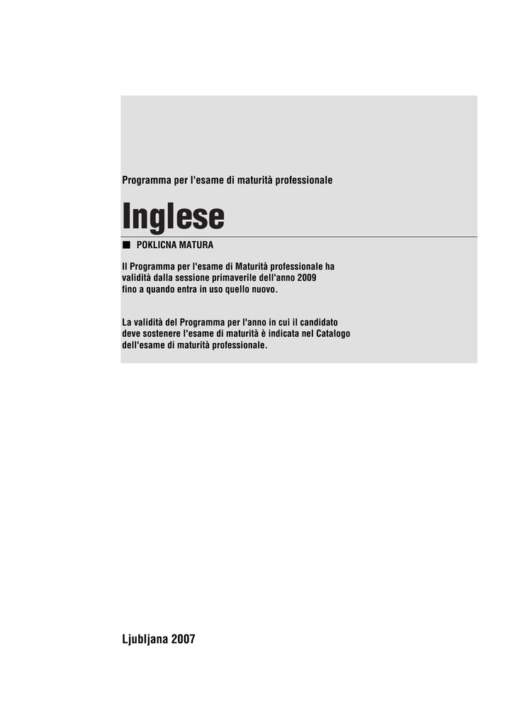 Programma per l'esame di maturità professionale Inglese POKLICNA MATURA Il Programma per l'esame di Maturità professionale ha validità dalla sessione primaverile dell'anno 2009 fino a quando entra in uso quello nuovo. La validità del Programma per l'anno in cui il candidato deve sostenere l'esame di maturità è indicata nel Catalogo dell'esame di maturità professionale. Ljubljana 2007 SOMMARIO 1. Introduzione 4 2. Obiettivi dell'esame 5 3. Struttura e valutazione dell'esame 7 3.1 Schema delle prove 8 3.2 Tipologie testuali e tipi di prove 9 3.3 Valutazione 4. Contenuti dell'esame 12 16 4.1 Funzioni comunicative 16 4.2 Ambiti tematici e contenuti 18 4.3 Contenuti grammaticali 22 5. Adattamenti per candidati con esigenze particolari 25 6. Appendice 26 6.1 Esempi di prove d'esame 26 7. Letture e bibliografia consigliate 49 1. INTRODUZIONE Il presente catalogo è destinato ai candidati che sceglieranno la lingua inglese quale terza materia da affrontare all'esame di maturità professionale. Sarà inoltre un punto di riferimento per le insegnanti e gli insegnanti di lingua inglese che prepareranno i candidati ad affrontare tale esame. Il presente catalogo fa riferimento alla Legge sull'esame di maturità (Boll.Uff. della RS, n.15/03), ai cataloghi del sapere per le scuole medie professionali, per l'istruzione tecnico professionale (Consiglio curricolare nazionale, Commissione curricolare per la lingua inglese, 1998), per l'istruzione media professionale (SSI) e l'istruzione tecnico – professionale (PTI), al catalogo del sapere per la lingua straniera e la seconda lingua nelle zone nazionalmente miste (secondo le direttive del SSRSSI Consiglio degli esperti della RS per l'istruzione generale – seduta numero 99 in data 15. 2. 2007), nonché al Regolamento sulla maturità negli istituti tecnici. I candidati che sosterranno l'esame dovranno dimostrare di aver raggiunto gli obiettivi previsti. Potranno prepararsi avvalendosi dell'aiuto dei libri di testo adottati e di altro materiale aggiuntivo previsto per l'istruzione media professionale e tecnica. Nel catalogo sono descritti gli obiettivi da verificare, la struttura dell'esame, i sussidi consentiti, la valutazione ed i contenuti dell'esame. Sono inoltre presentati, in allegato, alcuni esempi di prove e la bibliografia usata. Con l'esame di lingua inglese nel corso della maturità professionale si intende verificare e valutare il livello di padronanza della lingua straniera al termine dell'istruzione media professionale vale a dire le competenze linguistiche pratiche, funzionali che si esplicitano come CAPACITA' DI COMUNICARE IN UNA LINGUA STRANIERA (inglese) in situazioni concrete. Per tale motivo l'esame stesso è composto da prove chiare, sensate, legate a situazioni reali della vita di ogni giorno. Le prove orali, in particolare, dovranno essere quanto più vicine al futuro settore lavorativo del candidato. La parte orale dell'esame verifica la capacità di comunicare oralmente e comprendere quanto si ascolta in situazioni comuni, della vita di ogni giorno, nonché in situazioni tipiche o frequenti nel settore professionale del candidato. Nel preparare gli esercizi per la prova orale gli insegnanti dovranno considerare il livello di difficoltà e le particolarità del programma, le necessità professionali previste, i temi trattati nel corso della scuola media, nonché i diversi stili di insegnamento-apprendimento. Ci si aspetterà inoltre che i candidati stessi, conoscendo il proprio campo professionale, collaborino al processo didattico, indicando le rispettive necessità e i desideri legati a quella determinata professione. La maggior parte degli esercizi offrirà ai candidati la possibilità di esprimere il proprio parere ed il punto di vista personale. I temi proposti ed i contenuti comprendono situazioni della vita di ogni giorno, la nostra cultura e la cultura degli altri popoli, temi specifici legati ai diversi campi professionali e ai rapporti interpersonali. 4 Inglese 2. OBIETTIVI DELL'ESAME Il fine dell'esame è valutare le COMPETENZE raggiunte nella lingua inglese al termine della scolarizzazione nell'ambito dei programmi per l'istruzione media professionale.Tale valutazione avviene in accordo con il catalogo valido per l'esame di maturità professionale. Nel corso dell'esame il candidato dovrà dimostrare di essere in grado di: 1. comprendere il senso delle singole informazioni contenute in testi autentici scritti in lingua inglese e tratti da fonti diverse (es. giornali, riviste, opuscoli, prospetti, cataloghi, manifesti, Internet ...), che riguardano tematiche genereli o più specifiche, legate al futuro settore professionale; 2. comprendere domande, istruzioni, richieste e rispondere in maniera pertinente, interagendo con l'interlocutore (insegnante); 3. comunicare nell'ambito di contesti legati alla vita di ogni giorno o di specifiche situazioni legate al settore professionale; 4. saper esprimere oralmente/o in forma scritta il proprio parere e le proprie sensazioni partendo da uno stimolo scritto o da un'illustrazione; 5. fare una breve relazione orale su un testo letto in lingua inglese (linguaggio comune o microlingue professionali); 6. esporre oralmente un argomento (generale e più specifico-professionale) trattato in classe e trarne spunto per una discussione; 7. produrre vari tipi di testo in forma scritta (es. lettera, invito, richiesta, biografia, descrizione, relazione, presentazione); 8. produrre brevi testi scritti articolati in modo da esprimere il proprio parere, descrivere i propri interessi, le proprie sensazioni o addurre argomenti a favore o contro una determinata questione in riferimento a tematiche generali o tipiche di un settore specifico; 9. scegliere ed usare (nella forma scritta o orale) i mezzi linguistici adatti in base alla situazione concreta, al contesto, allo scopo comunicativo o al destinatario. Oltre alle singole attività collegate alla lettura, all'ascolto, alla scrittura ed al pa