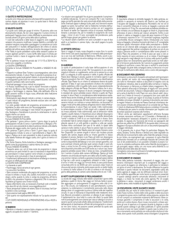 INFORMAZIONI IMPORTANTI 1) QUOTE DI PARTECIPAZIONE Le quote sono intese per persona sulla base dell’occupazione di una camera doppia, ed espresse in euro. La quota base è riferita alla data di partenza dall’Italia. 2) VALIDITÀ QUOTE • Le quote sono valide per gruppi di minimo 15 persone, salvo ove diversamente indicato. Se non viene raggiunto il numero minimo di partecipanti l’agenzia dove è stata effettuata la prenotazione verrà avvisata almeno 20 giorni prima della data di partenza. • I costi del carburante e delle tasse di soggiorno sono soggetti a variazioni che possono modificare il prezzo dedotto a contratto; tali variazioni vengono computate a passeggero. La variazione sul costo del carburante è il risultato dell’applicazione del criterio di calcolo adottato dal vettore aereo, marittimo, terrestre che esegue il servizio. • Per l’Italia: le quote potrebbero subire delle variazioni qualora venissero applicati aumenti o nuove tariffe delle tasse di entrata per i pullman turistici o tasse di soggiorno nelle città previste da programma. • Per le partenze incluse nel periodo dal 1/11/15 al 30/4/16, le quote sono soggette a riconferma. LA QUOTA COMPRENDE Entrambe le formule VIAGGIO IN PULLMAN e VIAGGIO IN AEREO • Trasporto in pullman Gran Turismo e accompagnatore, salvo dove diversamente indicato. In alcuni Paesi è prevista la presenza di accompagnatori-guide locali parlanti italiano. In alcune destinazioni, gli accompagnatori-guide locali non sono presenti durante i voli interni, in quanto cambiano nelle varie località. • Eventuali passaggi in treno indicati nei programmi. • In Russia: trasferimenti da e per le stazioni ferroviarie e biglietto del treno da Mosca a San Pietroburgo o viceversa, con cestino da viaggio e facchinaggio in stazione. Nelle città dell’Anello d’Oro le guide possono essere di lingua russa, affiancate dalla traduzione dell’accompagnatore. • Sistemazione negli alberghi indicati, o similari, in camera doppia. • I pasti indicati nel programma, bevande escluse salvo ove diversamente indicato. • Le visite guidate indicate nel programma, ad eccezione di quelle facoltative. Le altre visite sono con l’accompagnatore. • Eventuali battelli e passaggi in nave indicati nei programmi. In Sicilia, Sardegna e Scandinavia è prevista la sistemazione in cabine doppie interne con servizi. • Tasse e percentuali di servizio. Formula VIAGGIO IN PULLMAN: • Per partenze 1 giorno prima e rientro 1 giorno dopo: la quota di partecipazione include la cena e il pernottamento a Bologna o Padova sia la sera precedente la data di partenza indicata sulla tabella Partenze del viaggio scelto, che il giorno di rientro. • Per partenze 2 giorni prima e rientri 2 giorni dopo: la quota di partecipazione include la cena e il pernottamento a Napoli e Bologna o Padova sia le sere precedenti la data di partenza indicata sulla tabella Partenze del viaggio scelto, che il giorno di rientro e il successivo. • Per Sicilia Classica, Sicilia Autentica e Sardegna: passaggi in traghetto come da programma in cabina interna con servizi. Formula VIAGGIO IN AEREO: • Trasporto aereo con voli di linea come da programma in classe economica con posti limitati (in caso di mancanza di disponibilità e per prenotazioni in classi superiori verrà richiesto un supplemento il cui importo verrà comunicato in fase di prenotazione). • I trasferimenti dall’aeroporto di destinazione all’albergo e viceversa, nei giorni di effettuazione del viaggio. LA QUOTA NON COMPRENDE • Le bevande ai pasti. • Facchinaggi, mance ed extra di ogni genere. • Le escursioni facoltative. • Salvo eccezioni evidenziate alla pagina del programma, non sono incluse le entrate a: musei, ville, castelli, monumenti e scavi archeologici, anche quando la visita si svolge da programma, all’interno di edifici che prevedono l’ingresso a pagamento. (Per le escursioni facoltative gli ingressi sono invece inclusi). • Spese ottenimento visto, se necessario. Eventuali costi e modalità sono descritti nel sito internet: www.viaggidiboscolo.it • Tasse aeroportuali italiane ed estere, tasse di sicurezza, fuel (carburante) e crisis surcharge. • Assicurazione (vedi pagina 266-267). • Tutto quanto non espressamente indicato ne “La quota comprende”. • C.I.P. COSTO INDIVIDUALE di PRENOTAZIONE di Euro 40,00 a persona. 3) BAMBINI • Bambino: si intende in camera tripla o doppia con letto o brandina aggiunti, occupata da 2 adulti e 1 bambino. • Le riduzioni sono applicabili fino al giorno precedente il compimento dell’età indicata (es. 12 anni non compiuti). Per il volo il bambino paga una tariffa speciale che sarà comunicata all’atto della prenotazione. Eventuali spese in albergo (culla, pasti, ecc) dovranno essere pagate sul posto. Sul pullman vale la medesima normativa dell’automobile, pertanto i genitori dovranno portare con sé il seggiolino da fissarsi al sedile con l’apposita cintura di sicurezza. Importante: teniamo a precisare che, per le modalità di svolgimento dei nostri viaggi, i minori di anni 5 sono sconsigliati dal prendervene parte perché troppo giovani per godersi la vacanza. • Le riduzioni adulti e bambino non sono cumulabili: in caso di due adulti e un bambino in camera tripla, i due adulti pagano la quota intera adulti. 4) OFFERTE SPECIALI Sposi in viaggio di nozze, nozze d’argento e nozze d’oro: lo sconto viene fornito solo previa segnalazione al momento della prenotazione e con invio del Certificato di Matrimonio. Offerte, sconti e promozioni, sia da catalogo sia extra-catalogo non sono mai cumulabili fra loro. 5) ALBERGHI La quota di partecipazione è sulla base dell’occupazione di una camera doppia con servizi privati. Per l’occupazione di una camera singola è richiesto un supplemento, anche se la camera ha un solo letto. La categoria, di solito espressa in stelle, è quella ufficiale del Paese dove l’albergo è ubicato, quando le normative vi