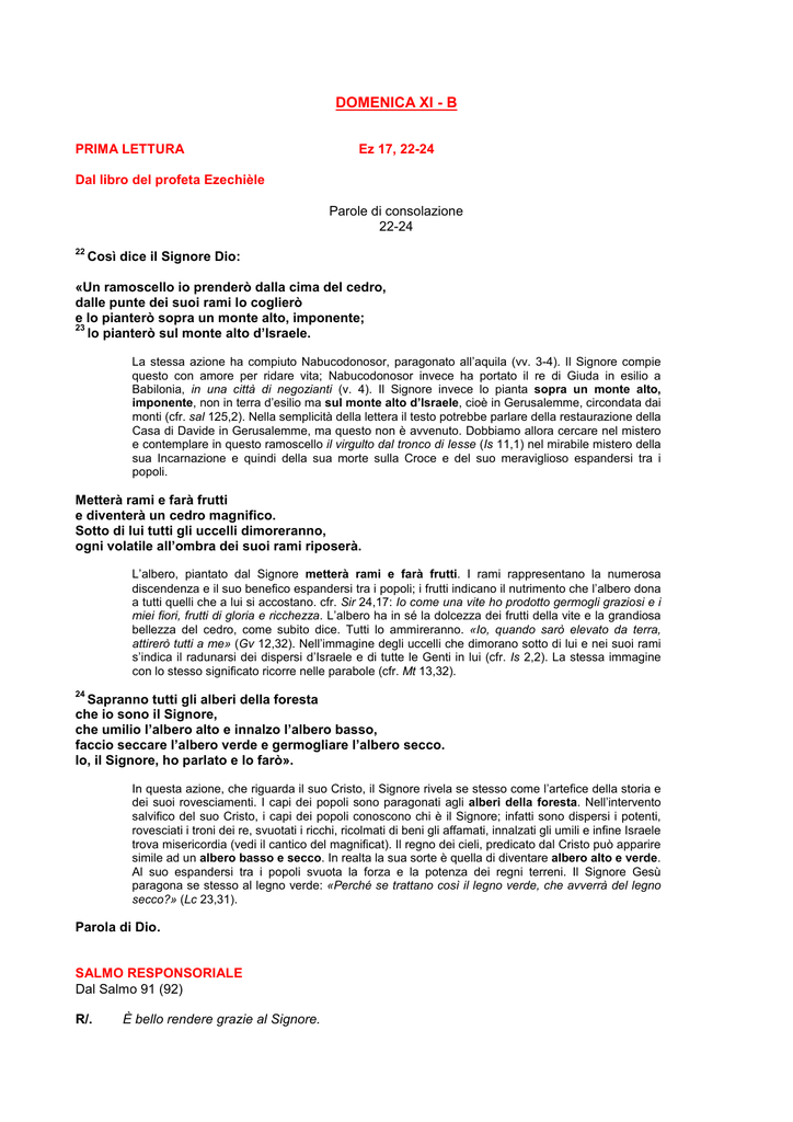 DOMENICA XI - B PRIMA LETTURA Ez 17, 22-24 Dal libro del profeta Ezechièle Parole di consolazione 22-24 22 Così dice il Signore Dio: «Un ramoscello io prenderò dalla cima del cedro, dalle punte dei suoi rami lo coglierò e lo pianterò sopra un monte alto, imponente; 23 lo pianterò sul monte alto d’Israele. La stessa azione ha compiuto Nabucodonosor, paragonato all’aquila (vv. 3-4). Il Signore compie questo con amore per ridare vita; Nabucodonosor invece ha portato il re di Giuda in esilio a Babilonia, in una città di negozianti (v. 4). Il Signore invece lo pianta sopra un monte alto, imponente, non in terra d’esilio ma sul monte alto d’Israele, cioè in Gerusalemme, circondata dai monti (cfr. sal 125,2). Nella semplicità della lettera il testo potrebbe parlare della restaurazione della Casa di Davide in Gerusalemme, ma questo non è avvenuto. Dobbiamo allora cercare nel mistero e contemplare in questo ramoscello il virgulto dal tronco di Iesse (Is 11,1) nel mirabile mistero della sua Incarnazione e quindi della sua morte sulla Croce e del suo meraviglioso espandersi tra i popoli. Metterà rami e farà frutti e diventerà un cedro magnifico. Sotto di lui tutti gli uccelli dimoreranno, ogni volatile all’ombra dei suoi rami riposerà. L’albero, piantato dal Signore metterà rami e farà frutti. I rami rappresentano la numerosa discendenza e il suo benefico espandersi tra i popoli; i frutti indicano il nutrimento che l’albero dona a tutti quelli che a lui si accostano. cfr. Sir 24,17: Io come una vite ho prodotto germogli graziosi e i miei fiori, frutti di gloria e ricchezza. L’albero ha in sé la dolcezza dei frutti della vite e la grandiosa bellezza del cedro, come subito dice. Tutti lo ammireranno. «Io, quando sarò elevato da terra, attirerò tutti a me» (Gv 12,32). Nell’immagine degli uccelli che dimorano sotto di lui e nei suoi rami s’indica il radunarsi dei dispersi d’Israele e di tutte le Genti in lui (cfr. Is 2,2). La stessa immagine con lo stesso significato ricorre nelle parabole (cfr. Mt 13,32). 24 Sapranno tutti gli alberi della foresta che io sono il Signore, che umilio l’albero alto e innalzo l’albero basso, faccio seccare l’albero verde e germogliare l’albero secco. Io, il Signore, ho parlato e lo farò». In questa azione, che riguarda il suo Cristo, il Signore rivela se stesso come l’artefice della storia e dei suoi rovesciamenti. I capi dei popoli sono paragonati agli alberi della foresta. Nell’intervento salvifico del suo Cristo, i capi dei popoli conoscono chi è il Signore; infatti sono dispersi i potenti, rovesciati i troni dei re, svuotati i ricchi, ricolmati di beni gli affamati, innalzati gli umili e infine Israele trova misericordia (vedi il cantico del magnificat). Il regno dei cieli, predicato dal Cristo può apparire simile ad un albero basso e secco. In realta la sua sorte è quella di diventare albero alto e verde. Al suo espandersi tra i popoli svuota la forza e la potenza dei regni terreni. Il Signore Gesù paragona se stesso al legno verde: «Perché se trattano così il legno verde, che avverrà del legno secco?» (Lc 23,31). Parola di Dio. SALMO RESPONSORIALE Dal Salmo 91 (92) R/. È bello rendere grazie al Signore. È bello rendere grazie al Signore e cantare al tuo nome, o Altissimo, annunciare al mattino il tuo amore, la tua fedeltà lungo la notte. R/. Il giusto fiorirà come palma, crescerà come cedro del Libano; piantati nella casa del Signore, fioriranno negli atri del nostro Dio. R/. Nella vecchiaia daranno ancora frutti, saranno verdi e rigogliosi, per annunciare quanto è retto il Signore, mia roccia: in lui non c’è malvagità. R/. SECONDA LETTURA 2Cor 5, 6-10 Sia abitando nel corpo sia andando in esilio, ci sforziamo di essere graditi al Signore. Dalla seconda lettera di san Paolo apostolo ai Corìnzi 6 Fratelli, sempre pieni di fiducia e sapendo che siamo in esilio lontano dal Signore finché abitiamo 7 8 nel corpo – camminiamo infatti nella fede e non nella visione –, siamo pieni di fiducia e preferiamo andare in esilio dal corpo e abitare presso il Signore. Sempre pieni di fiducia. «Con audacia e fiducia affrontiamo i pericoli e la morte per Cristo» (Teofilatto). Il principio della fiducia in noi è lo Spirito Santo, che, benché ancora dato come caparra, abita in noi e ci dà l’interiore certezza che tutto si compirà secondo il disegno di Dio. La nostra situazione attuale è quella di avere come nostra dimora il corpo. Questo è la nostra terra natale e la nostra casa. Dovunque noi andiamo, mediante il corpo, dichiariamo chi noi siamo e donde veniamo. Tuttavia il nostro abitare nel corpo ci fa essere in esilio lontano dal Signore. Duplice è la tensione, che s’instaura nel discepolo: quella naturale cioè di abitare nel corpo e quella immessa dallo Spirito Santo cioè di essere con il Signore. Prima di fare la sua scelta l’apostolo fa un inciso: camminiamo infatti nella fede e non nella visione. La fede è energia divina, che ci porta a conoscere i misteri divini ma non è ancora visione. Mediante la fede noi ancora non vediamo il Signore benché già abbiamo conoscenza di Lui secondo quanto c’insegna l’apostolo Pietro: voi lo amate, pur senza averlo visto; e ora senza vederlo credete in lui. Perciò esultate di gioia indicibile e gloriosa (1Pt 1,8). L’apostolo preferisce andare in esilio dal corpo e abitare presso il Signore. «Seguono i versetti sul desiderio della vita nuova che deve animarci. Finché siamo nel corpo siamo forestieri dal Cristo: e pensare che siamo legati al corpo! È vero che il corpo è destinato alla risurrezione, però c’è questa distanza dal Signore per cui per raggiungerlo bisogna esser spogliati di esso. Questo equilibria l’antropologia cristiana: è vero che il corpo è già santificato però finché siamo nel corpo siamo lontani dal Cristo. La terra è l’esilio, il corpo è ancora lontano ed estraneo al Signore malgrado Egli lo abbia santi