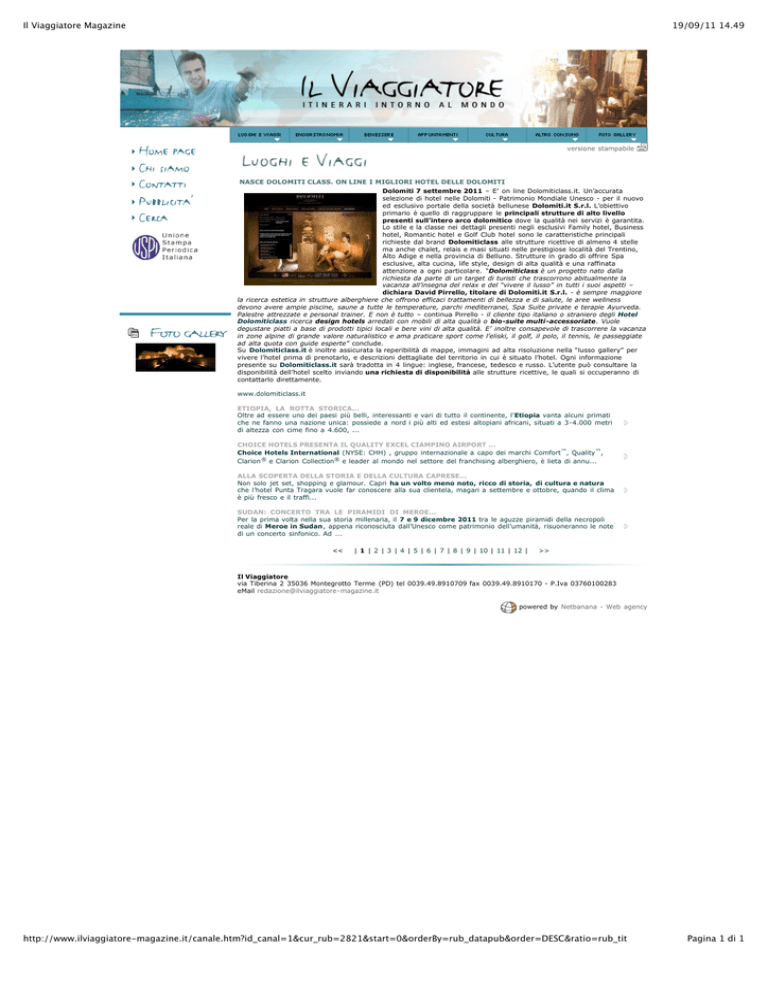Il Viaggiatore Magazine 19/09/11 14.49 versione stampabile NASCE DOLOMITI CLASS. ON LINE I MIGLIORI HOTEL DELLE DOLOMITI Dolomiti 7 settembre 2011 – E’ on line Dolomiticlass.it. Un’accurata selezione di hotel nelle Dolomiti - Patrimonio Mondiale Unesco - per il nuovo ed esclusivo portale della società bellunese Dolomiti.it S.r.l. L’obiettivo primario è quello di raggruppare le principali strutture di alto livello presenti sull’intero arco dolomitico dove la qualità nei servizi è garantita. Lo stile e la classe nei dettagli presenti negli esclusivi Family hotel, Business hotel, Romantic hotel e Golf Club hotel sono le caratteristiche principali richieste dal brand Dolomiticlass alle strutture ricettive di almeno 4 stelle ma anche chalet, relais e masi situati nelle prestigiose località del Trentino, Alto Adige e nella provincia di Belluno. Strutture in grado di offrire Spa esclusive, alta cucina, life style, design di alta qualità e una raffinata attenzione a ogni particolare. “Dolomiticlass è un progetto nato dalla richiesta da parte di un target di turisti che trascorrono abitualmente la vacanza all’insegna del relax e del “vivere il lusso” in tutti i suoi aspetti – dichiara David Pirrello, titolare di Dolomiti.it S.r.l. - è sempre maggiore la ricerca estetica in strutture alberghiere che offrono efficaci trattamenti di bellezza e di salute, le aree wellness devono avere ampie piscine, saune a tutte le temperature, parchi mediterranei, Spa Suite private e terapie Ayurveda. Palestre attrezzate e personal trainer. E non è tutto – continua Pirrello - il cliente tipo italiano o straniero degli Hotel Dolomiticlass ricerca design hotels arredati con mobili di alta qualità o bio-suite multi-accessoriate. Vuole degustare piatti a base di prodotti tipici locali e bere vini di alta qualità. E’ inoltre consapevole di trascorrere la vacanza in zone alpine di grande valore naturalistico e ama praticare sport come l’eliski, il golf, il polo, il tennis, le passeggiate ad alta quota con guide esperte” conclude. Su Dolomiticlass.it è inoltre assicurata la reperibilità di mappe, immagini ad alta risoluzione nella “lusso gallery” per vivere l’hotel prima di prenotarlo, e descrizioni dettagliate del territorio in cui è situato l’hotel. Ogni informazione presente su Dolomiticlass.it sarà tradotta in 4 lingue: inglese, francese, tedesco e russo. L’utente può consultare la disponibilità dell’hotel scelto inviando una richiesta di disponibilità alle strutture ricettive, le quali si occuperanno di contattarlo direttamente. www.dolomiticlass.it ETIOPIA, LA ROTTA STORICA... Oltre ad essere uno dei paesi più belli, interessanti e vari di tutto il continente, l’Etiopia vanta alcuni primati che ne fanno una nazione unica: possiede a nord i più alti ed estesi altopiani africani, situati a 3-4.000 metri di altezza con cime fino a 4.600, ... CHOICE HOTELS PRESENTA IL QUALITY EXCEL CIAMPINO AIRPORT ... Choice Hotels International (NYSE: CHH) , gruppo internazionale a capo dei marchi Comfort ™, Quality ™, Clarion ® e Clarion Collection® e leader al mondo nel settore del franchising alberghiero, è lieta di annu... ALLA SCOPERTA DELLA STORIA E DELLA CULTURA CAPRESE... Non solo jet set, shopping e glamour. Capri ha un volto meno noto, ricco di storia, di cultura e natura che l’hotel Punta Tragara vuole far conoscere alla sua clientela, magari a settembre e ottobre, quando il clima è più fresco e il traffi... SUDAN: CONCERTO TRA LE PIRAMIDI DI MEROE... Per la prima volta nella sua storia millenaria, il 7 e 9 dicembre 2011 tra le aguzze piramidi della necropoli reale di Meroe in Sudan, appena riconosciuta dall’Unesco come patrimonio dell’umanità, risuoneranno le note di un concerto sinfonico. Ad ... << | 1 | 2 | 3 | 4 | 5 | 6 | 7 | 8 | 9 | 10 | 11 | 12 | >> Il Viaggiatore via Tiberina 2 35036 Montegrotto Terme (PD) tel 0039.49.8910709 fax 0039.49.8910170 - P.Iva 03760100283 eMail [email protected] powered by Netbanana - Web agency http://www.ilviaggiatore-magazine.it/canale.htm?id_canal=1&cur_rub=2821&start=0&orderBy=rub_datapub&order=DESC&ratio=rub_tit Pagina 1 di 1