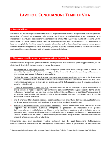 Commissione scientifica per la misurazione del benessere LAVORO E CONCILIAZIONE TEMPI DI VITA 1 1. Concetti di base Possedere un lavoro adeguatamente remunerato, ragionevolmente sicuro e rispondente alle competenze, costituisce un’aspirazione universale delle persone contribuendo in modo decisivo al loro benessere. Se la mancanza di una “buona occupazione” ha senza dubbio un impatto negativo sul livello di benessere, un impatto simile può avere una cattiva distribuzione degli impegni lavorativi che impedisca di conciliare tempi di lavoro e tempi di vita familiare e sociale. Le sotto-dimensioni e gli indicatori scelti per rappresentare questo dominio intendono rispondere a tale approccio e, quindi, illustrare il contributo che la condizione lavorativa può dare al benessere di una società sviluppata quale quella italiana. 2. Dimensioni considerate per la rappresentazione del dominio Muovendo dalla prospettiva quantitativa della partecipazione al lavoro fino a quella soggettiva della job satisfaction, il dominio è stato articolato in cinque dimensioni: 1. Partecipazione e inclusione sociale. Rileva l’aspetto quantitativo della partecipazione al lavoro. Ciò permette di presentare le situazioni a maggior rischio di povertà ed esclusione sociale, evidenziando la gravità socio-economica della scarsa occupazione. 2. Qualità del lavoro (stabilità, retribuzione, competenze e sicurezza nel lavoro). La seconda dimensione focalizza l’attenzione sulle caratteristiche dell’occupazione in termini di stabilità normativa e di fatto, retribuzione, competenze e sicurezza nel lavoro. La qualità dell’occupazione non è omogenea: ci sono i buoni e i cattivi lavori. 3. Conciliazione dei tempi di lavoro e di vita. Questa dimensione è volta a indagare la gestione dei tempi di lavoro e di vita in relazione agli impegni familiari. La compatibilità tra l’occupazione delle donne e la loro funzione riproduttiva è un obiettivo cruciale delle politiche del lavoro. La qualità dell’occupazione di un paese si misura anche sulla possibilità che le donne con figli riescano a conciliare i lavori di cura familiare con il lavoro retribuito. 4. Vita di impresa. Rileva la partecipazione sociale dei lavoratori alle attività dell’impresa, quale elemento sia di un maggior benessere individuale sia di una migliore produttività del lavoro. 5. Insicurezza dell’occupazione e soddisfazione del lavoro. L’ultima dimensione vuole cogliere gli aspetti soggettivi del benessere lavorativo, indagando la percezione di insicurezza nella perdita dell’occupazione e la soddisfazione per il lavoro. Molti studi hanno adottato la job satisfaction come ragionevole proxy per stimare la complessiva qualità del lavoro percepita dai lavoratori. Secondo questi studi la soddisfazione del lavoro risulta un buon predittore dei comportamenti dei lavoratori: dalle dimissioni, all’assenteismo, alla produttività. Inizialmente sono stati selezionati ventitré indicatori, due dei quali (percezione dell’insicurezza dell’occupazione e soddisfazione del lavoro) come risultato della sintesi di più variabili. Gli indicatori sono 1 Hanno contribuito alla stesura del rapporto: Saverio Gazzelloni, Federica Pintaldi, Emilio Reyneri, Ugo Trivellato. Commissione scientifica per la misurazione del benessere successivamente stati distinti in quindici core e otto addizionali. Da tener presente che quattro indicatori core (tasso di copertura dell’indennità di disoccupazione, contrattazione integrativa, presenza delle RSU, e percezione dell’insicurezza dell’occupazione) non sono attualmente disponibili e un altro indicatore core (soddisfazione del lavoro) è solo parzialmente ricostruibile e con cadenza quinquennale. La scelta degli indicatori è stata fatta tenendo conto delle proposte contenute nei diversi documenti Oecd, Eurostat, Unece e Ilo sulla qualità del lavoro e della vita, anche al fine di consentire un buon livello di comparabilità internazionale. Tuttavia, va sottolineato che, ove possibile, si sono preferiti indicatori in grado di cogliere meglio le criticità peculiari del mondo del lavoro italiano, quali, ad esempio, l’ampia presenza di persone con una ricerca del lavoro non attiva, la scarsa occupazione femminile, giovanile e anziana, il peculiare ruolo della famiglia nella composizione dell’occupazione, la diffusione di situazioni occupazionali instabili, il crescente fenomeno della sovra-istruzione dei giovani e le difficoltà di conciliare i tempi di lavoro e di vita per le donne. Infine, seguendo le indicazioni internazionali, si propone di indagare anche la percezione soggettiva che i lavoratori hanno delle proprie condizioni di lavoro, con particolare attenzione al rischio di perdere e di non ritrovare un’occupazione. Poiché questa sotto-dimensione non è rilevata da alcuna indagine ricorrente in Italia, si tratterà di inserire un’apposita batteria di domande nella rilevazione sulle forze di lavoro. Quanto alla disaggregazione degli indicatori per misurare l’equità, poiché la quasi totalità degli indicatori è frutto di dati individuali raccolti con surveys, i criteri sono quelli classici proposti nei documenti Eurostat e Oecd: genere, età, cittadinanza, livello di istruzione (da intendere anche come proxy dello status sociale) e ruolo in famiglia. Inoltre, per le peculiarità italiane, è sempre prevista una disaggregazione regionale (che, però, non può essere sempre incrociata con gli altri criteri per ragioni di economicità di lettura e di problemi del campione). 3. Indicatori prescelti Di seguito si riporta l’elenco degli indicatori selezionati. In appendice le schede presentano in modo dettagliato gli obiettivi che i singoli indicatori intendono perseguire, come sono stati costruiti, le fonti, i criteri di disaggregazione e gli eventuali problemi interpretativi o operativi. 1. Tasso di occupazione 20-64 anni: Occupati 20-64 anni / Popolazione 20-64 anni *100. Il tradizional