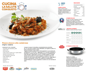 PRINCIPI NUTRITIVI na orzione orni ce IL PARERE DEL DIETISTA Piatto di discreto valore energetico, ad elevato contenuto di proteine animali di alto valore biologico e grassi di buona qualità e con basso contenuto di colesterolo. ner ia 363 Kcal ar oidrati totali 29 g di c i e lici 3g ra i 12 g di c i at ri 2g Proteine 35 g di c i ani ali 31 g i ra 3g 75 mg ole terolo IL COMMENTO DELLO CHEF Se non si ha modo di preparare il brodo vegetale, si può usare solo l’acqua. Consigliamo di saggiare con le dita le carni dello stoccafisso per verificare se sono presenti ancora lische. A seconda del gusto personale è possibile sostituire la cipolla con g 100 di porro. L INDICATORE DI SOSTENI ILIT a ata l calcolo del ar on oot rint. Eccellente Ottimo Buono Sufficiente Scarso Pesce stocco alla calabrese Origine: Calabria P 4P • stoccafisso (già ammollato) g 600 • patate g 600 • olive nere g 60 • cipolla rossa di Tropea g 70 (1 cipolla media) • passata di pomodoro g 100 • olio extravergine d’oliva g 20 • brodo vegetale g 80 • basilico q.b. • prezzemolo q.b. • sale q.b. LO STRUMENTO DI COTTURA DI OGGI Lessare in acqua lo stoccafisso, precedentemente ammollato, per 15- 20 minuti, scolarlo e farlo raffreddare, poi togliere la pelle e le lische rompendo le carni in pezzi. Tagliare la cipolla a julienne fine e farla appassire in una casseruola antiaderente in un filo d’olio. Aggiungere 3 o 4 cucchiai di passata di pomodoro e cuocere solo per 10 minuti perchè è un ingrediente già cotto all'origine. Aggiungere lo stocco, le patate tagliate a rondelle spesse circa mezzo cm, il brodo vegetale, un pizzico di sale e far cuocere fino alla cottura delle patate. Togliere dal fuoco, aggiungere il basilico, il prezzemolo, le olive e far insaporire la preparazione incoperchiata per 10 minuti. Impiattare e condire con una macinata di pepe. • pepe nero q.b. Partner dell'iniziativa Partner tecnico Tegame con maniglie Produzione attuale Ballarini Le tecnologie di stampaggio di ultima generazione sono eseguite con presse ad altissimo tonnellaggio, che consentono di profilare i corpi degli utensili facendo scorrere l’alluminio dove è più necessario. Si ottengono così fondi ad altissimo spessore per una perfetta planarità, che garantisce un’ottimale conduzione del calore.