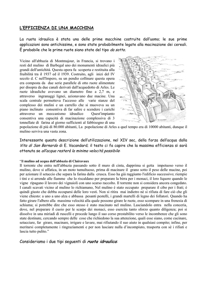 L’EFFICIENZA DI UNA MACCHINA La ruota idraulica è stata una delle prime macchine costruite dall’uomo; le sue prime applicazioni sono antichissime, e sono state probabilmente legate alla macinazione dei cereali. È probabile che le prime ruote siano state del tipo da sotto. Vicino all′abbazia di Montmajour, in Francia, si trovano i resti del mulino di Barbegal uno dei monumenti idraulici più grandi dell′antichità. Questa opera fu scoperta e restituita alla fruibilità tra il 1937 ed il 1939. Costruito, agli inizi del IV secolo d. C nell'Impero, su un pendio collinare questa opera era composta da due serie parallele di otto ruote alimentate per disopra da due canali derivati dall′acquedotto di Arles. Le ruote idrauliche avevano un diametro fino a 2,7 m, e attraverso ingranaggi lignei, azionavano due macine. Una scala centrale permetteva l′accesso alle varie stanze del complesso dei mulini e un carrello che si muoveva su un piano inclinato consentiva di far salire e scendere i carichi attraverso un meccanismo idraulico Quest′impianto consentiva una capacità di macinazione complessiva di 3 tonnellate di farina al giorno sufficienti al fabbisogno di una popolazione di più di 80.000 abitanti, La popolazione di Arles a quel tempo era di 10000 abitanti, dunque il mulino serviva una vasta zona. Interessante questa descrizione dell’utilizzazione, nel XIV sec, della forza dell’acqua dalla Vita di San Bernardo di E. Vacandard; il testo ci fa capire che la massima efficienza si sarà ottenuta se all’acqua resterà la minima velocità possibile: “Il mulino ad acqua dell′abbazia di Clairavaux Il torrente che entra nell′abbazia passando sotto il muro di cinta, dapprima si getta impetuoso verso il mulino, dove si affatica, in un moto tumultuoso, prima di macinare il grano sotto il peso delle macine, poi per azionare il setaccio che separa la farina dalla crusca. Esso ha già raggiunto l′edificio successivo; riempie i tini e si arrende alle fiamme che lo riscaldano per preparare la birra per i monaci, il loro liquore quando le vigne ripagano il lavoro dei vignaioli con uno scarso raccolto. Il torrente non si considera ancora congedato. I canali scavati vicino al mulino lo richiamano, Nel mulino è stato occupato preparare il cibo per i frati; è quindi giusto che debba occuparsi delle loro vesti. Non si ritira mai indietro né si rifiuta di fare ciò che gli viene chiesto: a uno a uno alza e abbassa pesanti pestelli, i grandi martelli di legno dei follatori. Quando ha fatto girare l′albero alla massima velocità alla quale possono girare le ruote, esso scompare in una frenesia di schiuma; si potrebbe dire che esso stesso è stato macinato nel mulino. Lasciandolo entra nella conceria, dove, nel preparare il cuoio per le scarpe dei monaci, esso esercita tanto sforzo quanto diligenza; poi si dissolve in una miriadi di ruscelli e procede lungo il suo corso prestabilito verso le incombenze che gli sono state destinate, cercando sempre delle cose che richiedono la sua attenzione, quali esse siano, come cucinare, setacciare, far girare, macinare, irrigare e lavare, mai rifiutando il suo aiuto in qualsiasi compito; infine, per meritarsi completamente i ringraziamenti e per non lasciare nulla d’incompiuto, trasporta con sé i rifiuti e lascia tutto pulito.” Consideriamo i due tipi seguenti di ruota idraulica: Le ruote idrauliche erano conosciute e utilizzate da millenni ma la loro costruzione seguiva principalmente criteri empirici. Per esempio non era mai stata studiata in modo sistematico l'efficienza delle ruote idrauliche che potevano essere azionate dal flusso dell'acqua che scorre sotto le pale o sopra di esse. La ruota per di sotto (o ruota a impatto): la ruota idraulica aveva, all’estremità, delle palette che l’acqua urtava quando queste si trovavano, durante la rotazione, nella zona più bassa della ruota stessa, che era, così, investita dalla corrente; la ruota per di sopra (o ‘a gravità’): la ruota al posto delle palette era dotata di contenitori, detti cassette, che ricevevano il getto d’acqua, che così li riempiva, quando si trovavano al punto più alto della rotazione, per poi scaricarsi quando giungevano in prossimità del punto opposto. Del primo tipo, per di sotto, abbiamo una prova diretta della sua esistenza in tempi remoti (negli scavi di Pompei 79d.C. è stata trovata l’impronta di una ruota di mulino per di sotto). Si hanno elementi per ritenere che comunque la ruota alimentato per di sopra sia comparso alcuni secoli dopo quello per di sotto, costituendone una variante migliorata perché in grado di assicurare, secondo l’esperienza, un maggior rendimento. Il per di sopra però aveva un limite territoriale: si doveva portare l’acqua all’altezza della ruota, utilizzando un canale di alimentazione; per i mulini per di sotto, invece, il dislivello necessario era minimo ed essi potevano essere realizzati ovunque vi fosse acqua disponibile e corrente, anche in pianura. A proposito della loro efficienza così si esprimeva Smeaton nel 1759 in un articolo pubblicato su Philosophical Transactions: “Ragionando in astratto si potrebbe essere portati a immaginare che comunque diverso sia il modo di applicazione, tuttavia ogni volta che la stessa quantità discende perpendicolarmente attraverso lo stesso spazio la potenza effettiva naturale sarebbe uguale, supponendo il macchinario privo d’attrito […] Si sarebbe portati a supporre che un pollice cubo d’acqua, lasciato cadere per lo spazio di 30 pollici e incidente là su un altro corpo sarebbe capace di produrre un uguale effetto per collisione, come se lo stesso pollice cubo fosse disceso attraverso lo spazio con un moto più lento e avesse prodotto i suoi effetti gradualmente, perché in entrambi i casi la gravità agisce su un uguale quantità di materia, attraverso uno spazio uguale; e conseguentemente che qualunque sia il rapporto tra la potenza e l’effetto nelle ruote azionate da 