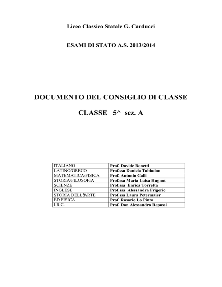 Liceo Classico Statale G. Carducci ESAMI DI STATO A.S. 2013/2014 DOCUMENTO DEL CONSIGLIO DI CLASSE CLASSE 5^ sez. A ITALIANO LATINO/GRECO MATEMATICA/FISICA STORIA/FILOSOFIA SCIENZE INGLESE STORIA DELL’ARTE ED.FISICA I.R.C. Prof. Davide Bonetti Prof.ssa Daniela Tabiadon Prof. Antonio Galli Prof.ssa Maria Luisa Hugnot Prof.ssa Enrica Torretta Prof.ssa Alessandra Frigerio Prof.ssa Laura Petermaier Prof. Rosario Lo Pinto Prof. Don Alessandro Repossi SITUAZIONE DELLA CLASSE Numero, descrizione, difficoltà incontrate, comportamento. La classe V A risulta composta di 27 studenti, 26 provenienti dalla IV A e 1 proveniente da altro liceo. La maggioranza degli studenti ha seguito con attenzione e interesse il lavoro comune, ha partecipato in modo attivo e costruttivo al dialogo educativo ed ha affrontato con serietà l’impegno nello studio personale, spesso sorretta in ciò da seria motivazione. Il rendimento dei singoli risulta differenziato in relazione alle diverse capacità e attitudini: alcuni studenti sono giunti a consolidare ed affinare le capacità di analisi e rielaborazione critica dei contenuti, altri, nonostante il persistere di qualche incertezza nella traduzione dei testi classici, hanno comunque acquisito una preparazione complessivamente valida grazie all’impegno nella preparazione delle prove orali. Il livello di preparazione della classe, pertanto, pur differenziato al suo interno, è mediamente più che discreto. La frequenza è stata per tutti regolare, il comportamento tra gli studenti e con i docenti è stato rispettoso e collaborativo. Va tuttavia osservato che la collocazione in corso d’anno dei test per l’ammissione alle facoltà universitarie ha interferito in modo sensibile sui ritmi di lavoro della classe ed ha condizionato, in alcuni casi, il rendimento degli studenti. Va inoltre segnalato l’impegno attivo e la partecipazione costruttiva di alcuni studenti della classe alla vita dell’Istituto: dagli organi collegiali al laboratorio teatrale ed al sostegno pomeridiano allo studio. Recupero - IDEI - Sportelli attuati Su delibera del Collegio dei Docenti, nella settimana dal 7 al 13 gennaio 2014, sospeso il regolare svolgimento dei programmi in tutte le discipline, si è dato spazio ad attività specifiche di recupero, sostegno e approfondimento. Ulteriori attività di recupero in orario curricolare, avviate autonomamente dai singoli docenti, hanno avuto le seguenti modalità: · · · Attività di recupero autonomo delegato al singolo allievo Attività di sostegno con interventi di vario tipo in preparazione alle verifiche curricolari Attività gestite dall’insegnante in modo articolato durante l’orario curricolare Nel corso del secondo quadrimestre, inoltre, è stato attivato uno sportello pomeridiano di matematica per favorire il percorso di recupero delle carenze evidenziatesi nel corso del primo quadrimestre. . 2 Iniziative –attività attuate Attività svolte in orario curricolare: La classe ha partecipato nel corso dell’anno ai seguenti progetti tra quelli proposti dal Piano dell'Offerta Formativa di Istituto in orario curricolare: · La (ri)scoperta dell’antico – VI incontro di studio in ricordo del Prof. Zambarbieri : O megas Alexandros – Come si costruisce un mito · Progetto di storia sul Novecento: percorsi interdisciplinari per una formazione giuridica ed economica sull’Unione europea - I problemi attuali dell’istituzione europea: il Trattato di Lisbona - La politica economica europea di fronte alla crisi attuale I due temi sono stati svolti rispettivamente dal prof. A. Perrone dell’Università Cattolica e dal prof. M. Noera dell’Università Bocconi. · Conferenza sul bosone di Higgs · Educazione alla salute: Primo soccorso Attività svolte in orario extracurricolare: Alcuni studenti hanno partecipato ai seguenti progetti: · Aiuto allo studio per gli studenti del biennio · Laboratorio teatrale · Corsi in preparazione ai test di ingresso per le facoltà scientifiche · corso di preparazione al First Certificate Uscite didattiche e viaggi di istruzione La classe ha partecipato ad un’uscita didattica per visitare la mostra su Andy Warhol La classe ha effettuato un viaggio di istruzione a Trieste dal 18 al 20 marzo. Attività sportive La classe ha partecipato, nell’ambito della programmazione di Educazione fisica, alle seguenti attività in orario curricolare: - Corsa campestre - Trofeo Langé - Trofeo Perrone di Calcio a 5 - Gare d’Istituto: pallavolo e pallacanestro - gare di sci Alcuni studenti hanno partecipato in orario extracurricolare alle attività sportive proposte dal CENTRO SPORTIVO SCOLASTICO: Potenziamento muscolare con le macchine. Orientamento Per favorire la maturazione di una scelta consapevole del percorso universitario e lavorativo da parte degli studenti, la scuola ha attuato nel corso dell’anno una serie di iniziative di carattere informativo e specificamente orientativo: · Attività di orientamento Scegliere informati, tre incontri, Università di Trento · Simulazione di test di ingresso alle facoltà universitarie realizzata a cura della Hoepli · Incontro con studenti universitari ex carducciani · Informazioni sulle iniziative di orientamento organizzate dai vari Atenei 3 STORIA DELLA CLASSE (triennio) Nell’anno scolastico 2011/2012 la classe era formata da 28 alunni, 19 provenienti dalla II F, 8 provenienti dalla II A, uno, ripetente, dalla III F. Al termine dell’anno scolastico, uno studente non è stato ammesso alla classe quarta. Dopo le prove di settembre uno studente, ammesso alla classe quarta, ha chiesto il nulla osta al trasferimento in altro istituto. Nell’anno scolastico 2012/13, pertanto, la classe risultava composta da 26 studenti. All’inizio del corrente anno scolastico è stata inserita nella classe una studentessa proveniente da altro liceo e la classe risulta così composta da 27 studenti. CONTINUITA’ DIDATTICA NEL TRIENNIO MATERIA A. S. 2011/2012 A. S. 2012/201