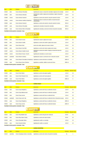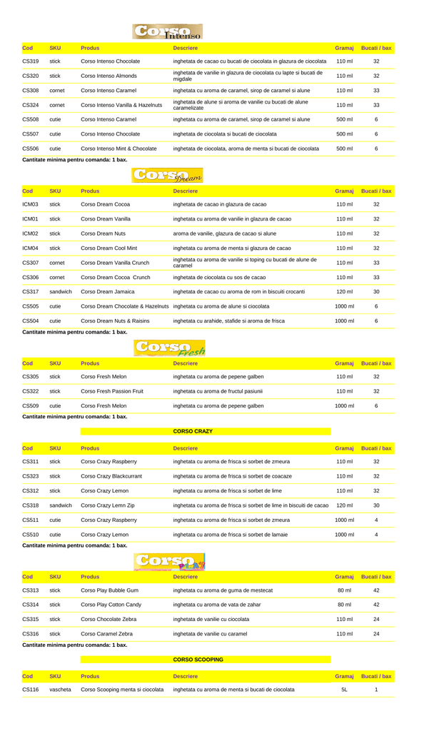 Cod SKU Produs Descriere Gramaj Bucati / bax CS319 stick Corso Intenso Chocolate inghetata de cacao cu bucati de ciocolata in glazura de ciocolata 110 ml 32 CS320 stick Corso Intenso Almonds inghetata de vanilie in glazura de ciocolata cu lapte si bucati de migdale 110 ml 32 CS308 cornet Corso Intenso Caramel inghetata cu aroma de caramel, sirop de caramel si alune 110 ml 33 CS324 cornet Corso Intenso Vanilla & Hazelnuts inghetata de alune si aroma de vanilie cu bucati de alune caramelizate 110 ml 33 CS508 cutie Corso Intenso Caramel inghetata cu aroma de caramel, sirop de caramel si alune 500 ml 6 CS507 cutie Corso Intenso Chocolate inghetata de ciocolata si bucati de ciocolata 500 ml 6 CS506 cutie Corso Intenso Mint & Chocolate inghetata de ciocolata, aroma de menta si bucati de ciocolata 500 ml 6 Cantitate minima pentru comanda: 1 bax. Cod SKU Produs Descriere Gramaj Bucati / bax ICM03 stick Corso Dream Cocoa inghetata de cacao in glazura de cacao 110 ml 32 ICM01 stick Corso Dream Vanilla inghetata cu aroma de vanilie in glazura de cacao 110 ml 32 ICM02 stick Corso Dream Nuts aroma de vanilie, glazura de cacao si alune 110 ml 32 ICM04 stick Corso Dream Cool Mint inghetata cu aroma de menta si glazura de cacao 110 ml 32 CS307 cornet Corso Dream Vanilla Crunch inghetata cu aroma de vanilie si toping cu bucati de alune de caramel 110 ml 33 CS306 cornet Corso Dream Cocoa Crunch inghetata de ciocolata cu sos de cacao 110 ml 33 CS317 sandwich Corso Dream Jamaica inghetata de cacao cu aroma de rom in biscuiti crocanti 120 ml 30 CS505 cutie Corso Dream Chocolate & Hazelnuts inghetata cu aroma de alune si ciocolata 1000 ml 6 CS504 cutie Corso Dream Nuts & Raisins inghetata cu arahide, stafide si aroma de frisca 1000 ml 6 Cantitate minima pentru comanda: 1 bax. Cod SKU Produs Descriere Gramaj Bucati / bax CS305 stick Corso Fresh Melon inghetata cu aroma de pepene galben 110 ml 32 CS322 stick Corso Fresh Passion Fruit inghetata cu aroma de fructul pasiunii 110 ml 32 CS509 cutie Corso Fresh Melon inghetata cu aroma de pepene galben 1000 ml 6 Cantitate minima pentru comanda: 1 bax. CORSO CRAZY Cod SKU Produs Descriere Gramaj Bucati / bax CS311 stick Corso Crazy Raspberry inghetata cu aroma de frisca si sorbet de zmeura 110 ml 32 CS323 stick Corso Crazy Blackcurrant inghetata cu aroma de frisca si sorbet de coacaze 110 ml 32 CS312 stick Corso Crazy Lemon inghetata cu aroma de frisca si sorbet de lime 110 ml 32 CS318 sandwich Corso Crazy Lemn Zip inghetata cu aroma de frisca si sorbet de lime in biscuiti de cacao 120 ml 30 CS511 cutie Corso Crazy Raspberry inghetata cu aroma de frisca si sorbet de zmeura 1000 ml 4 CS510 cutie Corso Crazy Lemon inghetata cu aroma de frisca si sorbet de lamaie 1000 ml 4 Gramaj Bucati / bax Cantitate minima pentru comanda: 1 bax. Cod SKU Produs Descriere CS313 stick Corso Play Bubble Gum inghetata cu aroma de guma de mestecat 80 ml 42 CS314 stick Corso Play Cotton Candy inghetata cu aroma de vata de zahar 80 ml 42 CS315 stick Corso Chocolate Zebra inghetata de vanilie cu ciocolata 110 ml 24 CS316 stick Corso Caramel Zebra inghetata de vanilie cu caramel 110 ml 24 Gramaj Bucati / bax 5L 1 Cantitate minima pentru comanda: 1 bax. CORSO SCOOPING Cod SKU Produs Descriere CS116 vascheta Corso Scooping menta si ciocolata inghetata cu aroma de menta si bucati de ciocolata CS105 vascheta Corso Scooping tiramisu inghetata cu aroma de tiramisu cu sos de cacao 5L 1 CS101 vascheta Corso Scooping vanilie inghetata de vanilie 5L 1 CS106 vascheta Corso Scooping fistic inghetata de fistic 5L 1 CS109 vascheta Corso Scooping nuci si stafide inghetata cu aroma de vanilie cu stafide, arahide si nuci 5L 1 CS113 vascheta Corso Scooping bubble gum inghetata cu aroma de guma de mestecat 5L 1 CS110 vascheta Corso Scooping zmeura inghetata de zmeura 5L 1 CS102 vascheta Corso Scooping ciocolata inghetata de ciocolata cu bucati de ciocolata 8% 5L 1 CS117 vascheta Corso Scooping caramel inghetata cu aroma de caramel si sos de caramel 5L 1 CS104 vascheta Corso Scooping capuccino inghetata de cappuccino 5L 1 CS103 vascheta Corso Scooping capsuni inghetata de capsuni 5L 1 CS115 vascheta Corso Scooping pepene galben inghetata de pepene galben 5L 1 CS112 vascheta Corso Scooping apple pie inghetata cu aroma de placinta de mere, sorbet de mere si sirop de mar si scortisoara 5L 1 CS114 vascheta Corso Scooping fructe de padure inghetata cu fructe de padure 5L 1 CS201 vascheta Corso Scooping sorbet zmeura sorbet de zmeura 5L 1 CS111 vascheta Corso Scooping sorbet lamaie sorbet de lamaie 5L 1 CS108 vascheta Corso Scooping malaga inghetata malaga cu stafide 5L 1 CS203 vascheta Corso Scooping vanilie si sorbet de zmeura inghetata cu aroma de vanilie si sorbet de zmeura 5L 1 CS204 vascheta Corso Scooping sorbet capsuni sorbet de capsuni 5L 1 CS205 vascheta Corso Scooping sorbet portocale rosii sorbet de portocale rosii si portocale 5L 1 CS206 vascheta Corso Scooping sorbet mango si fructul pasiunii sorbet de mango si fructul pasiunii 5L 1 CS207 vascheta Corso Scooping sorbet mere si capsuni sorbet de mere si capsuni 5L 1 inghetata cu aroma de vanilie si sorbet de coacaze negre 5L 1 Corso Scooping vanilie si sorbet de coacaze Cantitate minima pentru comanda: 1 bax. CS208 vascheta