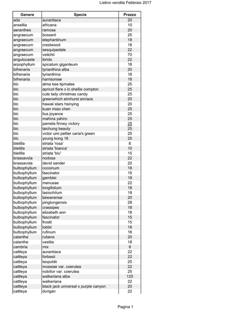 Listino vendita Febbraio 2017 Genere ada ansellia aeranthes angraecum angraecum angraecum angraecum angraecum angulocaste arpophyllum bifrenaria bifrenaria bifrenaria blc blc blc blc blc blc blc blc blc blc blc blc bletilla bletilla bletilla brassavola brassavola bulbophyllum bulbophyllum bulbophyllum bulbophyllum bulbophyllum bulbophyllum bulbophyllum bulbophyllum bulbophyllum bulbophyllum bulbophyllum bulbophyllum bulbophyllum bulbophyllum calanthe calanthe cambria cattleya cattleya cattleya cattleya cattleya cattleya cattleya cattleya cattleya Specie aurantiaca africana ramosa bosserii elephantinum crestwood sesquipedale veitchii ibrido spicatum giganteum tyrianthina alba tyrianthina harrisoniae alma kee tipmalee apricot flare x lc shellie compton cute lady christmas candy greenwhich elmhurst am/aos hawaii stars hsinying kuan miao chen lius joyance mahina yahiro pamela finney victory taichung beauty victor umi peltier caria's green young kong 16 striata 'rosa' striata 'bianca' striata 'blu' nodosa david sander cocoinum fascinator gamblei menusae longifolium lasiochilum taiwanense pingtungensis crassipes elizabeth ann fascinator frostii lobbii rufinum rubens vestita mix aurantiaca forbesii leopoldii mossiae var. coerulea nobilior var. coerulea walkeriana alba walkeriana black jack universal x purple canyon durigan Prezzo 20 10 20 25 18 18 22 70 22 18 20 18 18 25 25 25 25 20 25 25 25 25 25 25 25 8 10 15 22 20 18 15 18 22 18 18 20 28 18 18 15 15 18 18 20 18 8 22 22 25 22 25 120 22 20 22 Pagina 1 Listino vendita Febbraio 2017 cattleya cattleya cattleya cattleya cattleya cattleya cattleya cattleya cattleya laelia cattleya cattleya cattleya caucaea cirrea cochleanthes cochleanthes coelogyne coelogyne coelogyne coelogyne cymbidium cymbidium cymbidium cymbidium cymbidium cymbidium dendrobium dendrobium dendrobium dendrobium dendrobium dendrobium dendrobium dendrobium dendrobium dendrobium dendrobium dendrobium dendrobium dendrobium dendrobium dendrobium dendrobium dendrobium dendrobium dendrobium dendrobium dendrobium dendrochilum dendrochilum dendrochilum dracula dracula encyclia encyclia encyclia encyclia harrisoniae x walkeriana intermedia intermedia orlata intermedia x gigas loddigesii x durigan lueddemanniana lueddemanniana coerulea maxima mendelii purpurata ubatuba schilleriana x schomburgkia splendida trianae pincelada trianae coerulea nubigena saccata discolor ibrida cristata fimbriata flaccida graminifolia ensifolium bao dao xian nu ensifolium chi xian nu mastersii ensifolium jin chi ensifolium jin he ensifolium shi chang hong adae aggregatum amethystoglossum burana's delight chrysotoxum farmeri farmeri x griffithianum miyakei pachyphyllum pierardii tortile atroviolaceum x alexandre berry oda ekapol mutation enobi purple splash fimbriatum kingianum lake land nobile loddigesii pierardii x loddigesii speciosum compactum cobbianum glumaceum spp kimera levii boothiana bractescens alata maculosa 18 18 20 20 22 18 22 22 15 22 18 25 25 22 18 20 25 18 15 15 18 28 28 30 28 28 28 22 22 25 25 20 25 25 15 22 15 / 28 18 18 12 20 20 12 8 / 20 15 18 10 12 22 19 19 18 28 28 18 20 22 12 / 22 Pagina 2 Listino vendita Febbraio 2017 encyclia encyclia encyclia epidendrum epidendrum epidendrum epidendrum epidendrum epidendrum epidendrum galeandra gomeza gomeza habenaria haraella kefersteinia kingidium laelia laelia laelia laelia laelia laelia laelia laelia laelia laelia laelia laelia laelia laelia laelia lc lc lc lc lc lc lc lepanthes lepanthes liparis lockhartia lycaste lycaste lycaste lycaste macradenia masdevallia masdevallia masdevallia masdevallia masdevallia masdevallia masdevallia masdevallia masdevallia masdevallia oncidioides prismatocarpa profusa floribundum ruju magic porpax pseudepidendrum capricornae ibaguense spp ecuador spp recurva spp radiata retrocalla pulchella deleciosa anceps sanderiana anceps tipo anceps var. semi-alba briegeri crispa crispata lobata alba praestans presidentensis purpurata purpurata alba purpurata açodocrente purpurata carnea purpurata var. schusteriana tenebrosa chyong gussuon hillares hope dinard blue heaven hsinying pub albo sanguinea purple cascade fragrant beauty hcc/aos supersonic striking lip bm/joga tristar bouquet sanguinea auriculata viridiflora oerstedii aromatica auburn ibrida juanito cordero rubescens amabilis v1 amabilis v2 carruthersiana constricta guttulata hochilus hystrix ignea impostor measuresiana 18 / 22 12 / 25 25 22 12 18 20 22 15 18 20 18 18 8 15 15 18 22 18 25 18 12 18 25 22 20 22 22 30 25 38 20 18 18 25 20 20 20 25 18 20 15 18 25 22 22 22 22 15 15 15 15 15 15 15 15 15 15 Pagina 3 Listino vendita Febbraio 2017 masdevallia norops masdevallia pyxis masdevallia rigens masdevallia spp a1 masdevallia spp mix masdevallia vin rouge maxillaria variabilis maxillaria densa maxillaria porrecta maxillaria schunkeana maxillaria tenuifolia neofinetia falcata neofinetia falcata shutenno oeoniella polystachys oncidium noezlianum oncidium portilloides oncidium pumilum oncidium flexuosum oncidium mieke oncidium sharry baby oncidium sweet sugar ornithocephalus grandiflorus paphiopedilum henryanum paphiopedilum primulinum var. purpurescens paphiopedilum sunshine glory x ang-thong alba paphiopedilum gratrixianum paphiopedilum wardii paphiopedilum wellesleyanum x leucochilum paphiopedilum wenshanense paphiopedilum appletonianum paphiopedilum armeniacum paphiopedilum charlesworthii paphiopedilum delenatii paphiopedilum emersonii var. huonglanae paphiopedilum esquirolei paphiopedilum hangianum paphiopedilum hangianum x armeniacum paphiopedilum helenae paphiopedilum hirsutissimum paphiopedilum hung sheng moon paphiopedilum ibridi mix paphiopedilum insigne paphiopedilum jackii paphiopedilum malipoense paphiopedilum micranthum paphiopedilum spicerianum paphiopedilum tranlienianum paphiopedilum van gogh paphiopedilum villosum var. laichauense paphiopedilum wellesleyanum phalaenopsis amabilis silver leaf phalaenopsis aphrodite phalaenopsis gigantea phalaenopsis lobbii ph