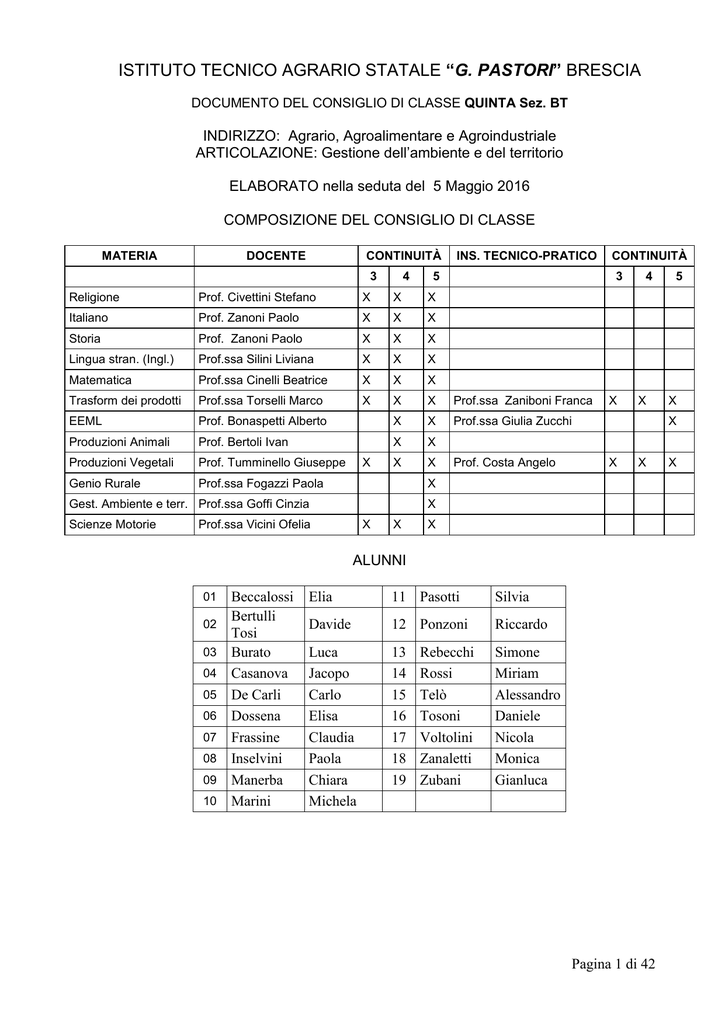 ISTITUTO TECNICO AGRARIO STATALE “G. PASTORI” BRESCIA DOCUMENTO DEL CONSIGLIO DI CLASSE QUINTA Sez. BT INDIRIZZO: Agrario, Agroalimentare e Agroindustriale ARTICOLAZIONE: Gestione dell’ambiente e del territorio ELABORATO nella seduta del 5 Maggio 2016 COMPOSIZIONE DEL CONSIGLIO DI CLASSE MATERIA DOCENTE CONTINUITÀ 3 4 INS. TECNICO-PRATICO 5 3 Religione Prof. Civettini Stefano X X X Italiano Prof. Zanoni Paolo X X X Storia Prof. Zanoni Paolo X X X Lingua stran. (Ingl.) Prof.ssa Silini Liviana X X X Matematica Prof.ssa Cinelli Beatrice X X X Trasform dei prodotti Prof.ssa Torselli Marco X X X Prof.ssa Zaniboni Franca EEML Prof. Bonaspetti Alberto X X Prof.ssa Giulia Zucchi Produzioni Animali Prof. Bertoli Ivan X X Produzioni Vegetali Prof. Tumminello Giuseppe X X Genio Rurale Prof.ssa Fogazzi Paola X Prof. Costa Angelo X 4 X X X X Prof.ssa Vicini Ofelia X X X ALUNNI 01 02 03 04 05 06 07 08 09 10 Beccalossi Bertulli Tosi Burato Casanova De Carli Dossena Frassine Inselvini Manerba Marini Elia 11 Pasotti Silvia Davide 12 Ponzoni Riccardo Luca Jacopo Carlo Elisa Claudia Paola Chiara Michela 13 14 15 16 17 18 19 Simone Miriam Alessandro Daniele Nicola Monica Gianluca Rebecchi Rossi Telò Tosoni Voltolini Zanaletti Zubani 5 X X X Gest. Ambiente e terr. Prof.ssa Goffi Cinzia Scienze Motorie CONTINUITÀ Pagina 1 di 42 X PROFILO PROFESSIONALE Il Diplomato in Agraria, Agroalimentare e Agroindustria: ha competenze nel campo dell’organizzazione e della gestione delle attività produttive, trasformative e valorizzative del settore, con attenzione alla qualità dei prodotti ed al rispetto dell’ambiente; interviene, altresì, in aspetti relativi alla gestione del territorio, con specifico riguardo agli equilibri ambientali e a quelli idrogeologici e paesaggistici. In particolare, è in grado di: collaborare alla realizzazione di processi produttivi ecosostenibili, vegetali e animali, applicando i risultati delle ricerche più avanzate; controllare la qualità delle produzioni sotto il profilo fisico-chimico, igienico ed organolettico; individuare esigenze locali per il miglioramento dell’ambiente mediante controlli con opportuni indicatori e intervenire nella protezione dei suoli e delle strutture paesaggistiche, a sostegno degli insediamenti e della vita rurale; intervenire nel settore della trasformazione dei prodotti attivando processi tecnologici e biotecnologici per ottenere qualità ed economicità dei risultati e gestire, inoltre, il corretto smaltimento e riutilizzazione dei reflui e dei residui; controllare con i metodi contabili ed economici le predette attività, redigendo documenti contabili, preventivi e consuntivi, rilevando indici di efficienza ed emettendo giudizi di convenienza; esprimere giudizi di valore su beni, diritti e servizi; effettuare operazioni catastali di rilievo e di conservazione; interpretare carte tematiche e collaborare in attività di gestione del territorio; rilevare condizioni di disagio ambientale e progettare interventi a protezione delle zone di rischio; collaborare nella gestione delle attività di promozione e commercializzazione dei prodotti agrari ed agroindustriali; collaborare nella pianificazione delle attività aziendali facilitando riscontri di trasparenza e tracciabilità. A conclusione del percorso quinquennale, il Diplomato nell’indirizzo “Agraria, Agroalimentare e Agroindustria” consegue i risultati di apprendimento di seguito specificati in termini di competenze. 1. Identificare e descrivere le caratteristiche significative dei contesti ambientali. 2. Organizzare attività produttive ecocompatibili. 3. Gestire attività produttive e trasformative, valorizzando gli aspetti qualitativi dei prodotti e assicurando tracciabilità e sicurezza. 4. Rilevare contabilmente i capitali aziendali e la loro variazione nel corso degli esercizi produttivi; riscontrare i risultati attraverso bilanci aziendali ed indici di efficienza. 5. Elaborare stime di valore, relazioni di analisi costi-benefici e di valutazione di impatto ambientale. 6. Interpretare ed applicare le normative comunitarie, nazionali e regionali, relative alle attività agricole integrate. 7. Intervenire nel rilievo topografico e nelle interpretazioni dei documenti riguardanti le situazioni ambientali e territoriali. 8. Realizzare attività promozionali per la valorizzazione dei prodotti agroalimentari collegati alle caratteristiche territoriali, nonché della qualità dell’ambiente. Pagina 2 di 42 OBIETTIVI PREFISSATI DAL CONSIGLIO DI CLASSE Obiettivi culturali 1 Osservare, conoscere e analizzare, anche da più punti di vista, le diverse realtà in modo da poter formulare giudizi ed operare scelte in modo autonomo, motivato e consapevole 2 Esprimersi in modo preciso ed efficace e comprendere significati ed implicazioni dei messaggi altrui 3 Adattarsi con flessibilità ai diversi contesti e a situazioni professionali nuove, attuando processi di educazione permanente anche attraverso l'attitudine all'autoapprendimento 4 5 Obiettivi trasversali Obiettivi comportamentali Esprimersi efficacemente in forma sia scritta che orale, utilizzando anche appropriati linguaggi tecnici Graduale superamento della visione egocentrica della realtà e acquisizione di un'ottica più vasta che tenga conto del punto di vista e dei diritti altrui e li rispetti Disponibilità al dialogo e al riesame delle proprie posizioni attraverso il confronto Analizzare ed interpretare testi e documenti di diversa natura Effettuare scelte e prendere decisioni ricercando ed assumendo le opportune informazioni Autocontrollo fisico ed emozionale Organizzare il proprio sapere in modo interdisciplinare applicandolo ai diversi contesti Esprimere giudizi adeguatamente motivati Capacità di lavorare produttivamente sia in modo autonomo che in gruppo Acquisizione del senso di responsabilità anche attraverso la consapevolezza delle conseguenze del proprio operato sia per sé che per la collettività Elaborare dati ed analiz