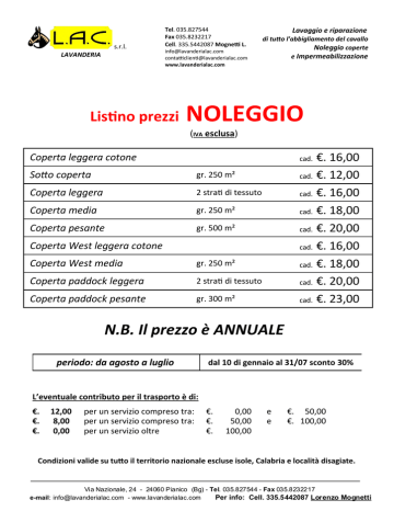 s.r.l. LAVANDERIA Tel. 035.827544 Fax 035.8232217 Cell. 335.5442087 Mognet L. [email protected] [email protected] www.lavanderialac.com Listno prezzi Lavaggio e riparazione di tuto l’abbigliamento del cavallo Noleggio coperte e Impermeabilizzazione NOLEGGIO (IVA esclusa) €. 16,00 cad. €. 12,00 cad. €. 16,00 cad. €. 18,00 cad. €. 20,00 cad. €. 16,00 cad. €. 18,00 cad. €. 20,00 cad. €. 23,00 Coperta leggera cotone cad. Soto coperta gr. 250 m² Coperta leggera 2 strat di tessuto Coperta media gr. 250 m² Coperta pesante gr. 500 m² Coperta West leggera cotone Coperta West media gr. 250 m² Coperta paddock leggera 2 strat di tessuto Coperta paddock pesante gr. 300 m² N.B. Il prezzo è ANNUALE periodo: da agosto a luglio dal 10 di gennaio al 31/07 sconto 30% L’eventuale contributo per il trasporto è di: €. €. €. 12,00 8,00 0,00 per un servizio compreso tra: per un servizio compreso tra: per un servizio oltre €. €. €. 0,00 50,00 100,00 e e €. 50,00 €. 100,00 Condizioni valide su tuto il territorio nazionale escluse isole, Calabria e località disagiate. Via Nazionale, 24 - 24060 Pianico (Bg) - Tel. 035.827544 - Fax 035.8232217 e-mail: [email protected] - www.lavanderialac.com Per info: Cell. 335.5442087 Lorenzo Mognetti LAVANDERIA s.r.l. Tel. 035.827544 Fax 035.8232217 Cell. 335.5442087 Mognet L. [email protected] [email protected] www.lavanderialac.com Lavaggio e riparazione di tuto l’abbigliamento del cavallo Noleggio coperte e Impermeabilizzazione TAGLIE A=cm. XXXS XXS XS S M L XL XXL B=cm. 95 105 136 148 115 125 135 145 155 165 160 172 184 196 208 220 Condizioni generali del noleggio La durata massima della locazione è di mesi 12 (dodici) La scadenza di tut i contrat è prevista entro e non oltre il 31 luglio prossimo alla data di consegna dei capi. I prezzi del servizio comprendono consegna e ritro dei capi presso Vs. sede, lavaggio ed eventuali riparazioni. Il servizio di lavaggio, riparazione o cambio taglia durante il periodo della locazione, sarà eseguito al costo e alle condizioni di solo lavaggio (vedere listno lavaggio). I capi a noleggio sono di proprietà della L.A.C. In caso di mancata resttuzione dei capi alla scadenza, il risarcimento del danno a favore della L.A.C. sarà pari a 3 (tre) volte il costo della locazione. I capi si noleggiano solo nuovi o in perfeto stato manutentvo. Modifche, aggiunte, scrite, loghi etc., verranno eseguite solo su preventvo e richiesta scrita del Cliente.