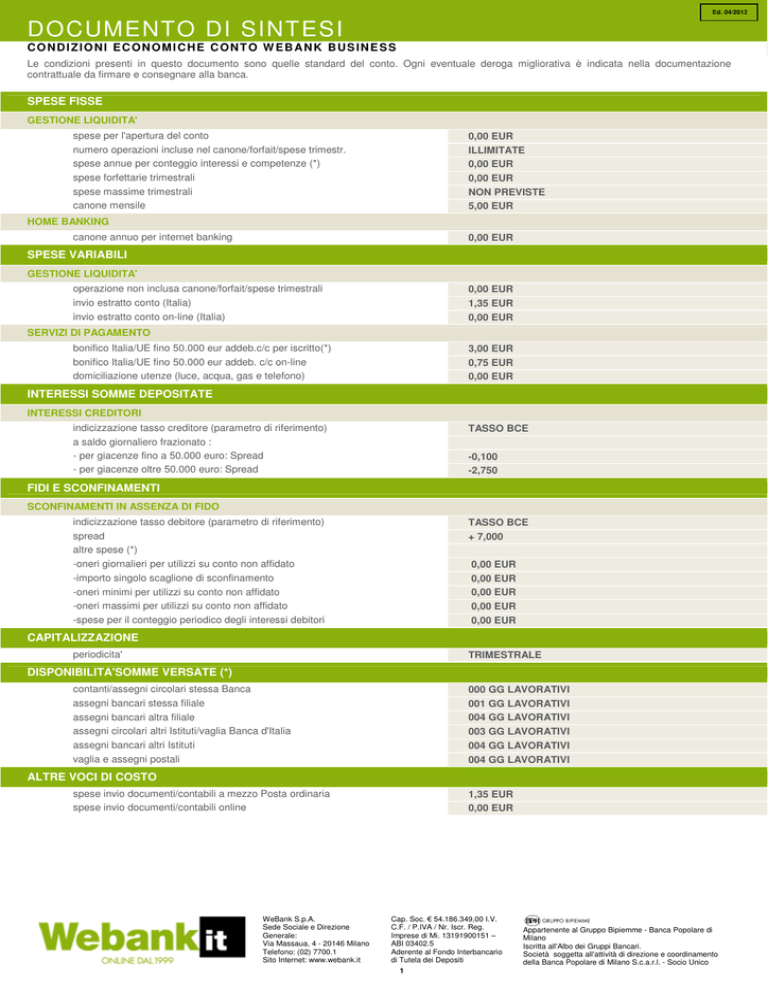 Ed. 04/2012 DOCUMENTO DI SINTESI CONDIZIONI ECONOMICHE CONTO WEBANK BUSINESS Le condizioni presenti in questo documento sono quelle standard del conto. Ogni eventuale deroga migliorativa è indicata nella documentazione contrattuale da firmare e consegnare alla banca. SPESE FISSE GESTIONE LIQUIDITA' spese per l'apertura del conto numero operazioni incluse nel canone/forfait/spese trimestr. spese annue per conteggio interessi e competenze (*) spese forfettarie trimestrali spese massime trimestrali canone mensile 0,00 EUR ILLIMITATE 0,00 EUR 0,00 EUR NON PREVISTE 5,00 EUR HOME BANKING canone annuo per internet banking 0,00 EUR SPESE VARIABILI GESTIONE LIQUIDITA' operazione non inclusa canone/forfait/spese trimestrali invio estratto conto (Italia) invio estratto conto on-line (Italia) 0,00 EUR 1,35 EUR 0,00 EUR SERVIZI DI PAGAMENTO bonifico Italia/UE fino 50.000 eur addeb.c/c per iscritto(*) bonifico Italia/UE fino 50.000 eur addeb. c/c on-line domiciliazione utenze (luce, acqua, gas e telefono) 3,00 EUR 0,75 EUR 0,00 EUR INTERESSI SOMME DEPOSITATE INTERESSI CREDITORI indicizzazione tasso creditore (parametro di riferimento) a saldo giornaliero frazionato : - per giacenze fino a 50.000 euro: Spread - per giacenze oltre 50.000 euro: Spread TASSO BCE -0,100 -2,750 FIDI E SCONFINAMENTI SCONFINAMENTI IN ASSENZA DI FIDO indicizzazione tasso debitore (parametro di riferimento) spread altre spese (*) -oneri giornalieri per utilizzi su conto non affidato -importo singolo scaglione di sconfinamento -oneri minimi per utilizzi su conto non affidato -oneri massimi per utilizzi su conto non affidato -spese per il conteggio periodico degli interessi debitori TASSO BCE + 7,000 0,00 EUR 0,00 EUR 0,00 EUR 0,00 EUR 0,00 EUR CAPITALIZZAZIONE periodicita' TRIMESTRALE DISPONIBILITA'SOMME VERSATE (*) contanti/assegni circolari stessa Banca assegni bancari stessa filiale assegni bancari altra filiale assegni circolari altri Istituti/vaglia Banca d'Italia assegni bancari altri Istituti vaglia e assegni postali 000 GG LAVORATIVI 001 GG LAVORATIVI 004 GG LAVORATIVI 003 GG LAVORATIVI 004 GG LAVORATIVI 004 GG LAVORATIVI ALTRE VOCI DI COSTO spese invio documenti/contabili a mezzo Posta ordinaria spese invio documenti/contabili online WeBank S.p.A. Sede Sociale e Direzione Generale: Via Massaua, 4 - 20146 Milano Telefono: (02) 7700.1 Sito Internet: www.webank.it 1,35 EUR 0,00 EUR Cap. Soc. € 54.186.349,00 I.V. C.F. / P.IVA / Nr. Iscr. Reg. Imprese di Mi. 13191900151 – ABI 03402.5 Aderente al Fondo Interbancario di Tutela dei Depositi 1 Appartenente al Gruppo Bipiemme - Banca Popolare di Milano Iscritta all'Albo dei Gruppi Bancari. Società soggetta all'attività di direzione e coordinamento della Banca Popolare di Milano S.c.a.r.l. - Socio Unico Ed. 04/2012 DOCUMENTO DI SINTESI SPESE TENUTACONTO spese di produzione ed invio Documento di sintesi,ogni invio spese di produzione ed invio Documento di sintesi,on-line spese invio documenti/contabili Raccomandata AR (*) minimo spese di estinzione conto corrente spese per fotocopiatura documenti e ricerche d'archivio : spesa per ogni fotocopia spese per ricerche d’archivio con un massimo 1,35 EUR 0,00 EUR 4,00 EUR 0,00 EUR 1,00 EUR 5,00 EUR 100,00 EUR SERVIZI DI PAGAMENTO ASSEGNI costo libretto assegni (10 assegni) imposta bollo su ogni modulo A/B rilasciato in forma libera spesa assegno circolante estero oltre alle spese reclamate spese applicate al traente per invio assegno al protesto spese applicate al traente per assegno richiamato spese comunicazione ai sensi Lgs 386/90 spese per benefondi ed esito assegno 0,52 EUR 1,50 EUR 4,33 EUR 17,50 EUR 17,50 EUR 10,00 EUR 12,00 EUR RITORNO DI ASSEGNI SULL'ITALIA(*) spese ritorno assegno sull'Italia versato sui nostri c/c -commissione -importo minimo (della commissione) -importo massimo (della commissione) valuta di addebito (assegno ritornato) 1,500 % 9,79 EUR 27,86 EUR DATA DEL VERSAMENTO TERMINI DI NON STORNABILITA' assegni bancari stessa filiale assegni bancari altra filiale assegni bancari altri istituti assegni circolari stessa banca assegni circolari altri istituti/vaglia Banca d'Italia vaglia e assegni postali 002 GG LAVORATIVI 006 GG LAVORATIVI 007 GG LAVORATIVI 005 GG LAVORATIVI 007 GG LAVORATIVI 007 GG LAVORATIVI UTENZE commissioni pag. online bollettino postale con addebito c/c pagamento bollette Telecom tramite ATM BANCOMAT pagamento canone TV tramite ATM BANCOMAT 1,75 EUR 1,00 EUR 1,60 EUR PAGAMENTI RICORRENTI commissioni pagam. RID (escluse luce acqua gas telefono) (*) 1,55 EUR COMMISSIONI BONIFICI ITALIA BONIFICO SU NOSTRA BANCA allo sportello con addebito in conto tramite canale internet tramite canale reti telematiche/CBI (*) 3,00 EUR 0,75 EUR 0,75 EUR (Non disponibile come banca attiva) BONIFICO SU ALTRA BANCA allo sportello con addebito in conto tramite canale internet tramite canale reti telematiche/CBI (*) 3,00 EUR 0,75 EUR 0,75 EUR (Non disponibile come banca attiva) BONIFICO DISPOSTO COME ORDINE RIPETITIVO SU NOSTRA BANCA allo sportello con addebito in conto tramite canale internet 2,20 EUR 0,65 EUR BONIFICO DISPOSTO COME ORDINE RIPETITIVO SU ALTRA BANCA allo sportello con addebito in conto tramite canale internet 2,20 EUR 0,65 EUR BONIFICO TRAMITE A/C tramite canale reti telematiche/CBI (*) 0,75 EUR (Non disponibile come banca attiva) WeBank S.p.A. Sede Sociale e Direzione Generale: Via Massaua, 4 - 20146 Milano Telefono: (02) 7700.1 Sito Internet: www.webank.it Cap. Soc. € 54.186.349,00 I.V. C.F. / P.IVA / Nr. Iscr. Reg. Imprese di Mi. 13191900151 – ABI 03402.5 Aderente al Fondo Interbancario di Tutela dei Depositi 2 Appartenente al Gruppo Bipiemme - Banca Popolare di Milano Iscritta all'Albo dei Gruppi Bancari. Società soggetta all'attività di direzione e coordinamento della Banca Popolare di Milano S.c.a.r.l. - Socio Unico Ed. 04/2012 DOCUMENTO DI SINTESI BONIFICO URGENTE / BIR bonifico urgente con addebito in conto per iscritto bonifico BIR (con importo superiore ad euro 500.000,00) per iscri