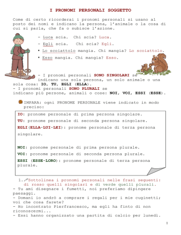 I PRONOMI PERSONALI SOGGETTO Come di certo ricorderai i pronomi personali si usano al posto dei nomi e indicano la persona, l’animale o la cosa di cui si parla, che fa o subisce l’azione. - Luca scia. - Egli scia. Chi scia? Luca. Chi scia? Egli. Lo scoiattolo mangia. Chi mangia? Lo scoiattolo. Esso mangia. Chi mangia? Esso. - I pronomi personali SONO SINGOLARI se indicano una sola persona, un solo animale o una sola cosa: IO, TU, EGLI (ELLA). - I pronomi personali SONO PLURALI se indicano più persone, animali o cose: NOI, VOI, ESSI (ESSE). IMPARA: ogni PRONOME PERSONALE viene indicato in modo preciso: IO: pronome personale di prima persona singolare. TU: pronome personale di seconda persona singolare. EGLI(ELLA-LUI-LEI): pronome personale di terza persona singolare. NOI: pronome personale di prima persona plurale. VOI: pronome personale di seconda persona plurale. ESSI (ESSE-LORO): pronome personale di terza persona plurale. 1. Sottolinea i pronomi personali nelle frasi seguenti: di rosso quelli singolari e di verde quelli plurali. - Tu ami disegnare i fumetti, noi preferiamo dipingere paesaggi. - Domani io andrò a comprare i regali per i mie cuginetti; voi che cosa farete? - Ho incontrato Pierfrancesco, ma egli ha finto di non riconoscermi... - Essi hanno organizzato una partita di calcio per lunedì. 1 2. Collega ogni voce verbale con il pronome personale corretto. canta io cadi suoni tu saltate studieremo egli/ella hanno capito mangio noi sognavamo avete ascoltato voi legge avrà saputo essi/esse scrivevo 3. Indica con una X il pronome personale adatto a ciascuna voce verbale (guarda l’esempio). VERBI io leggevo lavoreranno imparerete hai festeggiato disse abbiamo pulito X PRONOMI PERSONALI tu egli noi voi ella essi esse 4. Riscrivi in ordine il presente dei seguenti verbi. GIOCARE Noi giochiamo Essi giocano Tu giochi Io gioco Egli gioca Voi giocate .................... .................... .................... .................... .................... .................... Tu vedi Voi vedete Essi vedono Egli vede Io vedo Noi vediamo .................... .................... .................... .................... .................... .................... VEDERE 2