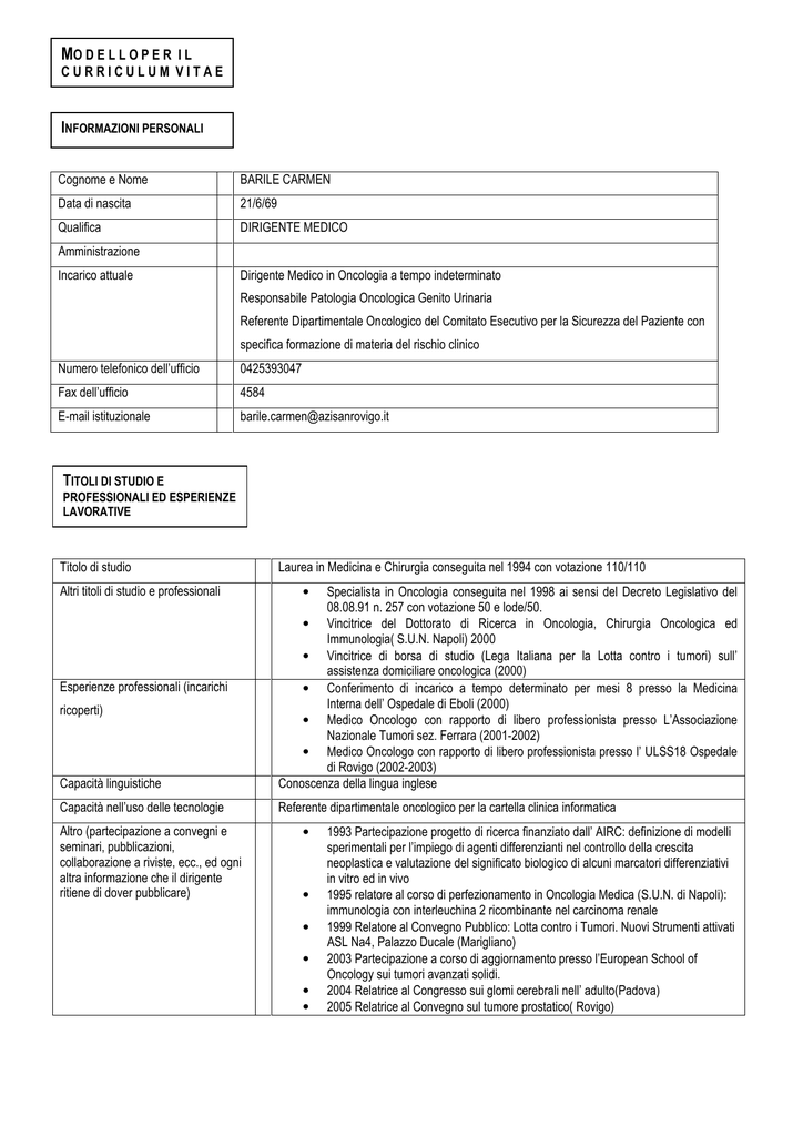 MO D E L L O P E R I L CURRICULUM VITAE INFORMAZIONI PERSONALI Cognome e Nome BARILE CARMEN Data di nascita 21/6/69 Qualifica DIRIGENTE MEDICO Amministrazione Incarico attuale Dirigente Medico in Oncologia a tempo indeterminato Responsabile Patologia Oncologica Genito Urinaria Referente Dipartimentale Oncologico del Comitato Esecutivo per la Sicurezza del Paziente con specifica formazione di materia del rischio clinico Numero telefonico dell’ufficio 0425393047 Fax dell’ufficio 4584 E-mail istituzionale [email protected] TITOLI DI STUDIO E PROFESSIONALI ED ESPERIENZE LAVORATIVE Titolo di studio Laurea in Medicina e Chirurgia conseguita nel 1994 con votazione 110/110 Altri titoli di studio e professionali Capacità linguistiche Specialista in Oncologia conseguita nel 1998 ai sensi del Decreto Legislativo del 08.08.91 n. 257 con votazione 50 e lode/50. • Vincitrice del Dottorato di Ricerca in Oncologia, Chirurgia Oncologica ed Immunologia( S.U.N. Napoli) 2000 • Vincitrice di borsa di studio (Lega Italiana per la Lotta contro i tumori) sull’ assistenza domiciliare oncologica (2000) • Conferimento di incarico a tempo determinato per mesi 8 presso la Medicina Interna dell’ Ospedale di Eboli (2000) • Medico Oncologo con rapporto di libero professionista presso L’Associazione Nazionale Tumori sez. Ferrara (2001-2002) • Medico Oncologo con rapporto di libero professionista presso l’ ULSS18 Ospedale di Rovigo (2002-2003) Conoscenza della lingua inglese Capacità nell’uso delle tecnologie Referente dipartimentale oncologico per la cartella clinica informatica Esperienze professionali (incarichi ricoperti) Altro (partecipazione a convegni e seminari, pubblicazioni, collaborazione a riviste, ecc., ed ogni altra informazione che il dirigente ritiene di dover pubblicare) • • • • • • • 1993 Partecipazione progetto di ricerca finanziato dall’ AIRC: definizione di modelli sperimentali per l’impiego di agenti differenzianti nel controllo della crescita neoplastica e valutazione del significato biologico di alcuni marcatori differenziativi in vitro ed in vivo 1995 relatore al corso di perfezionamento in Oncologia Medica (S.U.N. di Napoli): immunologia con interleuchina 2 ricombinante nel carcinoma renale 1999 Relatore al Convegno Pubblico: Lotta contro i Tumori. Nuovi Strumenti attivati ASL Na4, Palazzo Ducale (Marigliano) 2003 Partecipazione a corso di aggiornamento presso l’European School of Oncology sui tumori avanzati solidi. 2004 Relatrice al Congresso sui glomi cerebrali nell’ adulto(Padova) 2005 Relatrice al Convegno sul tumore prostatico( Rovigo) 2005 Relatrice al Convegno per gli infermieri sulla terapia del dolore(Rovigo) 2006 Socio Gruppo IGG( Italian Germ Group) 2006 partecipazione al corso di integrazione delle cure dei tumori cerebrali. 2006 Docente al corso: Neoplasie primitive del Sistema Nervoso Centrale (Rovigo) 2007 Relatore al Convegno sui tumori ovarici nel Veneto (Padova) 2007 Partecipazione al Corso: Kidney Cancer and Melanoma, progress in clinical and translational research. Mediteranean School of Oncology • 2008 Referente Studio Multicentrico GIR 1(Sunitinib either before or after cytoriductive nefrectomy. A phase II trial in patient with metastatic renal cell carcinoma. • 2008 Referente di Rovigo Studio Multicentrico: Valutazione del trattamento continuo o intermittente con docetaxel +/- estramustina fosfato nel carcinoma della prostate androgeno resistente. Studio Clinico di fase II. • 2008 Discussant al Congresso: carcinoma ovarico patologia di nicchia? (Padova) • 2008 Moderatrice al Convegno Nazionale Italian Germ Cancer Group (Treviso) • 2008 Relatore al Congresso: Tumori Epiteliali dell’ ovaio, percorsi clinici (Dolo) • 2009 Relatore al Congresso: tumori ginecologici (Padova) Elenco Pubblicazioni • • • • • • 1.Tagliaferri P., Caraglia M., Correale P., Barile C., Bianco A.R.. “Chemio-immunoterapia del melanoma umano”. Temi di Oncologia, Pyxis (Suppl.Rivista USSL N.4); Palazzo S., Liguori V., Conforti S.(editori);5:83-102, 1994. 2. Correale P., Caraglia M., Pepe S., Ricciardi B., Barile C., Montagnani S., Pacelli R., Bianco, A.R., Tagliaferri P. “Phorbol-12 myristitate 13-acetate (PMA) induces neuroendocrine differentation and reverses doxorubicin resistant of human colon carcinoma cells in vitro. International Journal of Oncology 4:423-427,1994. 3. Tagliaferri P., Correale P., Mottola M., De Simone G., Rea A., Ascione R., Morabito A., Matano E., Montesarchio V.,Caraglia M., Tortora G., Ciardiello F., Barile C., Palmieri G., Bianco A.R.. “Cardiovascular monitoring of drug – resistant lymphoma patients treated with EPOCH chemoterapy plus high dose verapamil in continuous infusion”. Oncology Reports 1: 341-44,1994. 4. Caraglia M., Libroia A.M., Corradino S., Coppola V., Guarrasi R., Barile C., Genua G., Bianco A.R.,Tagliaferri P. “α-Interferon induces depletion of intracellular iron content and upregulation of functional transferrin receptors on human epidermoid cancer KB cells.”Biochemical and Biophysical Research Communications 203:281-288,1994. 5. Tagliaferri P., Correale P., Mottola M., De Simone G., Montesarchio V., Matano E., Rea A., Morabito A., Famiani M., Ciardiello F., Tortora G., Caraglia M., Barile C., Palmieri G., Bianco A.R. “High dose recombinant interleukin-2/Verapamil combination in advanced cancer.”European Journal of Cancer Vol.32 A, n.8,1436-37,1996. 6. Tagliaferri P., Barile C., Caraglia M., Guarrasi R., Morelli D., Ricciardi B., Martignetti A., Librera M.T., Matano E., Della Vecchia A., Catalano G., Famiani M., Palmieri G., Correale P., Bianco A.R. “Daily lowe-dose subcutaneous recombinant interleukin-2 by alternate weekly administration.” American Journal Clinical Oncology 21(1):48-53,1998. 7. Turitto G., Barile C., Frattolillo A., Di Grazia M., Catalano G. “Fattori Prognostici nel carcinoma polmonare non a piccole cellule.” Argomenti di Oncologia 19:133-150