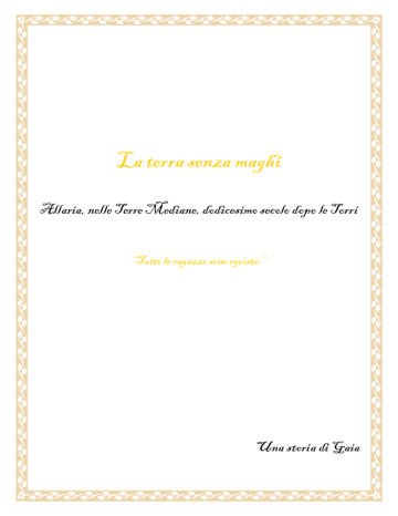 La terra senza maghi Allaria, nelle Terre Mediane, dodicesimo secolo dopo le Torri “Tutte le ragazze sono egoiste.” Una storia di Gaia Alcuni mesi dopo… 2. Verenike si appoggiò al davanzale della finestra della grande stanza bianca ed osservò le onde lucenti frangersi in quieti marosi nella calda primavera del golfo di Allaria1. Le era andata ancora meglio di quando avesse preventivato quando, non sapeva più se per ribellione o semplice ripicca, aveva lasciato il mulino per andare alla Quinta Casa: se doveva andare a lavorare come una schiava o essere la concubina di un vecchio, si era detta allora, tanto valeva che andasse a fare la prostituta; almeno sarebbe vissuta nella Città, avrebbe indossato bei vestiti e sarebbe stata ragionevolmente libera. Ma quando era stata introdotta in quella casa nessuna delle più anziane, Dorato Fiore di Loto, Komuke2 o Berike3, aveva parlato di darle una “camera” o di metterla sulla strada. Avrebbe imparato altre cose, le avevano detto, era una delle poche fanciulle di campagna che quei tempi senza amore per l’arte avevano reso idonee a diventare un’artista, e poi, se avesse avuto il desiderio di diventare una vera danzatrice sacra lo sarebbe divenuta, altrimenti, le aveva detto con un sorriso Dorato Fiore di Loto, ci sarebbe sempre stato bisogno di una donna dalla cultura raffinata, come istitutrice delle fanciulle che andavano ai Templi per la loro istruzione o altro, non escludendo a priori il matrimonio con qualche cittadino, magari ricco, anche se quest’idea faceva venire a Verenike la pelle d’oca per il ribrezzo4. «Niko? Niko5? Dove sei, sai che dobbiamo leggere insieme, oggi!» Naomike6, figlia di una suonatrice della Casa, aveva due anni meno di lei, ma sapeva leggere e scrivere perfettamente, ed aveva letto quasi tutti i libri della biblioteca del Tempio. «Niko? Ah, eccoti! Guardavi il mare? Cosa c’è, qualcosa di interessante?» La ragazza scura dai capelli neri e crespi come molti abitanti della città si sporse dalla finestra, osservando le onde ed il porto con una curiosità famelica che ben presto fu frustrata. «Ma non c’è niente!» sbottò. Per alcuni tratti, sebbene la superasse così tanto in cultura da poterle fare da maestra, la giovane cittadina era più ingenua di Verenike. «So che ai ragazzi della Terza Casa piace guardare il mare in tempesta, ma oggi è calmo! Forse…» 1 Oggi il golfo di Allaria è un po’ meno vasto che ai tempi di questa storia, per colpa dei detriti portati dal fiume Allar, deviato dai khali per l’agricoltura. 2 Komuke significa “onda fuggente” 3 Berike significa “girasole”. Questo nome, assai poco comune, veniva spesso scelto dalle donne che abbandonavano il nome della propria famiglia per darsi all’arte. 4 Non era inusuale che le artiste si sposassero, anche se normalmente questo non coincideva con la professione di danzatrice sacra. I mariti non erano praticamente mai dei Signori, a meno che non volessero una quarta o quinta moglie, ma i cittadini potevano accettare volentieri una sposa che non fosse istruita nella Quarta Casa ma almeno portasse a casa qualche soldo. La posizione della sposa di un cittadino era, per una donna educata normalmente, assai preferibile a quella della moglie di un Signore o di un latifondista. 5 Usare il nome “Verenike” era considerato di cattivo augurio, così come altri. 6 Naomike significa “Stella Marina”. Anche questo era un nome che spesso veniva preso dalle donne che abbandonavano il nome della propria famiglia. Un lampo di malizia brillò negli occhi verdi di Naomike, che si portò le mani sui fianchi e guardò in tralice la sua giovane amica. «Stavi pensando a uno dei ragazzi della Terza Casa, non è vero? Dimmi chi è! E’ Arish? E’Hiss? Oppure… scommetto che si tratta di Less7!» «Non te lo dirò mai!» sbottò Verenike «Dovrai scoprirlo da sola chi è il ragazzo che mi piace!». «D’accordo!» sbottò Naomike guardandola con gli occhi neri brillanti di sfida, poi l’afferrò per un braccio e la trascinò fuori dalla stanza8. «Devi ancora imparare a leggere come si deve e a scrivere in un modo decente! Vuoi che Talen9 e le altre pensino che tu sia rozza e che io sia una pessima insegnante? E che mi dici di quel libro di Ushike Ranka10 che ti avevo prestato? Scommetto che non l’hai nemmeno sfogliato! Ma ti costringerò a leggere quattro interi capitoli di geografia, Verenike figlia di Magos… oppure a dirmi chi è il ragazzo che ti piace!» Non c’era nessun ragazzo, naturalmente; anzi, non molto naturalmente, perché Verenike sapeva che una sua coetanea già da un anno aveva iniziato una relazione con un ragazzo del Popolo Marino11, e ormai non mancava molto al giorno in cui il loro amore di adolescenti si sarebbe trasformato in qualcosa di più serio. Ma lei non aveva nessuno, neanche uno dei tanti giovani della città che le piacesse anche solo un pochino, e questo la faceva sentire maledettamente strana, soprattutto nella Casa delle artiste. Forse era troppo giovane come aveva detto Komuke quando le aveva espresso la sua preoccupazione, ma Verenike sapeva che c’era qualcosa che non andava, e questa strada l’avrebbe portata dritta dritta a fare la fine di Ushike, la donna che aveva scritto il libro prestatole da Naomike e che lei cercava disperatamente di leggere, una maestra fine e rispettata, ma che in tutta la sua vita non aveva mai fatto che dipingere, insegnare a delle ragazze della Casa delle artiste e scrivere libri pieni d’amore e di vuoto allo stesso tempo. E se Verenike era andata via dalla casa di Nar era stato, vedendolo con il senno di poi, anche per il desiderio di fare qualcosa di speciale, qualcosa che lei poteva e voleva fare, per vedere il mondo al di fuori di una casa e di un villaggio. 7 Mentre i nomi femminili tendevano ad avere un significato non sempre era così per i nomi dei maschi, soprattutto se fin da piccoli erano stati consegnati alla Terza Casa per seguire la carr