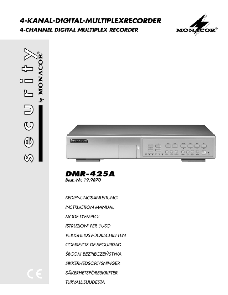 4-KANAL-DIGITAL-MULTIPLEXRECORDER 4-CHANNEL DIGITAL MULTIPLEX RECORDER DMR-425A Best.-Nr. 19.9870 BEDIENUNGSANLEITUNG INSTRUCTION MANUAL MODE D’EMPLOI ISTRUZIONI PER L’USO VEILIGHEIDSVOORSCHRIFTEN CONSEJOS DE SEGURIDAD ŚRODKI BEZPIECZEŃSTWA SIKKERHEDSOPLYSNINGER SÄKERHETSFÖRESKRIFTER TURVALLISUUDESTA ® D Bevor Sie einschalten ... A Wir wünschen Ihnen viel Spaß mit Ihrem neuen Gerät von MONACOR. Dabei soll Ihnen diese Bedienungsanleitung helfen alle Funktionsmöglichkeiten kennen zu lernen. Die Beachtung der Anleitung vermeidet außerdem Fehlbedienungen und schützt Sie und Ihr Gerät vor eventuellen Schäden durch unsachgemäßen Gebrauch. We wish you much pleasure with your new unit by MONACOR. With these operating instructions you will be able to get to know all functions of the unit. By following these instructions false operations will be avoided, and possible damage to you and your unit due to improper use will be prevented. Den deutschen Text finden Sie auf den Seiten 4 – 25. You will find the English text on the pages 4 – 25. CH GB Before you switch on ... ... F Avant toute mise en service ... B Nous vous remercions d’avoir choisi un appareil MONACOR et vous souhaitons beaucoup de plaisir à l’utiliser. Cette notice a pour objectif de vous aider à mieux connaître les multiples facettes de l’appareil et à vous éviter toute mauvaise manipulation . Vi auguriamo buon divertimento con il Vostro nuovo apparecchio MONACOR. Le istruzioni per l’uso Vi possono aiutare a conoscere tutte le possibili funzioni. E rispettando quanto spiegato nelle istruzioni, evitate di commettere degli errori, e così proteggete Voi stessi, ma anche l’apparecchio, da eventuali rischi per uso improprio. La version française se trouve pages 26 – 47. Il testo italiano lo potete trovare alle pagine 26 – 47. CH I Prima di accendere ... NL Voordat u inschakelt ... B Wij wensen u veel plezier met uw nieuw toestel van MONACOR. Lees de veiligheidsvoorschriften, alvorens het toestel in gebruik te nemen. Door de veiligheidsvoorschriften op te volgen zal een slechte werking vermeden worden, en zal een eventueel letsel aan uzelf en schade aan uw toestel tengevolge van onzorgvuldig gebruik worden voorkomen. Tenemos de agradecerle el haber adquirido un aparato MONACOR y le deseamos un agradable uso. Por favor lee las instrucciones de seguridad antes del uso. La observación de las instrucciones de seguridad evita operaciones erróneas y protege Vd. y vuestro aparato contra todo daño posible por cualquier uso inadecuado. U vindt de veiligheidsvoorschriften op pagina 48. Las instrucciones de seguridad se encuentran en la página 48. PL Przed Uruchomieniem … E DK Życzymy zadowolenia z nowego produktu MONACOR. Przed użyciem proszę przeczytać środki bezpieczeństwa. Uniknie się w ten sposób błędów obsługi oraz uszkodzenia sprzętu w wyniku nieodpowiedniego użytkowania. Antes de cualquier instalación ... Inden De tænder for apparatet ... Vi ønsker Dem god fornøjelse med Deres nye MONACOR apparat. Læs oplysningerne for en sikker brug af apparatet før ibrugtagning. Følg sikkerhedsoplysningerne for at undgå forkert betjening og for at beskytte Dem og Deres apparat mod skade på grund af forkert brug. Środki bezpieczeństwa znajdują się na stronie 48. Sikkerhedsoplysningerne finder De på side 49. S Förskrift Vi önskar dig mycket nöje med din nya enhet från MONACOR. Läs gärna säkerhetsinstruktionerna innan du använder enheten. Genom att följa säkerhetsinstruktionerna kan många problem undvikas, vilket annars kan skada enheten. Du finner säkerhetsinstruktionerna på sidan 49. 2 FIN Ennen virran kytkemistä … Toivomme, että uusi MONACOR-laitteesi tuo sinulle paljon iloa ja hyötyä. Ole hyvä ja lue käyttöohjeet ennen laitteen käyttöönottoa. Luettuasi käyttöohjeet voit käyttää laitetta turvallisesti ja vältyt laitteen väärinkäytöltä. Käyttöohjeet löydät sivulta 49. 1 2 3 4 5 6 7 Digital Video Recorder HDD 1 2 3 4 HDD Full ALARM REW STOP FF REC PLAY TIMER PAUSE PLAY REC ZOOM ENTER SEARCH MENU SLOW 1 8 9 10 11 VIDEO 1 2 3 4 15 16 17 18 19 20 AUDIO OUT IN EXTERNAL I/O 12 13 14 IN OUT MAIN 1 3 CALL 2 4 DC 19V 2 21 22 23 24 25 26 27 Main Monitor Call Monitor Camera 1 Alarm Device Alarm Sensor 1 Alarm Sensor 2 Alarm Sensor 3 Camera 2 Alarm Sensor 4 Camera 3 Camera 4 ® POWER POWER O H-HOLD V-HOLD BRIGHT VIDEO OUT CALL H-HOLD I CONTRAST V-HOLD BRIGHT CONTRAST VIDEO OUT MAIN AUDIO OUT AUDIO OUT 4 x ALARM IN VIDEO ALARM OUT IN EXTERNAL I/O 1 2 3 4 AUDIO OUT IN OUT MAIN 1 3 CALL 2 4 DC 19V REMOTE CONTROL VIDEO IN 4 REMOTE CONTROL AUDIO IN 4 CCD CAMERA Camera 4 VIDEO IN 3 AUDIO IN 3 CCD CAMERA Camera 3 VIDEO IN 2 AUDIO IN 2 CCD CAMERA Camera 2 Video Server Computer VIDEO IN 1 AUDIO IN 1 CCD CAMERA Camera 1 3 3 D Inhalt A CH 1 Übersicht der Bedienelemente und Anschlüsse . . . . . . . . . . . . . . . . . . . . . . . . . 5 2 Hinweise für den sicheren Gebrauch . . . . 6 3 Anwendungsmöglichkeiten . . . . . . . . . . . . 6 4 Geräte anschließen . . . . . . . . . . . . . . . . . . 7 4.1 Videoanschlüsse . . . . . . . . . . . . . . . . . . . . . 7 4.2 Audioanschlüsse . . . . . . . . . . . . . . . . . . . . . 7 4.3 Alarm- und Steueranschlüsse . . . . . . . . . . . 7 4.3.1 Alarmeingänge . . . . . . . . . . . . . . . . . . . . . . 7 4.3.2 Alarmausgang . . . . . . . . . . . . . . . . . . . . . . 7 4.3.3 Eingang zur Alarmzurücksetzung . . . . . . . . 7 4.3.4 Steuerausgang „Festplatte voll“ . . . . . . . . . 7 4.3.5 Fernsteuerung . . . . . . . . . . . . . . . . . . . . . . 7 5 Inbetriebnahme . . . . . . . . . . . . . . . . . . . . . . 8 Wiedergabe . . . . . . . . . . . . . . . . . . . . . . . . 10 9.10 Menü REMOTE . . . . . . . . . . . . . . . . . . . . . 18 8.1 Schneller Vor-/Rücklauf . . . . . . . . . . . . . . . 11 9.11 Menü USER . . . . . . . . . . . . . . . . . . . . . . . . 18 8.2 Langsamer Vor-/Rücklauf . . . . . . . . . . . . . 11 9.12 Menü 