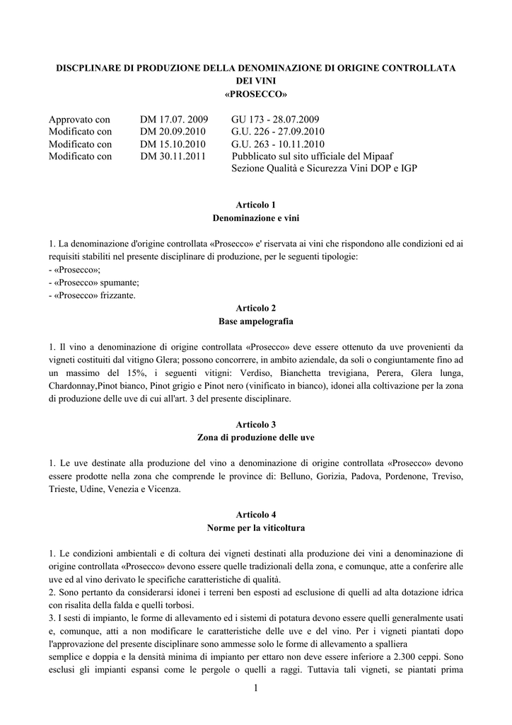 DISCPLINARE DI PRODUZIONE DELLA DENOMINAZIONE DI ORIGINE CONTROLLATA DEI VINI «PROSECCO» Approvato con Modificato con Modificato con Modificato con DM 17.07. 2009 DM 20.09.2010 DM 15.10.2010 DM 30.11.2011 GU 173 - 28.07.2009 G.U. 226 - 27.09.2010 G.U. 263 - 10.11.2010 Pubblicato sul sito ufficiale del Mipaaf Sezione Qualità e Sicurezza Vini DOP e IGP Articolo 1 Denominazione e vini 1. La denominazione d'origine controllata «Prosecco» e' riservata ai vini che rispondono alle condizioni ed ai requisiti stabiliti nel presente disciplinare di produzione, per le seguenti tipologie: - «Prosecco»; - «Prosecco» spumante; - «Prosecco» frizzante. Articolo 2 Base ampelografia 1. Il vino a denominazione di origine controllata «Prosecco» deve essere ottenuto da uve provenienti da vigneti costituiti dal vitigno Glera; possono concorrere, in ambito aziendale, da soli o congiuntamente fino ad un massimo del 15%, i seguenti vitigni: Verdiso, Bianchetta trevigiana, Perera, Glera lunga, Chardonnay,Pinot bianco, Pinot grigio e Pinot nero (vinificato in bianco), idonei alla coltivazione per la zona di produzione delle uve di cui all'art. 3 del presente disciplinare. Articolo 3 Zona di produzione delle uve 1. Le uve destinate alla produzione del vino a denominazione di origine controllata «Prosecco» devono essere prodotte nella zona che comprende le province di: Belluno, Gorizia, Padova, Pordenone, Treviso, Trieste, Udine, Venezia e Vicenza. Articolo 4 Norme per la viticoltura 1. Le condizioni ambientali e di coltura dei vigneti destinati alla produzione dei vini a denominazione di origine controllata «Prosecco» devono essere quelle tradizionali della zona, e comunque, atte a conferire alle uve ed al vino derivato le specifiche caratteristiche di qualità. 2. Sono pertanto da considerarsi idonei i terreni ben esposti ad esclusione di quelli ad alta dotazione idrica con risalita della falda e quelli torbosi. 3. I sesti di impianto, le forme di allevamento ed i sistemi di potatura devono essere quelli generalmente usati e, comunque, atti a non modificare le caratteristiche delle uve e del vino. Per i vigneti piantati dopo l'approvazione del presente disciplinare sono ammesse solo le forme di allevamento a spalliera semplice e doppia e la densità minima di impianto per ettaro non deve essere inferiore a 2.300 ceppi. Sono esclusi gli impianti espansi come le pergole o quelli a raggi. Tuttavia tali vigneti, se piantati prima 1 dell'approvazione del presente disciplinare, possono essere iscritti all'albo della denominazione per un periodo transitorio massimo di 10 anni, a condizione che sia garantita con la tradizionale potatura con una carica massima di 80.000 gemme ad ettaro. 4. Le regioni Veneto e Friuli-Venezia Giulia su proposta del Consorzio di tutela della denominazione, sentite le organizzazioni di categoria interessate, con propri provvedimenti, da adottare di concerto con univoci criteri tecnico-amministrativi, possono stabilire limiti, anche temporanei, all'iscrizione delle superfici all'apposito albo dei vigneti. Le Regioni sono tenute a dare comunicazione delle disposizioni adottate al Ministero per le politiche agricole alimentari e forestali. 5. E' vietata ogni pratica di forzatura; e' tuttavia consentita l'irrigazione di soccorso. 6. La resa massima di uva ammessa per la produzione dei vini di cui all'art. 1 non deve essere superiore a tonnellate 18 per ettaro di vigneto a coltura specializzata. A detto limite, anche in annate eccezionalmente favorevoli, la resa dovrà essere riportata attraverso una accurata cernita delle uve, purché la produzione non superi del 20% il limite medesimo. Le regioni Veneto e Friuli-Venezia Giulia su proposta del Consorzio di tutela della denominazione, sentite le organizzazioni di categoria interessate, prima della vendemmia, con propri provvedimenti, da adottare di concerto con univoci criteri tecnico-amministrativi, possono stabilire un limite massimo di utilizzazione di uva per ettaro per la produzione dei vini a denominazione di origine controllata «Prosecco» inferiore a quello fissato dal presente disciplinare. Le regioni sono tenute a dare comunicazione delle disposizioni adottate al Ministero per le politiche agricole alimentari e forestali. 7. Le uve destinate alla vinificazione del vino a denominazione di origine controllata «Prosecco» devono assicurare un titolo alcolometrico volumico naturale minimo di 9,50% vol. Le uve destinate alla produzione dei vini a denominazione di origine controllata «Prosecco» spumante e frizzante devono assicurare un titolo alcolometrico volumico naturale minimo del 9,0% vol., purché la destinazione delle uve atte ad essere elaborate venga espressamente indicata nei documenti ufficiali di cantina e nella denuncia annuale delle uve. Articolo 5 Norme per la vinificazione 1. Le operazioni di vinificazione, ivi comprese le operazioni di elaborazione del vino spumante e frizzante, ossia le pratiche enologiche per la presa di spuma e per la stabilizzazione, la dolcificazione nelle tipologie ove ammessa, nonché le operazioni di imbottigliamento e di confezionamento, devono essere effettuate nel territorio di cui all'art. 3 del presente disciplinare. 2. Tuttavia, tenuto conto delle situazioni tradizionali di produzione, le operazioni di elaborazione delle tipologie «Prosecco» spumante e «Prosecco» frizzante, nonché il relativo imbottigliamento, possono essere effettuate, con autorizzazioni individuali, rilasciate dal Ministero delle politiche agricole alimentari e forestali, previo parere delle regioni Veneto e Friuli-Venezia Giulia, anche in stabilimenti situati nelle province confinanti con l'area di cui al primo comma, a condizione che le relative ditte presentino richiesta motivata, corredata da apposita documentazione atta a provare l'uso delle tradizionali pratiche di cui trattasi in maniera continuativa da almeno 5 campagne vitivinicole antecedenti all'entrata in vigore del presente disciplinare. 3.