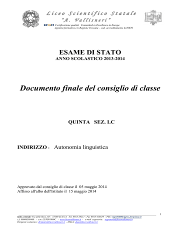 Liceo Scientifico Statale “A. Vallisneri” Certificazione qualità Committed to Excellence in Europe Agenzia formativa c/o Regione Toscana – cod. accreditamento LU0639 ESAME DI STATO ANNO SCOLASTICO 2013-2014 Documento finale del consiglio di classe QUINTA SEZ. LC INDIRIZZO : Autonomia linguistica Approvato dal consiglio di classe il 05 maggio 2014 Affisso all'albo dell'Istituto il 15 maggio 2014 _____________________________________________________________________________________________________ Sede centrale: Via delle Rose, 68 - 55100 LUCCA Tel. 0583-58211 - Fax 0583-418619 - PEC: [email protected] c.f. 80006590469 - c.m. LUPS01000C - www.liceovallisneri.it - e-mail segreteria: [email protected] Dirigente scolastico: [email protected] - DSGA: [email protected] 1 Liceo Scientifico Statale “A. Vallisneri” Certificazione qualità Committed to Excellence in Europe Agenzia formativa c/o Regione Toscana – cod. accreditamento LU0639 CONTENUTI Profilo del corso Composizione del consiglio di classe Composizione della classe Profilo della classe Obiettivi formativi trasversali raggiunti Obiettivi cognitivi trasversali raggiunti Metodi e strategie Spazi e mezzi Libri di testo Misurazione e valutazione Recupero, sostegno e approfondimento Iniziative complementari e integrative Simulazioni e criteri di misurazione e di valutazione prima prova Simulazioni e criteri di misurazione e di valutazione seconda prova Simulazioni e criteri di misurazione e di valutazione terza prova Criteri di misurazione e di valutazione del colloquio ALLEGATI PER LA COMMISSIONE D’ESAME Allegato A - Relazione finale dei docenti per le singole materie Allegato B - Programmi svolti Allegato C - Tesine individuali e/o mappe concettuali Allegato D - Testi simulazioni effettuate _____________________________________________________________________________________________________ Sede centrale: Via delle Rose, 68 - 55100 LUCCA Tel. 0583-58211 - Fax 0583-418619 - PEC: [email protected] c.f. 80006590469 - c.m. LUPS01000C - www.liceovallisneri.it - e-mail segreteria: [email protected] Dirigente scolastico: [email protected] - DSGA: [email protected] 2 Liceo Scientifico Statale “A. Vallisneri” Certificazione qualità Committed to Excellence in Europe Agenzia formativa c/o Regione Toscana – cod. accreditamento LU0639 1. PROFILO DEL CORSO Premessa Attivi dal 1986, i corsi sperimentali sono stati progettati per realizzare curricoli meglio rispondenti alle finalità di una scuola moderna. Essi si basano sulla convinzione che una scuola che si propone di rispondere alle mutevoli esigenze dei tempi deve abbandonare l’illusione di poter “rincorrere” il sapere e le abilità tipiche delle nuove professioni e deve, invece, assicurare indirizzi con caratteristiche contenutistiche e culturali di preminente valore formativo, tali cioè da consentire ad ogni studente, in armonia con le proprie attitudini e senza turbamenti, la scelta della facoltà universitaria o della professione che più gli è consona. E’ per questo che nei corsi sperimentali si sono conservate tutte le discipline ritenute indispensabili per una formazione culturale forte e moderna e si è definita non una professionalità rigida, per altro soggetta ad una rapida obsolescenza, ma una formazione ampia e flessibile, “indirizzata” ma anche generale e quindi capace di destreggiarsi in campi vasti per tradursi in scelte professionali diverse e successive. La sperimentazione linguistica Il punto di aggregazione culturale di questi corsi è il “linguaggio” inteso non come semplice strumento di espressione, ma come comunicazione e, per questo, condizione prima della vita sociale. In tal senso ciascuna disciplina è chiamata ad evidenziare il proprio valore comunicativo e tutte, nel loro insieme, a collaborare alla scoperta e all’uso del “linguaggio” con cui l’uomo esprime il proprio pensiero, la propria storia, la propria civiltà. Così, fra le finalità del corso vi è quella di far acquisire conoscenze linguistiche non fini a se stesse, ma rapportate alla filosofia del linguaggio, preparando i giovani ad affrontare ed inquadrare i problemi in termini corretti di creatività e flessibilità. Il quadro orario Area dell’equivalenza MATERIE I II Italiano 4 4 Storia 3 3 Diritto 1 1 Lingua straniera 1 (inglese) 3* 3* Matematica 3 3 Scienze della terra e biologia 2 2 Linguaggi non verbali e multimediali 1 1 Religione (o materia alternativa) 1 1 Educazione fisica 2 2 20 20 Totale delle ore settimanali * di cui un’ora in compresenza con conversatore di madrelingua _____________________________________________________________________________________________________ Sede centrale: Via delle Rose, 68 - 55100 LUCCA Tel. 0583-58211 - Fax 0583-418619 - PEC: [email protected] c.f. 80006590469 - c.m. LUPS01000C - www.liceovallisneri.it - e-mail segreteria: [email protected] Dirigente scolastico: [email protected] - DSGA: [email protected] 3 Liceo Scientifico Statale “A. Vallisneri” Certificazione qualità Committed to Excellence in Europe Agenzia formativa c/o Regione Toscana – cod. accreditamento LU0639 Area di indirizzo MATERIE I 3 4* 2* 1 10 Latino Lingua straniera 2 (tedesco o francese) Lingua straniera 3 (tedesco o francese o spagnolo) Storia dell’arte Totale delle ore settimanali * di cui un’ora in compresenza con conversatore di madrelingua II 3 3* 3* 1 10 Totale delle due aree MATERIE Area dell’equivalenza + Area di indirizzo Totale delle ore settimanali I 20 10 30 II 20 10 30 Progetto AUTONOMIA - Triennio Linguistico MATERIE Italiano Latino Lingua straniera 1 Lingua straniera 2 Lingua straniera 3 Storia dell’Arte Storia Filosofia Matematica e Fisica Scienze naturali Educazione fisica Religione (o materia alternativa) Matematica e Fisica Scienze naturali Area di Lingua straniera 1 integrazione Lingua straniera 2 Lingua straniera 3 Totale delle ore settimanali * di cui un’ora in compresenza con conversatore di madrelingua ** pi