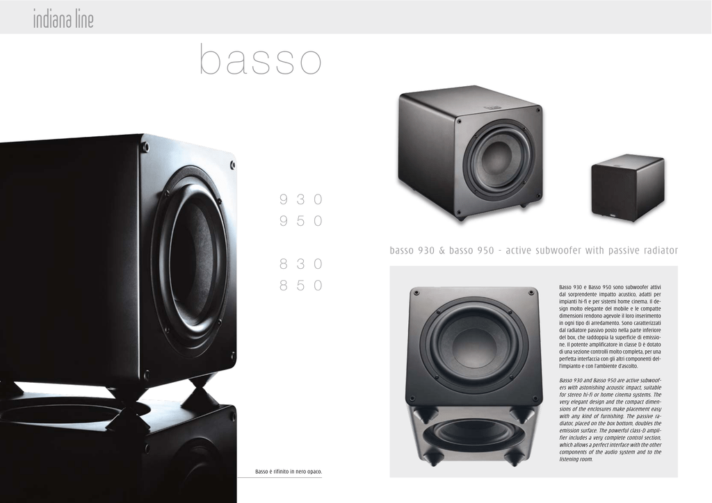 basso 9 3 0 9 5 0 8 3 0 8 5 0 basso 930 & basso 950 - active subwoofer with passive radiator Basso 930 e Basso 950 sono subwoofer attivi dal sorprendente impatto acustico, adatti per impianti hi-fi e per sistemi home cinema. Il design molto elegante del mobile e le compatte dimensioni rendono agevole il loro inserimento in ogni tipo di arredamento. Sono caratterizzati dal radiatore passivo posto nella parte inferiore del box, che raddoppia la superficie di emissione. Il potente amplificatore in classe D è dotato di una sezione controlli molto completa, per una perfetta interfaccia con gli altri componenti dell'impianto e con l'ambiente d'ascolto. Basso 930 and Basso 950 are active subwoofers with astonishing acoustic impact, suitable for stereo hi-fi or home cinema systems. The very elegant design and the compact dimensions of the enclosures make placement easy with any kind of furnishing. The passive radiator, placed on the box bottom, doubles the emission surface. The powerful class-D amplifier includes a very complete control section, which allows a perfect interface with the other components of the audio system and to the listening room. Basso è rifinito in nero opaco. subwoofer attivo • active subwoofer basso 830 & basso 850 - active subwoofer with twin reflex port Basso 930 Basso 950 diametro altoparlante • speaker diameter 220 mm 275 mm radiatore passivo • passive radiator 220 mm 275 mm tipo di amplificatore • amplifier type D-Class D-Class potenza nominale • nominal power 250 W 300 W potenza massima • max power 400 W 500 W risposta in frequenza • frequency response 25 ÷ 180 Hz 24 ÷ 180 Hz frequenza di crossover • crossover frequency 40 ÷ 180 Hz 40 ÷ 180 Hz alimentazione • power supply 220 ÷ 240 V 220 ÷ 240 V consumo massimo • max power consumption 300 W 350 W stand-by • stand-by consumption 0.8 W 0.8 W 3.15 A 3.15 A 270 x 295 x 395 mm 310 x 335 x 435 mm 12.7 Kg 17.4 Kg vernice nera opaca mat black paint vernice nera opaca mat black paint Basso 830 Basso 850 220 mm 275 mm twin reflex port twin reflex port AB-Class AB-Class 75 W 150 W 125 W 200 W risposta in frequenza • frequency response 36 ÷ 180 Hz 27 ÷ 180 Hz frequenza di crossover • crossover frequency 40 ÷ 180 Hz 40 ÷ 180 Hz alimentazione • power supply 220 ÷ 240 V 220 ÷ 240 V consumo massimo • max power consumption 125 W 250 W stand-by • stand-by consumption 0.8 W 0.8 W fusibile • fuse 1.0 A 2.0 A 250 x 305 x 420 mm 310 x 335 x 440 mm 8.8 Kg 12.2 Kg vinile nero opaco mat black vinyl vinile nero opaco mat black vinyl fusibile • fuse dimensioni • dimensions peso • weight I subwoofer attivi Basso 830 e Basso 850 sono adatti per impianti hi-fi stereo e per sistemi home cinema. Il design pulito e raffinato del mobile rende agevole il loro inserimento in ogni tipo di arredamento. Sono caratterizzati dal doppio condotto reflex, posto nella parte inferiore del box, per utilizzare il pavimento come rinforzo delle basse frequenze. L'amplificatore è dotato di una sezione controlli molto completa, che consente una perfetta interfaccia con gli altri componenti dell'impianto audio e con l'ambiente d'ascolto. The Basso 830 and Basso 850 active subwoofers are suitable for stereo hi-fi or home cinema systems. The clean and elegant design of the enclosures makes placement easy with any kind of furnishing. The twin reflex tubes, on the box bottom side, are down firing for using the low frequency reinforcement of the floor. The amplifier includes a very complete control section, which allows a perfect interface with the other components of the audio system and to the listening room. finitura finishes subwoofer attivo • active subwoofer diametro altoparlante • speaker diameter tipo di carico • enclosure load tipo di amplificatore • amplifier type potenza nominale • nominal power potenza massima • max power dimensioni • dimensions peso • weight finitura finishes