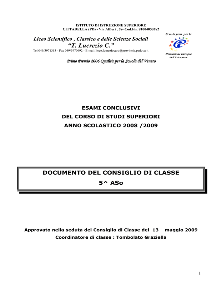 ISTITUTO DI ISTRUZIONE SUPERIORE CITTADELLA (PD) - Via Alfieri , 58- Cod.Fis. 81004050282 Scuola polo per la Liceo Scientifico , Classico e delle Scienze Sociali “T. Lucrezio C.” Tel.049/5971313 - Fax 049/5970692 - E-mail:[email protected] Dimensione Europea dell’Istruzione Primo Premio 2006 Qualità per la Scuola del Veneto ESAMI CONCLUSIVI DEL CORSO DI STUDI SUPERIORI ANNO SCOLASTICO 2008 /2009 DOCUMENTO DEL CONSIGLIO DI CLASSE 5^ ASo Approvato nella seduta del Consiglio di Classe del 13 maggio 2009 Coordinatore di classe : Tombolato Graziella 1 PROFILO DELLA CLASSE 1.1Elenco delle materie e dei docenti MATERIA DOCENTE ITALIANO FIOR FIORELLA SCIENZE SOCIALI TOMBOLATO GRAZIELLA LINGUA LETTERATURA FRANCESE VALENTIN MANUELA LINGUA LETTERATURA INGLESE VITTURELLI DANIELA MATEMATICA – FISICA BOLZONELLA PAOLO STORIA FILOSOFIA BOTTECCHIA CATERINA DIRITTO ECONOMIA MASTROMARINO ANTONIO SCIENZE MENDO DANIELA STORIA DELL’ARTE CASAROTTO VALENTINA EDUCAZIONE FISICA TAFFARA ROBERTO RELIGIONE STECCANELLA ASSUNTA 1.2 1 2 3 4 5 6 7 8 9 10 11 12 13 14 15 Elenco alunni (femmine ANTONELLO GLORIA BATTAGLIA ALESSANDRA BEGHETTO AGATA BENELLA ALBERTA BERNARDI ALESSIA BON ANNA BUSATTA ELEONORA CAUZZO VALENTINA DALLA BONA SARA FACCIN MARIA FRISON IRENE GUERRA GIULIA MANFIO GIULIA MARAGNO MARTINA MARTINI VALENTINA , maschi) Totale 21 alunni 16 17 18 19 20 21 PIEROBON ELISA SCAPIN SILVIA SCARABOTTOLO MARTA SGARBOSSA GLORIA ZANCHIN RAFFAELLA ZOCCARATO GLORIA 1.3 Rappresentanti di classe studenti: Benella Alberta, Zanchin Raffaella Rappresentanti di classe genitori: Cauzzo Nico Frison Paolo 1.4 Storia della classe CONTINUITA’ DIDATTICA 3^ 4^ ITALIANO BRAGA FIOR SCIENZE SOCIALI TOMBOLATO TOMBOLATO LINGUA LETTERATURA INGLESE CORRADI SETTIMO LINGUA LETTERATURA FRANCES LOREFICE DE AGOSTINI STORIA – FILOSOFIA BACCHIN GUASTELLA MATEMATICA – FISICA MENEGAZZO BIVIANO SCIENZE MENDO MENDO STORIA DELL’ARTE GASPARINI CASAROTTO EDUCAZIONE FISICA BUSÀ BUSÀ DIRITTO-ECONOMIA DE VIVO DI GIORGIO RELIGIONE STECCANELLA STECCANELLA Alunni iscritti Terza Quarta Quinta 22 21 21 Iscritti da altra classe o ripetenti 2 / / 5^ FIOR TOMBOLATO VITTURELLI VALENTIN BOTTECCHIA BOLZONELLA MENDO CASAROTTO TAFFARA MASTROMARIN STECCANELLA Promossi Promossi con debito formativo/sospensione Non promossi 21 20 3 1 1 2 1.5 Commento riassuntivo PRESENTAZIONE DELLA CLASSE 5 ASo La classe quinta ASO comprende 21 studentesse; la composizione del gruppo ha subito nel corso dei cinque anni qualche variazione rilevabile nel prospetto precedente. Durante quest’anno scolastico la classe ha vissuto una fase critica, attribuibile alla difficoltà di adeguarsi alle nuove modalità di studio, richieste dagli insegnanti. Alla sostanziale diligenza e volontà di apprendere delle studentesse, rilevata nei precedenti quattro anni di scuola, si è sovrapposto un senso di fatica e sfiducia generalizzato, che ha inciso notevolmente sia sul rendimento che sul clima di classe. Nella seconda parte dell’anno c’è stato un graduale miglioramento nel senso che le studentesse hanno acquisito più consapevolezza della propria responsabilità anche nel manifestare il disagio e nell’affrontare i conflitti. Rimane la sensazione di una certa fragilità (e apatia) di base, dovuta in parte alla storia della classe che ha subito nel quinquennio, continui cambi di docenti, come risulta dal prospetto 1.4; in particolare per quanto riguarda l’anno in corso sono cambiati gli insegnanti di sette discipline (francese, inglese, matematica, storia, filosofia, diritto ed educazione fisica). Altra possibile causa della fragilità che contraddistingue il gruppo,può dipendere dal fatto che le attuali due classi quinte del Liceo sociale hanno fatto da “apripista” nella strutturazione dell’indirizzo che si è rivelato di una certa complessità per il numero di materie previste dal curriculum di studi e per la peculiarità della materia di indirizzo Scienze Sociali, articolata in quattro ambiti disciplinari: psicologia, pedagogia, sociologia e antropologia. Le energie psichiche richieste alle studentesse per reimpostare, ad ogni inizio anno, la relazione con numerosi nuovi insegnanti hanno probabilmente inciso negativamente sul rendimento della classe, in termini di profitto. 2 SITUAZIONE IN INGRESSO DELLA CLASSE Risultati dello scrutinio finale della classe 4^ (alunni promossi) Materia Alunni promossi con 6 Alunni promossi con 7 Alunni promossi con 8 Alunni promossi con 9/10 Italiano Sc. Sociali Inglese Francese Storia Filosofia Matematica Biologia Scienze Integr. Arte Ed.ne Fisica Diritto 6 8 15 13 1 6 11 8 6 11 6 3 4 12 12 8 7 5 2 7 3 3 8 3 1 5 2 2 / / / / / 1 / / / 4 5 12 11 2 8 4 1 1 2 Alunni con sospens. giudizio 1 1 3 3. INIZIATIVE COMPLEMENTARI E/O INTEGRATIVE STAGE CURRICOLARE Nel corso sperimentale del Liceo di Scienze Sociali, il curriculum di studi prevede nelle classi terze, quarte e quinte l’attuazione di un periodo di stage obbligatorio. Le attività svolte durante lo stage hanno permesso agli alunni di confrontarsi con le diverse realtà ed emergenze sociali del territorio, di affinare le abilità tecnico-pratiche relative alle discipline di indirizzo, anche in termini di fattiva collaborazione con le agenzie presenti nel Comune e nel territorio (Asl, ospedale, associazioni di volontariato, terzo settore). Gli obiettivi specifici hanno riguardato la capacità di interpretare le relazioni sociali avendo consapevolezza della complessità della persona umana e la capacità di inserirsi in modo attivo con istituzioni, persone o gruppi, oltre che lo sviluppo e l’incremento di capacità di socializzazione, progettuali e di orientamento in itinere. Nella progettazione dello stage formativo si è tenuto conto: dell’importanza di questa esperienza, così come viene evidenziato nel Piano dell’Offerta Formativa del nostro Istituto, in cui si afferma che essa “rappresenta il richiamo alla dimensione pratico-operativa, coniuga il sapere e il fare ovvero l