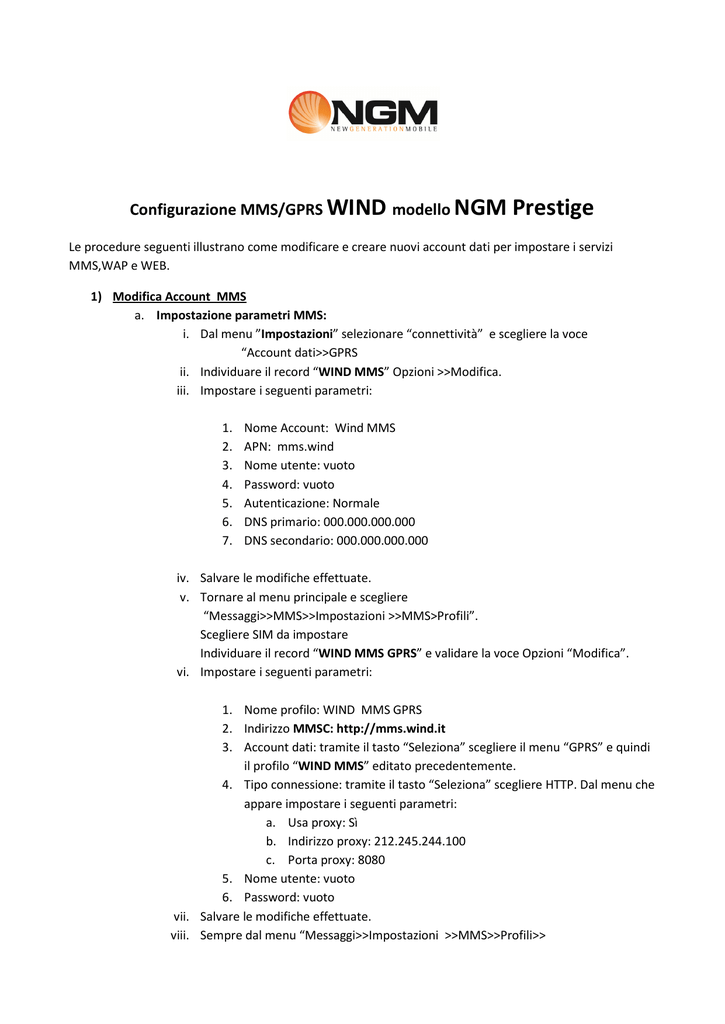 Configurazione MMS/GPRS WIND modello NGM Prestige