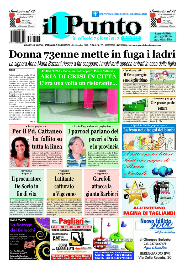 http://www.facebook.com/giornaleilpuntopavia in edicola 7 giorni su 7 PAVESE FONDATO NEL 1994 ANNO XX - N. 49 (951) - SETTIMANALE INDIPENDENTE - 23 dicembre 2013 - EURO 1,20 - TEL. 0382539595 - FAX 038220130 - www.giornaleilpuntopavese.com Donna 73enne mette in fuga i ladri La signora Anna Maria Bazzani riesce a far scappare i malviventi appena entrati in casa della figlia ZIBIDO FOTONOTIZIA • Pavia, mercato coperto Piazza Vittoria • Sabato sera intorno alle 18.30 due malviventi in frazione Badile, nel comune di Zibido, provano ad intrare nell’appartamento della signora Raffaella Valtorta che non era in casa, in via Passoni. I ladri sfondano il vetro di una finestra ed entrano. Non si sono però accorti che dal balcone di sopra stava assistendo alla sce na la mamma della signora Valtorta, la 73enne Annamaria Bazzani. L’anziana, che in passato è stata anche presidentessa del centro anziani di Badile, si è messa subito ad urlare e ad inveire verso i malviventi che impauriti sono scappati via senza bottino. PAG. 6 ARIA DI CRISI IN CITTÀ C’era una volta un ristorante... • Sport, pag. 38 • Il Pavia pareggia e non è più ultimo In Lega Pro il Pavia pareggia in casa contro il Como (1-1). Con questo punticino portato a casa gli azzurri non sono più ultimi in classifica. In Eccellenza con- tinua la marcia trionfale dell’OltrepòVoghera che rifila altre quattro reti anche all’ Arconatese e blinda sempre più il suo primo posto. • Mortara, pag. 36 • Clir, preoccupante rottura Grossa bagarre alla società di raccolta dei rifiuti lomellini. L’assemblea di sabato scorso doveva ridefinire le tariffe per lo smaltimento della spazza- • Pavia, pagina 7 • • Lente d’ingrandimento, pagine 8-9 • Per il Pd, Cattaneo I parroci parlano dei ha fallito su poveri a Pavia tutta la linea e in provincia Cattaneo? Un flop. Alla vigilia delle elezioni amministrative, l’opposizione boccia senza prova d’appello l’attuale giunta. A scatenare l’indignazione della minoranza sono soprattutto la mai avvenuta diminuzione delle tasse e la sempre minor sicurezza in città. Siamo partiti dalle parole di Papa Francesco per fare una ricognizione nelle parrocchie di tutta la provincia di Pavia per verificare cosa concretamente i parroci del nostro territorio fanno per stare vicini ai più deboli e ai più poveri. Provinciale • Pagina 6 • Vigevano • Pagina 6 • Voghera • Pagina 27 • Il procuratore De Socio in fin di vita Latitante catturato a Vigevano Garofoli attacca la giunta Barbieri Il Procuratore aggiunto della procura della Repubblica Francesco De Socio si è sentito male mentre era a caccia a Montesegale. I soccorritori arrivati con molta difficoltà sul posto ne hanno da subito constatato le condizioni gravi. Il procuratore era infatti in pieno infarto. De Socio è ora ricoverato al San Matteo e versa ancora in gravissime condizioni. Arrestato un latitante a Vigevano, braccato dai Carabinieri (guidati dal capitano Rocco Papaleo) che hanno sfruttato una sua debolezza: il gioco del Lotto. Proprio il cercare ambi e terni ha fatto arrestare sabato sera Gennaro Mangano, 46 anni, residente a Limbiate ma di chiare origini partenopee Il coordinatore del Partito democratico Enzo Garofoli attacca l’amministrazione comunale del sindaco Barbieri reo secondo il “democrat” di poca chiarezza e poca concretezza. Ad esempio secondo Garofoli: «Vietare l’accattonaggio limitatamente al periodo natalizio equivale solo al nascondere la polvere sotto il tappeto» tura, ma si è conclusa con un nulla di fatto. Una spaccatura tra diversi comuni che inizia ad essere preoccupante per il futuro del Clir. • Speciale Natale, pagine 15-21 • La festa nei disegni dei bimbi A tutti i nostri lettori tanti cari auguri di Buon Natale ALL’INTERNO PAGINA DI TAGLIANDI 0383 92497 La Bottega dei Balocchi Articoli per Animali Cappottini_Magliettine_Guinzagli Pettorine_Borse_Ciotole e tanto altro Fix for Pets Auguri di Buone Feste C.so Repubblica, 27 Rivanazzano Terme (PV) [email protected] http://www.bottegadeibalocchi.com • TINTEGGIATURE ESTERNE E INTERNE • VERNICIATURE • PREVENTIVI GRATUITI Via Stazione, 88 - Valle Lomellina Cell. 327 4579335 Cell. 338 6671048 Auguri di Buone Feste 3 23 dicembre 2013 NotiziedalMondo L’ultimo attentato su un bus in territorio israeliano si era registrato nel novembre 2012 Israele, tornano le bombe sugli autobus Ordigno esploso a Bat Yam: «È terrorismo». La bomba era nascosta in una borsa RUSSIA TEL AVIV Non è ancora chiara la dinamica dell’esplosione sul bus a Bat Yam, vicino a Tel Aviv, ma secondo il quotidiano Haaretz la polizia ritiene che possa anche trattarsi di un tentato attacco terroristico. Il sito Ynet citando il portavoce della compagnia Dan - che gestisce la linea dell’autobus - spiega che la bomba è esplosa «mentre la polizia stava cercando di far allontanare la gente» e che «una persona è stata ferita e trasportata in ospedale». Sempre Ynet ha riportato la dichiarazione di un responsabile di Hamas, tale Moshir al-Masri, che si «è congratulato» per la bomba esplosa nel primo pomeriggio su un autobus e ha detto che questo dimostra l’abilità della “resistenza” di allargarsi all’interno di Israele. «Sarebbe bene - avrebbe aggiunto, secondo Ynet che Israele comprendesse che non conoscerà alcuna stabilità, finché i palestinesi vivranno nell’instabilità». Khodorkovsky: «Non farò politica» «In Russia molti prigionieri politici. Non mi dichiarerò mai colpevole» MOSCA Rilievi della polizia israeliana sull’autobus in cui è esploso l’ordigno «Un membro della squadra artificieri» giunta sul posto dopo essere stata allertata dal conducente del bus stesso ha effettuato «un’esplosione controllata» del pacco sospetto, riferi- Si è trattato comunque di un "attacco terroristico". Lo ha detto il portavoce della polizia scono i media. Il sito Ynet citando il portavoce della compagnia Dan - che gestisce la linea