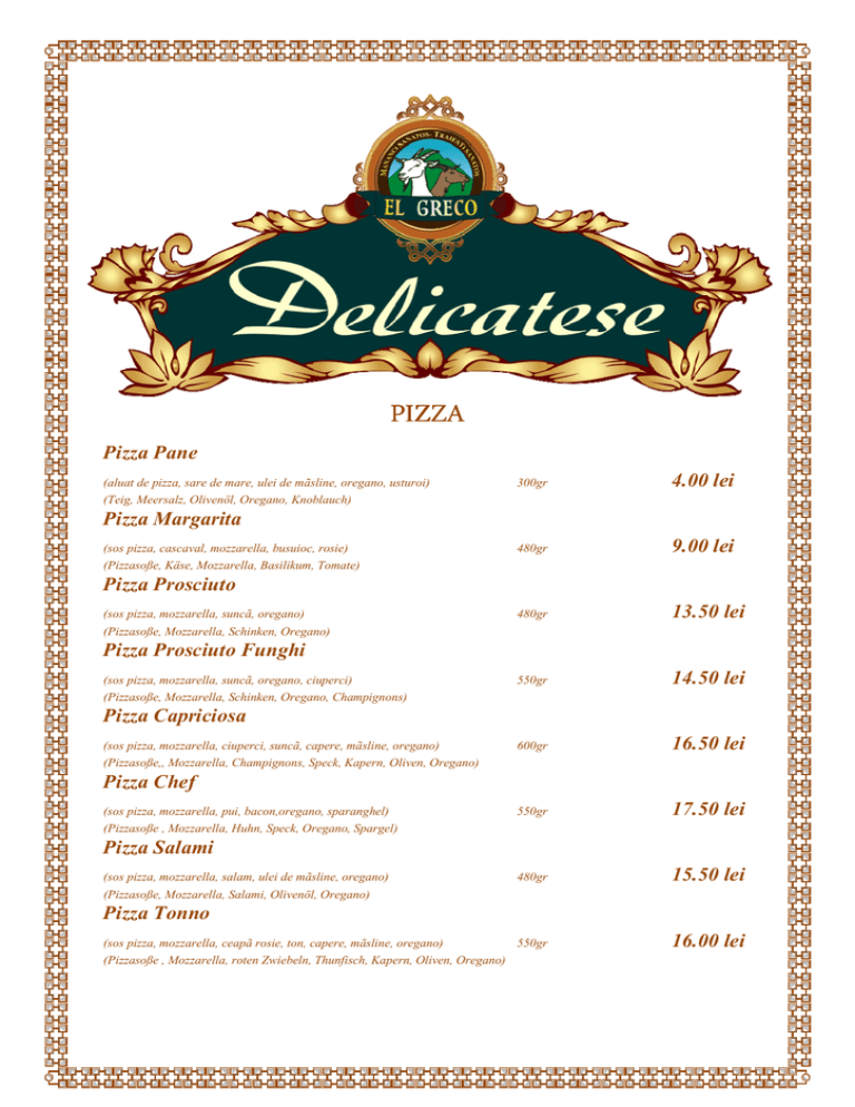 PIZZA Pizza Pane 300gr 4.00 lei 480gr 9.00 lei 480gr 13.50 lei 550gr 14.50 lei 600gr 16.50 lei 550gr 17.50 lei 480gr 15.50 lei (sos pizza, mozzarella, ceapã rosie, ton, capere, mãsline, oregano) 550gr (Pizzasoße , Mozzarella, roten Zwiebeln, Thunfisch, Kapern, Oliven, Oregano) 16.00 lei (aluat de pizza, sare de mare, ulei de mãsline, oregano, usturoi) (Teig, Meersalz, Olivenöl, Oregano, Knoblauch) Pizza Margarita (sos pizza, cascaval, mozzarella, busuioc, rosie) (Pizzasoße, Käse, Mozzarella, Basilikum, Tomate) Pizza Prosciuto (sos pizza, mozzarella, suncã, oregano) (Pizzasoße, Mozzarella, Schinken, Oregano) Pizza Prosciuto Funghi (sos pizza, mozzarella, suncã, oregano, ciuperci) (Pizzasoße, Mozzarella, Schinken, Oregano, Champignons) Pizza Capriciosa (sos pizza, mozzarella, ciuperci, suncã, capere, mãsline, oregano) (Pizzasoße,, Mozzarella, Champignons, Speck, Kapern, Oliven, Oregano) Pizza Chef (sos pizza, mozzarella, pui, bacon,oregano, sparanghel) (Pizzasoße , Mozzarella, Huhn, Speck, Oregano, Spargel) Pizza Salami (sos pizza, mozzarella, salam, ulei de mãsline, oregano) (Pizzasoße, Mozzarella, Salami, Olivenöl, Oregano) Pizza Tonno Pizza Vegetarianã (sos pizza, mozzarella, ciuperci, ardei, mãsline, broccoli, porumb, oregano) 550gr (Pizzasoße, Mozzarella, Champignons, Paprika, Oliven, Brokkoli, Mais, Oregano) 15.00 lei Pizza Diavolo 550gr 16.50 lei (sos pizza, mozzarella, bacon, pui, mãsline, ardei, ciuperci, oregano) 600gr (Pizzasoße, Mozzarella, Speck, Huhn, Oliven, Paprika, Champignons, Oregano) 16.50 lei (sos pizza, mozzarella, salam, peperoni, ulei de mãsline, oregano) (Pizzasoße, Mozzarella, Salami, Peperoni, Olivenöl, Oregano) Pizza Quatro Stagioni Pizza Delicatese (sos pizza, mozzarela, carne tocatã, oregano, ceapã rosie) (Pizzasoße, Mozzarella, Hackfleisch, Oregano, rote Zwiebel) 550gr 16.00 lei 500gr 15.50 lei 500gr 16.00 lei Pizza Calzone (sos pizza, mozzarella, gorgonzola, suncã, ciuperci, oregano) (Pizzasoße, Mozzarella, Gorgonzola, Speck, Champignons, Oregano) Pizza Quatro Formaggi (sos pizza, oregano, patru feluri de branzã) (Pizzasoße, Oregano, vier Käsesorten) Pizza 'EL GRECO(sos pizza, mozzarella, bacon, cârnati picant, suncã, salam, ou in mijloc, oregano) 650gr (Pizzasoße, Mozzarella, Speck, Wurst, würziger Schinken, Salami, Ei in der Mitte, Oregano) 18.50 lei Pizza Napoli (sos pizza, mozzarella, sardine, capere, oregano) (Pizzasoße, Mozzarella, Sardellen, Kapern, Oregano) 500gr 17.50 lei 550gr 17.50 lei 500gr 18.50 lei 550gr 16.00 lei Pizza Hawai (sos pizza, mozzarella, suncã, ananas, cascaval, oregano) (Pizzasoße, Mozzarella, Schinken, Ananas, Käse, Oregano) Pizza Siciliana (sos pizza, mozzarella, sardine, capere, mãsline, oregano) (Pizzasoße, Mozzarella, Sardellen, Kapern, Oliven, Oregano) Pizza California (sos pizza, mozzarella, suncã, porumb, ciuperci, oregano) (Pizzasoße, Mozzarella, Schinken, Mais, Champignons, Oregano) Pizza Mexicana (sos pizza, mozzarella, cârnati afumat, fasole, amestec mexican, oregano, peperoni) 550gr (Pizzasoße, Mozzarella, geräucherter Wurst, Bohnen, mexikanisches Gemisch,Oregano, Peperoni) 16.00 lei Pizza Norberto (sos pizza, mozzarella, salam, suncã, ciuperci, oregano) (Pizzasoße, Mozzarella, Salami, Schinken, Champignons, Oregano) 550gr 16.50 lei 550gr 18.50 lei Pizza Quatro Carni (sos pizza, mozzarella, salam, suncã, bacon, piept de pui, oregano) (Pizzasoße, Mozzarella, Salami, Schinken, Speck, Huhn, Oregano) Pizza Pablo (sos pizza, mozzarella, piept de pui, cartofi pai, cascaval afumat, oregano) (Pizzasoße, Mozzarella, Huhn, Französisch frites, geräucherter Käse, Oregano) 500gr 17.50 lei Pizza Prosciuto Crudo (sos pizza, mozzarella, rosii, prosciutto crudo, rucola, sos balsamico) (Pizzasoße, Mozzarella, Tomaten, Schinken crudo, Rucola, Balsamicosoße) 550gr 19.50 lei 550gr 18.50 lei Pizza Carbonara (sos alb, mozzarella, bacon, ou, parmesan) (Weissesoße, Mozzarella, Speck, Ei, Parmesan) SOSURI Soßen Sos alb 80gr 2.00 lei 80gr 2.00 lei Wiessessoße Sos rosu Rotessoße