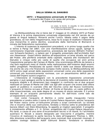 DALLA SENNA AL DANUBIO 1873 – L’Esposizione universale di Vienna. L’acquario del Prater e le carpe del principe di Schwartzenberg Le carpe, le tinche, le anguille, le rane pescatrici, i lucci erano di misure enormi. G. Bouchon-Brandely, Traité de pisciculture (1876) La Weltausstellung che si tiene dal 1o maggio al 31 ottobre 1873 al Prater di Vienna è la prima esposizione universale organizzata nel XIX secolo da un paese di lingua tedesca. Rimarrà anche l’unica. Ideata sotto il segno della grandezza, se non della megalomania, essa ha lo scopo di esaltare il blasone di una monarchia in pieno declino, scavalcata dalla Germania di Bismarck e minata dal federalismo nazionalista. L’intento di superare le esposizioni precedenti, e in primo luogo quella che si tenne à Parigi nel 1867, con una manifestazione senza uguali, spinge la commissione imperiale organizzatrice, presieduta dal barone Wilhelm Freiherr von Schwartz-Senborn, a optare per il progetto presentato dall’architetto Karl von Hasenauer. Quest’ultimo destina all’esposizione un’area situata nel parco del Prater, alla periferia orientale della capitale, esposta alle inondazioni del Danubio e cinque volte più vasta di quella che occupava sei anni prima l’esposizione parigina del Campo di Marte. Una scommessa difficile da tenere e che farà registrare mesi di ritardo nella realizzazione dell’insieme degli enormi edifici progettati. Penalizzata da questi ritardi e dalle sue stesse dimensioni, ma anche da una crisi finanziaria europea molto severa, la Weltausstellung del 1873 entra negli annali delle esposizioni universali come una delle esposizioni universali più economicamente rovinose, con un pesantissimo deficit per le casse dell’impero austro-ungarico. L’intenzione di rivaleggiare con la precedente Esposizione universale parigina ci può spiegare anche la decisione di investire nella realizzazione di un acquario stabile e di dimensioni ben maggiori in confronto sia ai due acquari realizzati al Campo di Marte nel 1867 sia agli altri acquari che erano stati allora aperti al pubblico in svariate città del Vecchio come del Nuovo Continente. L’acquario di Vienna occupa al Prater, di fronte al Danubio, un vasto edificio di stile rinascimentale, una sede degna di un museo di storia naturale. È il primo esempio di un acquario permanente ideato fin dall’inizio come tale da un’esposizione universale. Così come l’acquario di Berlino e come quello inaugurato l’anno precedente a Londra sotto il nome di Crystal Palace Aquarium, anche l’acquario del Prater nasce come un’istituzione privata a scopi commerciali. La società che si incarica della sua costruzione, fondata a Vienna sotto la presidenza del barone Albert von Klein-Wisenberg, fa appello ai migliori specialisti. Il progetto è inizialmente affidato a C. H. Driver, progettista del Crystal Palace Aquarium. Più tardi, a causa di una serie d’inconvenienti tecnici e di ritardi, fu l’architetto austriaco H. Novak a essere designato per tracciarne il progetto, mentre l’incarico di realizzare la parte tecnica fu dato all’ingegnere Thomas L. Witt. Alla direzione scientifica dell’acquario sono nominati due scienziati rinomati: il celebre zoologo tedesco Adolf Edmund Brehm, fondatore e direttore 2 dell’acquario di Berlino e il naturalista Simeone de Syrski, direttore a Trieste del nuovo Museo municipale Ferdinando Massimiliano. Lo stato attuale delle nostre ricerche non permette ancora di conoscere in dettaglio le specie esposte così come le attività di questo acquario. Le fonti pubblicate testimoniano tuttavia che alla sua inaugurazione, il 29 giugno 1873, è dotato di vasche per pesci e crostacei sia di acqua dolce che di acqua marina, con una netta preferenza per le specie locali dei fiumi austriaci e del mar Adriatico. All’entrata, i visitatori trovavano una fontana decorata da affreschi con simboli della vita acquatica: Per essere un acquario lontano dalla costa, - scrive Brehm – l’acquario di Vienna al Prater è fin troppo grande, visto che occupa una superficie di 500 braccia quadrate. Non si tratta di un acquario a grotta, come negli stabilimenti di Hannover, Berlino e Bruxelles, ma a galleria di vasche. Il visitatore passeggia attraverso delle gallerie e delle sale che non sono molto diverse da quelle degli altri edifici. Può guardare le vasche di fronte o dall’alto. Queste sono tutte simili tra di loro e hanno tutte le pareti ricoperte da rocce. Mentre un acquario a grotta si sforza di far leva sull’immaginazione del visitatore mediante percorsi sottomarini che sembrano naturali con antri e caverne prodotti dall’erosione dell’acqua, ‒ celando ogni traccia di intervento della mano dell’uomo ‒, al contrario, nell’acquario a vasche prevale la linearità. Qui la riproduzione delle rocce si limita quasi esclusivamente alla decorazione interna delle vasche. Entrambi questi stili, se così si può dire, trovano dei sostenitori tra gli specialisti e i visitatori. Riguardo ai primi, ce ne sono che pensano che per esporre animali marini importanti, poco conosciuti e che vivono lontano dalle coste, non ci sia bisogno di stimolare l’immaginazione dello spettatore con degli elementi accessori. Viceversa altri pensano che il fascino misterioso delle grotte artificiali mediante la simulazione di caverne sottomarine (anche se in fondo ai mari se ne trovano raramente), stalattiti e con un’illuminazione sapiente contribuiscano a strappare il visitatore dal mondo che lo circonda. Grazie all’atmosfera che si crea in questo modo, tutti possono scoprire che il fondo del mare «brulica una ressa spaventosa» [Schiller]. (E. Brehm, “Aus dem Wiener Aquarium”, Internationale Ausstellungs-Zeitung, 22 Juli 1873, p. 1872). Una volta terminata l’Esposizione universale, la gestione dell’acquario incontra nel corso degli anni delle difficoltà finanziarie che comportano cambiamenti di proprietà e anche di funzione. Dapprima