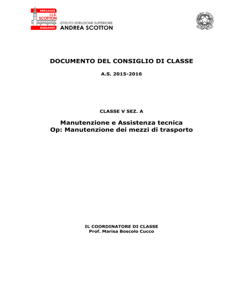 DOCUMENTO DEL CONSIGLIO DI CLASSE A.S. 2015-2016 CLASSE V SEZ. A Manutenzione e Assistenza tecnica Op: Manutenzione dei mezzi di trasporto IL COORDINATORE DI CLASSE Prof. Marisa Boscolo Cucco INDICE 1 PRESENTAZIONE DELL’ISTITUTO 1a LUOGO 1b CONTESTO 1c QUALIFICHE FORNITE Pag. 2 2 PROFILO GENERALE E STRUMENTI 2a FIGURA RISULTATO: TECNICO DELLA MANUTENZIONE E ASSISTENZA TECNICA 2b ORARIO UTILIZZATO Pag. 2 3 PRESENTAZIONE DELLA CLASSE 3a STORIA 3b CONTINUITA’ DIDATTICA 3c SITUAZIONE DI PARTENZA ANNO PRECEDENTE 3d COMPONENTI DEL CONSIGLIO DI CLASSE Pag. 2 4 OBIETTIVI RAGGIUNTI 4a COMPORTAMENTO E CAPACITA’ RELAZIONALI 4b CONOSCENZE 4c ABILITA’ 4d COMPETENZE 4e OBIETTIVI DEL CONSIGLIO DI CLASSE 4f OBIETTIVI DI OGNI MATERIA Pag. 3 5 ALTERNANZA SCUOLA LAVORO 5a DESCRIZIONE CORSO 5b COMPETENZE DI BASE 5c COMPETENZE TECNICO PROFESSIONALI 5d COMPETENZE TRASVERSALI Pag. 5 6 ATTIVITA’ EXTRA-PARA-INTER-CURRICOLARI 6a VIAGGI DI ISTRUZIONE 6b INCONTRI- ATTIVITA’ CULTURALI Pag. 6 7 ATTIVITA’ INTERDISCIPLINARI 7a TESTI SIMULAZIONI PRIME PROVE CON GRIGLIE DI VALUTAZIONE 7b TESTI SIMULAZIONI SECONDE PROVE CON GRIGLIE DI VALUTAZIONE 7c TESTI SIMULAZIONI TERZE PROVE CON GRIGLIE DI VALUTAZIONE 7e CALENDARIO DELLE PROVE Pag. 6 8 RAPPORTI CON LE FAMIGLIE 8a DATE VISITONI Pag. 7 9 CRITERI DI VALUTAZIONE 9a CRITERI DI ASSEGNAZIONE CREDITI SCOLASTICI 9b CREDITI SCOLASTICI 9c CREDITI FORMATIVI 9d TABELLA ASSEGNAZIONE CREDITO SCOLASTICO Pag. 8 10 GRIGLIA DI VALUTAZIONE APPROVATA DAL COLLEGIO DOCENTI Pag.9 11 PROGRAMMI DELLE SINGOLE DISCIPLINE ALLEGATI: 1. 2. 3. 4. Pag.10 RELAZIONI FINALI DELLE SINGOLE MATERIE SIMULAZIONI PRIMA PROVA E RELATIVE GRIGLIE DI VALUTAZIONE SIMULAZIONI SECONDA PROVA E RELATIVE GRIGLIE DI VALUTAZIONE SIMULAZIONI TERZA PROVA E RELATIVE GRIGLIE DI VALUTAZIONE D.C.C. Classe V A a.s. 2015/2016 Pag.1 1 - PRESENTAZIONE DELL’ISTITUTO 1a – LUOGO L’Istituto Professionale di Stato per l’Industria e l’Artigianato “Andrea Scotton” è sito a Breganze, comune del vicentino collocato nella zona nord della provincia. Il bacino di utenza degli studenti si estende fino ai comuni di Thiene, Schio, Bassano del Grappa, Asiago, Dueville. 1b – CONTESTO L’istituto è dislocato in un’area caratterizzata da un tessuto produttivo altamente dinamico: allevamento e viticoltura hanno un peso non indifferente nel settore primario, come da tradizione, mentre occorre sottolineare la notevole influenza, in ambito occupazionale, delle attività dedite al comparto meccanico, edilizio e dell’abbigliamento. Questi e ulteriori tipologie di insediamenti produttivi fanno sì che, precedentemente all’attuale crisi economica, il fenomeno della disoccupazione fosse assai limitato in tale porzione di territorio. 1c - QUALIFICHE FORNITE Attualmente nella sede di P.zza del Donatore sono presenti, per il settore Industria e Artigianato, i percorsi quinquennali Manutenzione e Assistenza Tecnica (Curvatura Meccanica) e l’opzione Manutenzione dei mezzi di trasporto (per la classe in oggetto). 2 - PROFILO GENERALE E STRUMENTI 2a - FIGURA RISULTATO: TECNICO DELLA MANUTENZIONE E ASSISTENZA TECNICA opzione Manutenzione dei mezzi di trasporto. Il profilo generale tracciato nell’ambito scolastico per l’Indirizzo è così definito: “l’allievo deve avere una adeguata preparazione di base nell’area linguistica, letteraria e scientifica al fine di saper affrontare con correttezza di espressione e sicurezza nelle cognizioni fondamentali le molteplicità delle situazioni applicative del lavoro; deve avere la flessibilità per risolvere problematiche con modelli e sistemi acquisiti sia all’interno della scuola che nell’ambiente dove si trova ad operare.” Il profilo specifico tracciato nell’ambito scolastico per l’Indirizzo è così definito: “il diplomato di istruzione professionale nell’indirizzo “Manutenzione e assistenza tecnica” possiede le competenze per gestire, organizzare ed effettuare interventi di installazione e manutenzione ordinaria, di diagnostica, riparazione e collaudo relativamente a piccoli sistemi, impianti e apparati tecnici nell’ambito meccanico. Nell’indirizzo “Manutenzione e assistenza tecnica”, l’opzione “Manutenzione mezzi di trasporto” specializza e integra le conoscenze e competenze in uscita dall’indirizzo, coerentemente con la filiera produttiva di riferimento e con le esigenze del territorio, con competenze rispondenti ai fabbisogni delle aziende impegnate nella manutenzione di apparati e impianti inerenti i mezzi di trasporto di interesse, terrestri, aerei o navali, e relativi servizi tecnici.” 2b - ORARIO UTILIZZATO L’orario delle lezioni si sviluppa dal Lunedì al Venerdì, dalle ore 7.27 alle ore 12.42, in moduli orari da 50 minuti l’uno e un pomeriggio alla settimana dalle ore 13.42 alle 17.22. 3 - PRESENTAZIONE DELLA CLASSE 3a – STORIA La classe è composta da 22 alunni di cui quattro ripetenti. Per gli allievi Bes e DSA sono state depositati presso la segreteria didattica gli allegati con descritte nel dettaglio motivazioni e modalità di effettuazione delle prove d’esame. 3b - CONTINUITA’ DIDATTICA Numerosi sono stati i cambiamenti di insegnanti, che si sono succeduti nelle varie discipline durante il quinquennio di studi, sia nell’area comune sia nell’area tecnica. In continuità didattica dalla prima risulta solo la lingua inglese, dalla quarta invece Tecnologie Meccaniche e Applicazioni e matematica. D.C.C. Classe V A a.s. 2015/2016 Pag.2 3c - SITUAZIONE DI PARTENZA ANNO PRECEDENTE La classe ha terminato il quarto anno con debiti formativi soprattutto in matematica, inglese e tecnologie meccaniche e applicazioni. 3d – COMPONENTI DEL CONSIGLIO DI CLASSE Cognome Nome Ore Bassanese Pietro 3 Elettrotecnica ed Elettronica X Borghesan Rosanna 4 Italiano X Borghesan Rosanna 2 Storia X Marisa 5 Tecnologie Meccaniche e Applicazioni X Marisa 7 Tecnologie e Tecniche di Diagnostica e Manutenzione X Munari Nicolò 4 Laboratori 