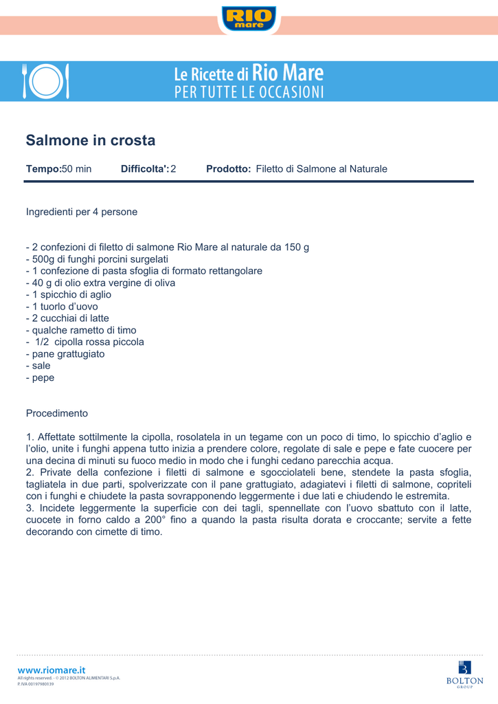 Salmone in crosta Tempo:50 min Difficolta': 2 Prodotto: Filetto di Salmone al Naturale Ingredienti per 4 persone - 2 confezioni di filetto di salmone Rio Mare al naturale da 150 g - 500g di funghi porcini surgelati - 1 confezione di pasta sfoglia di formato rettangolare - 40 g di olio extra vergine di oliva - 1 spicchio di aglio - 1 tuorlo d’uovo - 2 cucchiai di latte - qualche rametto di timo - 1/2 cipolla rossa piccola - pane grattugiato - sale - pepe Procedimento 1. Affettate sottilmente la cipolla, rosolatela in un tegame con un poco di timo, lo spicchio d’aglio e l’olio, unite i funghi appena tutto inizia a prendere colore, regolate di sale e pepe e fate cuocere per una decina di minuti su fuoco medio in modo che i funghi cedano parecchia acqua. 2. Private della confezione i filetti di salmone e sgocciolateli bene, stendete la pasta sfoglia, tagliatela in due parti, spolverizzate con il pane grattugiato, adagiatevi i filetti di salmone, copriteli con i funghi e chiudete la pasta sovrapponendo leggermente i due lati e chiudendo le estremita. 3. Incidete leggermente la superficie con dei tagli, spennellate con l’uovo sbattuto con il latte, cuocete in forno caldo a 200° fino a quando la pasta risulta dorata e croccante; servite a fette decorando con cimette di timo.