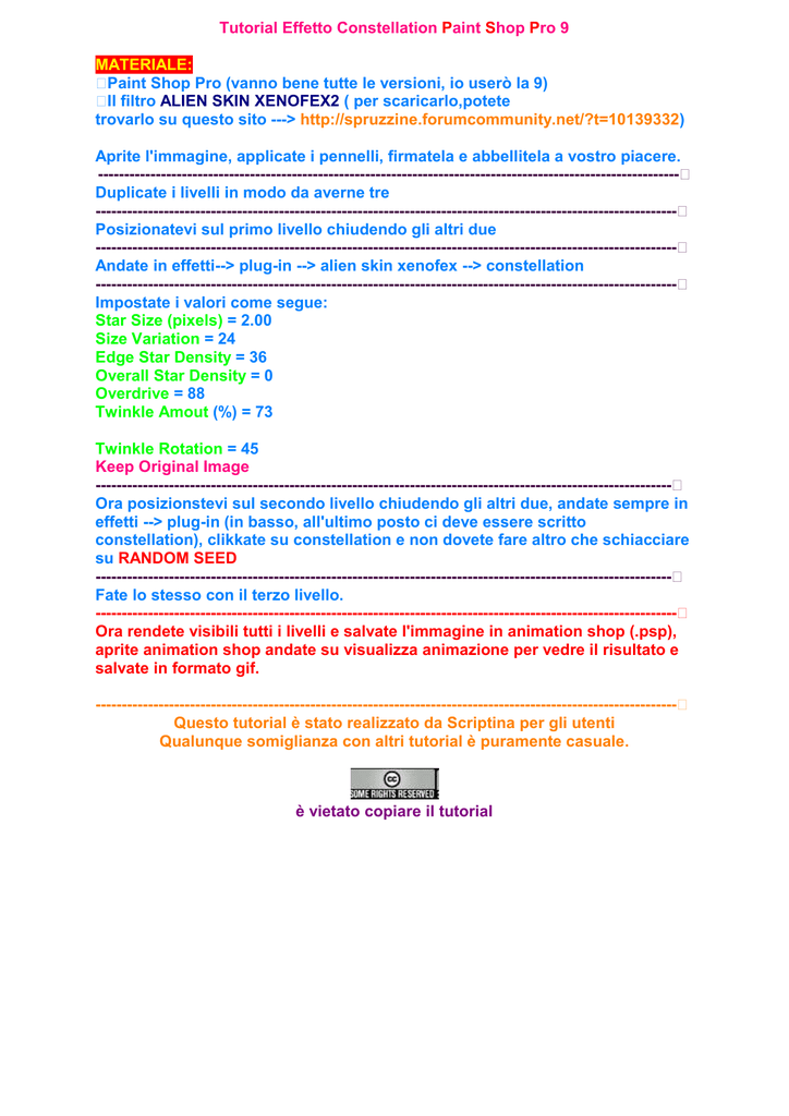 Tutorial Effetto Constellation Paint Shop Pro 9 MATERIALE: Paint Shop Pro (vanno bene tutte le versioni, io userò la 9) Il filtro ALIEN SKIN XENOFEX2 ( per scaricarlo,potete trovarlo su questo sito ---> http://spruzzine.forumcommunity.net/?t=10139332) Aprite l'immagine, applicate i pennelli, firmatela e abbellitela a vostro piacere. --------------------------------------------------------------------------------------------------------------Duplicate i livelli in modo da averne tre --------------------------------------------------------------------------------------------------------------Posizionatevi sul primo livello chiudendo gli altri due --------------------------------------------------------------------------------------------------------------Andate in effetti--> plug-in --> alien skin xenofex --> constellation --------------------------------------------------------------------------------------------------------------Impostate i valori come segue: Star Size (pixels) = 2.00 Size Variation = 24 Edge Star Density = 36 Overall Star Density = 0 Overdrive = 88 Twinkle Amout (%) = 73 Twinkle Rotation = 45 Keep Original Image -------------------------------------------------------------------------------------------------------------Ora posizionstevi sul secondo livello chiudendo gli altri due, andate sempre in effetti --> plug-in (in basso, all'ultimo posto ci deve essere scritto constellation), clikkate su constellation e non dovete fare altro che schiacciare su RANDOM SEED -------------------------------------------------------------------------------------------------------------Fate lo stesso con il terzo livello. --------------------------------------------------------------------------------------------------------------Ora rendete visibili tutti i livelli e salvate l'immagine in animation shop (.psp), aprite animation shop andate su visualizza animazione per vedre il risultato e salvate in formato gif. --------------------------------------------------------------------------------------------------------------Questo tutorial è stato realizzato da Scriptina per gli utenti Qualunque somiglianza con altri tutorial è puramente casuale. è vietato copiare il tutorial
