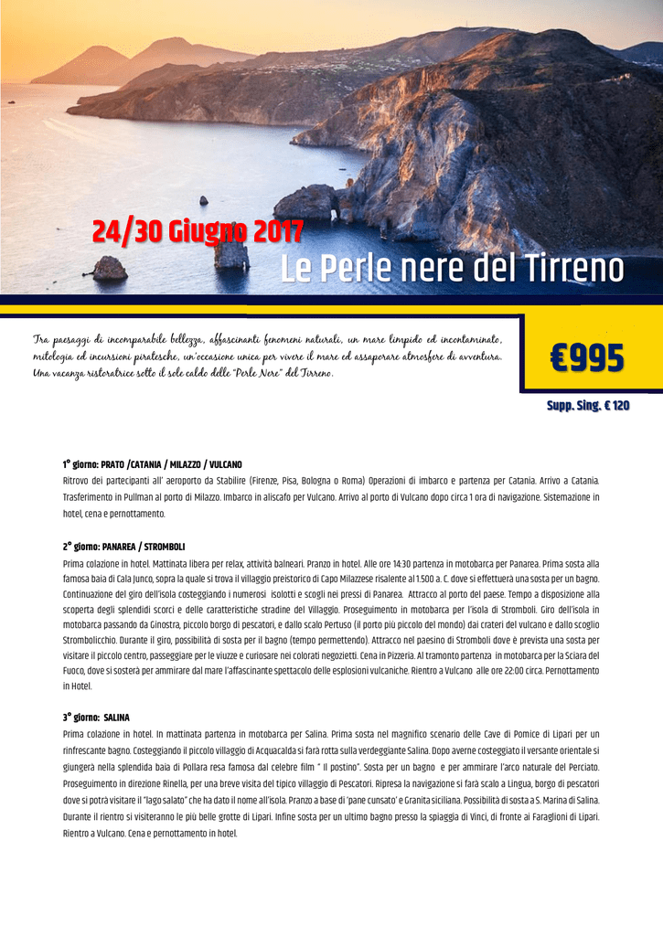 24/30 Giugno 2017 Le Perle nere del Tirreno Tra paesaggi di incomparabile bellezza, affascinanti fenomeni naturali, un mare limpido ed incontaminato, mitologia ed incursioni piratesche, un’occasione unica per vivere il mare ed assaporare atmosfere di avventura. Una vacanza ristoratrice sotto il sole caldo delle “Perle Nere” del Tirreno. €995 Supp. Sing. € 120 1° giorno: PRATO /CATANIA / MILAZZO / VULCANO Ritrovo dei partecipanti all’ aeroporto da Stabilire (Firenze, Pisa, Bologna o Roma) Operazioni di imbarco e partenza per Catania. Arrivo a Catania. Trasferimento in Pullman al porto di Milazzo. Imbarco in aliscafo per Vulcano. Arrivo al porto di Vulcano dopo circa 1 ora di navigazione. Sistemazione in hotel, cena e pernottamento. 2° giorno: PANAREA / STROMBOLI Prima colazione in hotel. Mattinata libera per relax, attività balneari. Pranzo in hotel. Alle ore 14:30 partenza in motobarca per Panarea. Prima sosta alla famosa baia di Cala Junco, sopra la quale si trova il villaggio preistorico di Capo Milazzese risalente al 1.500 a. C. dove si effettuerà una sosta per un bagno. Continuazione del giro dell’isola costeggiando i numerosi isolotti e scogli nei pressi di Panarea. Attracco al porto del paese. Tempo a disposizione alla scoperta degli splendidi scorci e delle caratteristiche stradine del Villaggio. Proseguimento in motobarca per l’isola di Stromboli. Giro dell’isola in motobarca passando da Ginostra, piccolo borgo di pescatori, e dallo scalo Pertuso (il porto più piccolo del mondo) dai crateri del vulcano e dallo scoglio Strombolicchio. Durante il giro, possibilità di sosta per il bagno (tempo permettendo). Attracco nel paesino di Stromboli dove è prevista una sosta per visitare il piccolo centro, passeggiare per le viuzze e curiosare nei colorati negozietti. Cena in Pizzeria. Al tramonto partenza in motobarca per la Sciara del Fuoco, dove si sosterà per ammirare dal mare l’affascinante spettacolo delle esplosioni vulcaniche. Rientro a Vulcano alle ore 22:00 circa. Pernottamento in Hotel. 3° giorno: SALINA Prima colazione in hotel. In mattinata partenza in motobarca per Salina. Prima sosta nel magnifico scenario delle Cave di Pomice di Lipari per un rinfrescante bagno. Costeggiando il piccolo villaggio di Acquacalda si farà rotta sulla verdeggiante Salina. Dopo averne costeggiato il versante orientale si giungerà nella splendida baia di Pollara resa famosa dal celebre film “ Il postino”. Sosta per un bagno e per ammirare l’arco naturale del Perciato. Proseguimento in direzione Rinella, per una breve visita del tipico villaggio di Pescatori. Ripresa la navigazione si farà scalo a Lingua, borgo di pescatori dove si potrà visitare il “lago salato” che ha dato il nome all’isola. Pranzo a base di ‘pane cunsato’ e Granita siciliana. Possibilità di sosta a S. Marina di Salina. Durante il rientro si visiteranno le più belle grotte di Lipari. Infine sosta per un ultimo bagno presso la spiaggia di Vinci, di fronte ai Faraglioni di Lipari. Rientro a Vulcano. Cena e pernottamento in hotel. 4° giorno: FILICUDI /ALICUDI Prima colazione in hotel, partenza in motobarca per l’isola di Filicudi. Raggiunta l’isola, sosta per un indimenticabile bagno alla Grotta del Bue Marino. Continuando il giro, visita ai Faraglioni Montenassari, Giafante e soprattutto La Canna, neck vulcanico alto 85 mt.. Sosta a Filicudi porto per la visita del paese. Possibilità di visita al villaggio preistorico di Capo Graziano. Maccherronata a bordo. Nel pomeriggio proseguimento per l’isola di Alicudi, la più isolata e selvaggia dell’arcipelago, dove il tempo sembra essersi fermato. Tempo a disposizione per una magica passeggiata lungo la mulattiera o per un rinfrescante bagno. Rientro a Lipari. Cena e pernottamento in hotel. 5° giorno: LIPARI Prima colazione in hotel. In mattinata trasferimento in motobarca a Lipari. Giro dell’ isola in pullman di Lipari con sosta al belvedere di Quattrocchi (per ammirare dall’alto Vulcano), al belvedere di Quattropani (con vista panoramica su Salina) e alle affascinanti Cave di Pomice. Pranzo in ristorante. Nel pomeriggio passeggiata per il centro storico che ospita il celebre Museo Archeologico con reperti, che risalgono al 4.000 a.C.. Possibilità di acquistare il vino tipico Eoliano “ Malvasia” e i famosi capperi. Rientro a Vulcano. Cena e pernottamento in hotel. 6° giorno: VULCANO Dopo la prima colazione, giro dell’isola di Vulcano in motobarca per scoprire Vulcanello e la Valle dei Mostri; sosta alla Grotta del Cavallo e alla Piscina di Venere per un bagno. Il giro dell’Isola prosegue fino al piccolissimo borgo di Gelso, dove si sosterà per un altro rinfrescante bagno. Pranzo in hotel. Nel pomeriggio tempo libero a disposizione. Possibilità di bagno nei fanghi termali, nelle acque sulfuree. Rientro a Vulcano, cena e pernottamento in hotel. 7° giorno: VULCANO / MILAZZO / CATANIA Prima colazione in hotel. Trasferimento al porto di Vulcano. Imbarco in aliscafo per Milazzo. Trasferimento in Pullman all’aeroporto di Catania. Operazioni di imbarco e partenza per l’aeroporto di andata . LA QUOTA COMPRENDE: Passaggio aereo da FLR, PSA, BLQ, o ROMA, Tasse di imbarco aeroportuali, Franchigia bagaglio in stiva: nr. 1 bagaglio max 20 kg, Trasferimenti Aeroporto di Catania / Porto di Milazzo / Aeroporto di Catania, Passaggio in Aliscafo Milazzo Vulcano / Milazzo, Trasferimenti bagagli a Vulcano porto - Hotel - porto , Sistemazione in camere doppie con servizi privati Pensione Completa, Bevande ai pasti in hotel e ristoranti (1/4 di vino + ½ minerale), Giro in motobarca di Panarea/Stromboli, Giro in motobarca di Filicudi/Alicudi, Giro in motobarca di Salina, Giro in motobarca di Vulcano, Giro in Pullman di Lipari, Servizio di guida locale mezza giornata a Lipari, Assicurazione Europ Assistance medico-nostop e bagaglio, Tassa di ingresso alle Isole Eolie (in vigore ad oggi), Accompagnatore LA QUOTA NON COMPRENDE: Trans