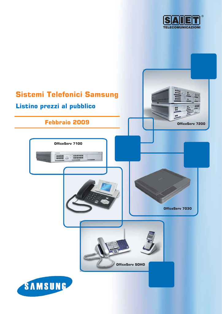 ® TELECOMUNICAZIONI Sistemi Telefonici Samsung Listino prezzi al pubblico Febbraio 2009 OfficeServ 7200 OfficeServ 7100 OfficeServ 7030 OfficeServ SOHO ® TELECOMUNICAZIONI Sistema DCS 408i Il sistema DCS 408i è stato progettato e realizzato per piccole aziende ed uffici, pur offrendo a costi estremamente competitivi, le stesse funzionalità che vi aspettereste da centrali più sofisticate. Capacità massima 12 porte. Servizi offerti: ISDN, LCR, UCD, ID chiamante e molti altri. Descrizione Il Sistema Digitale Samsung "DCS 408i" presenta un equipaggiamento costituito da: ã n. 2 accessi base (BRI) gestiti con protocollo EURO ISDN ã n. 8 attacchi per linee interne, equamente suddivisi in 4 attacchi per terminali digitali (1B+D) e 4 attacchi per terminali analogici. Gli accessi base BRI sono liberamente configurabili come interfacce verso la rete pubblica e/o come bus interni S0. Servizi interni Servizi di sistema Visualizzazione display ã Ascolto di gruppo ã Indicatori luminosi a tre colori ã Indicazione dei messaggi di ã ã ã ã ã ã ã ã ã ã ã attesa ã ã ã ã ã Selezione diretta di interno Selezione nominale Tasti funzione interattivi Tasti programmabili Codici commessa Caratteristiche ã 4 Interni digitali, 4 interni BCA ã Scheda 2 accessi base BRI T0/S0 ISDN ã LCR Instradamento multigestore LCR 2 Accessi base ISDN (BRI) Bus S0 Cerca persone interno Codici di commessa Codici di autorizzazione Conferenza/deviazione/trasferta da Iinea a Iinea ã Corrispondenza numeri/nomi ã Operatività con cuffia ã Distribuzione unifome delle (CLlP) ã Integrazione Voice Mail ã Lista dei nomi al costo minimo ã UCD Mini Call-Center integrato ã Numeri brevi: max 300 Listino al Pubblico IVA esclusa Febbraio 2009 - Pagina 2 di 40 Dati UCD Durata della conversazione Identificazione chiamata di gruppo ã Identificazione del numero di linea urbana ã ã ã ã Segnalazione dell'inclusione ã ã ã ã ã Informazioni su conferenza chiamate (UCD) ã Identificativo della linea entrante Data ed ora Identificazione delle richiamate Identificazione delle trasferte Informazioni ISDN CLIP con nome e numero Messaggi programmati Numero delle chiamate in attesa Numero selezionato Programmazione di interno ® TELECOMUNICAZIONI Schema connessioni Codice Cod. Samsung Prodotto Descrizione Euro Sistema DCS408i 17300135 KP408IM Centralino DCS408i (2BRI/4DIG/4BCA) ISDN KP408IB2B Scheda 2 BRI ISDN n Opzioni â â â â â â â 17301953 KPOPT-BDP4 DPH (citofono) â â 17302054 KP40D-BDPI Modulo DPIM â 17321454 KPVM4-ME Voice Mail esterno SVM-400 17300236 15005290 Grup. bat. 48V-7,2 Ah â â Cabinet/Alimentatore con caricabatterie CPU/RAM pack 2 accessi base BRI ISDN 4 linee interne digitali (B+D) 4 linee interne analogiche 1 uscita seriale RS 232 1 ingresso musica 780,00 Scheda per 2 accessi base (2B+D) 265,00 Il citofono deve essere collegato alla interfaccia DPIM e può essere montato solo a parete 42,00 L'interfaccia citofonica deve essere collegata ad una porta digitale delle schede DLI 125,00 Sistema di Voice Mail a 2 canali (espandibile a 4) Vedi Parti Comuni Gruppo batteria di emergenza composto da 4 elementi da 12V - 7,2 Ah e da un fusibile che ne protegge l'utilizzo Listino al Pubblico IVA esclusa Febbraio 2009 - Pagina 3 di 40 Listino SAIET ® TELECOMUNICAZIONI Sistema DCS 816 Il sistema DCS 816 ideale per aziende di piccole dimensioni assicura a costi contenuti prestazioni e servizi tipici di sistemi di fascia più elevata. Capacità massima 24 porte. Servizi offerti: ISDN, LCR, UCD, ID chiamante e molti altri. Descrizione Il Sistema Digitale Samsung “DCS 816" presenta un equipaggiamento di base per 2 linee urbane analogiche e 16 derivati interni, ripartiti in 12 attacchi per terminali digitali (1B+D) e 4 attacchi per terminali analogici. Per quanto riguarda le linee urbane aggiuntive, il sistema è in grado di gestire linee urbane digitali di tipo BRI EURO ISDN, fino ad un massimo di 4, liberamente configurabili e analogiche, fino ad un massimo di 10, consentendo in tal modo di raggiungere la massima capacità di 26 porte. Il sistema “DCS 816" dispone anche di un sofisticato sistema di distribuzione delle chiamate entranti denominato UCD (Uniform Call Distribution) che, oltre alla gestione del servizio, consente ad un supervisore di conoscere costantemente lo stato di impegno dei vari operatori. Un’ulteriore importante applicazione standard è costituita dall’opzione LCR (Least Cost Routing) che, nell’ambito di una pluralità di fornitori del servizio telefonico, consente di selezionare automaticamente l’instradamento della chiamata urbana, interurbana, internazionale od intercontinentale, sulla rete, in quel momento, economicamente più conveniente. Sono, pure, disponibili altri servizi opzionali tra i quali, ad esempio, l’AUTOMATED ATTENDANT (Operatore Automatico), che, “guidando” il chiamante con messaggi vocali, garantisce l’accesso diretto agli interni, riducendo l’impegno dell’operatore. Caratteristiche ã ã ã ã ã ã 12 Interni digitali, 4 interni analogici (BCA) Scheda 2 o 4 accessi base BRI T0/S0 ISDN (max 1) LCR Instradamento multigestore al costo minimo UCD Mini Call-Center integrato AA Operatore Automatico Numeri brevi: max 500 I numeri brevi possono esserre suddivisi in max 300 di sistema e max 50 di interno Listino al Pubblico IVA esclusa Febbraio 2009 - Pagina 4 di 40 ® TELECOMUNICAZIONI Schema connessioni Codice Cod. Samgung Prodotto Descrizione Euro Sistema DCS 816 17300337 KP816DM2 Centralino DCS816 (2TRK/12DIG/4BCA) 17302155 KPOPT-BM1 Cavo di permutazione tipo “A” KP816DB4TM Scheda 4 TRK n Opzioni 17300741 17300842 KP816DB8TM Scheda 8 TRK 17301044 KP816DB2B Scheda 2 BRI ISDN 17301145 KP816DB4B Scheda 4 BRI ISDN 17300539 KP816DBI01 Scheda SIO1 â â â â â â â â â â â Cabinet/Alimentatore con caricabatterie CPU/RAM pack 2 linee urbane analogiche 12 linee interne digitali (B+D) 4 linee interne analogiche 1 Slot per scheda SIO1 (n. 2 RS 23