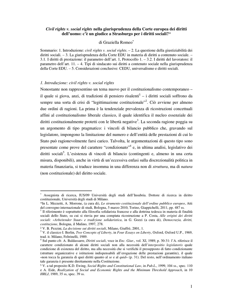 Civil rights v. social rights nella giurisprudenza della Corte europea dei diritti dell’uomo: c’è un giudice a Strasburgo per i diritti sociali?* di Graziella Romeo∗ Sommario: 1. Introduzione: civil rights v. social rights. – 2. La questione della giustiziabilità dei diritti sociali. – 3. La giurisprudenza della Corte EDU in materia di diritti a contenuto sociale. – 3.1. I diritti di prestazione: il parametro dell’art. 1, Protocollo 1. – 3.2. I diritti del lavoratore: il parametro dell’art. 11. – 4. Tipi di sindacato sui diritti a contenuto sociale nella giurisprudenza della Corte EDU. – 5. Considerazioni conclusive: CEDU, universalismo e diritti sociali. 1. Introduzione: civil rights v. social rights Nonostante non rappresentino un tema nuovo per il costituzionalismo contemporaneo – il quale si giova, anzi, di tradizioni di pensiero risalenti1 – i diritti sociali soffrono da sempre una sorta di crisi di “legittimazione costituzionale”2. Ciò avviene per almeno due ordini di ragioni. La prima è la tendenziale prevalenza di ricostruzioni concettuali affini al costituzionalismo liberale classico, il quale identifica il nucleo essenziale dei diritti costituzionalmente protetti con le libertà negative3. La seconda ragione poggia su un argomento di tipo pragmatico: i vincoli di bilancio pubblico che, gravando sul legislatore, impongono la limitazione del numero e dell’entità delle prestazioni di cui lo Stato può ragionevolmente farsi carico. Talvolta, le argomentazioni di questo tipo sono presentate come prove del carattere “condizionato”4 e, in ultima analisi, legislativo dei diritti sociali5. L’esistenza di vincoli di bilancio (contingenti e, almeno in una certa misura, disponibili), anche in virtù di un’eccessiva enfasi sulla discrezionalità politica in materia finanziaria, si traduce insomma in una differenza non di struttura, ma di natura (non costituzionale) del diritto sociale. Assegnista di ricerca, IUS/09 Università degli studi dell’Insubria. Dottore di ricerca in diritto costituzionale, Università degli studi di Milano. *In L. Mezzetti, A. Morrone, (a cura di), Lo strumento costituzionale dell’ordine pubblico europeo, Atti del convegno internazionale di studi, Bologna, 5 marzo 2010, Torino, Giappichelli, 2011, pp. 487 ss. 1 Il riferimento è soprattutto alla filosofia solidarista francese e alla dottrina tedesca in materia di finalità sociali dello Stato, su cui si rinvia per una compiuta ricostruzione a P. Costa, Alle origini dei diritti sociali: «Arbeitender Staat» e tradizione solidaristica, in G. Gozzi (a cura di), Democrazia, diritti, costituzione, Bologna, il Mulino, 1997, 278. 2 V. B. Pezzini, La decisione sui diritti sociali, Milano, Giuffrè, 2001, 1. 3 V. il classico I. Berlin, Two Concepts of Liberty, in Four Essays on Liberty, Oxford, Oxford U.P., 1969, trad. it. Milano, Feltrinelli, 1989. 4 Sul punto cfr. A. Baldassarre, Diritti sociali, voce in Enc. Giur., vol. XI, 1989, p. 30-31: l’A. riferisce il carattere condizionato di alcuni diritti sociali non alla necessità dell’interpositio legislatoris quale condizione di esistenza del diritto, ma alla necessità che si verifichi il presupposto di fatto condizionante (strutture organizzative e istituzioni indispensabili all’erogazione delle prestazioni garantite), il quale «non tocca la garanzia di quei diritti quanto al se e al quid» (p. 31). Del resto, nell’ordinamento italiano tale garanzia è presente direttamente nella Costituzione. 5 V. a tal proposito K.D. Ewing, Social Rights and Constitutional Law, in Pub.L., 1999, 104 ss., spec. 110 e A. Eide, Realization of Social and Economic Rights and the Minimum Threshold Approach, in 10 HRLJ, 1989, 35 ss, spec. 39 ss. ∗ 1 Sul piano internazionale, il Consiglio d’Europa nel momento in cui stende la Convenzione europea dei diritti dell’uomo sembra condividere l’impostazione concettuale del costituzionalismo liberale6: da un lato, include nel testo le sole libertà negative, codificando separatamente i diritti sociali undici anni più tardi, nella Carta sociale europea7; dall’altro decide di dotare questi ultimi di meccanismi di protezione più blandi, in quanto di carattere non giurisdizionale (v. infra)8. Inserita in questo contesto, la questione relativa alla protezione dei diritti di seconda generazione in ambito Cedu parrebbe essere superflua e, anzi, caratterizzata da una sorta di “strabismo”: è noto che non esiste una Corte competente a conoscere e sanzionare le violazioni dei diritti proclamati nella Carta sociale europea; perché dunque cercare una giurisprudenza sensibile a questo tipo di posizioni giuridiche nell’ambito di un ordinamento che decide a priori di lasciarle fuori dalla sua sfera di competenza?9 6 Osserva B. Pezzini (La decisione sui diritti sociali, cit., 157-158) come la Convenzione europea dei diritti dell’uomo riproponga «sul piano internazionale, una visione in qualche modo arcaica dei diritti fondamentali, quale quella … riduzionista ed ideologicamente liberista del costituzionalismo delle origini, che contrappone al nocciolo duro dei diritti di prima generazione il corpus separato dei diritti di seconda generazione». 7 Adottata a Torino il 18 ottobre 1961, successivamente modificata a Strasburgo il 3 maggio 1996 ed entrata in vigore nel 1999. Di recente “rilancio” della Carta e di valorizzazione del suo ruolo politico parla F. Olivieri, La Carta sociale europea tra enunciazione dei diritti, meccanismi di controllo e applicazione nelle Corti nazionali. La lunga marcia verso l’effettività, in Rivista di diritto della sicurezza sociale, 2008, 509 ss. 8 L’ unica (e rilevante) eccezione alla regola della codificazione separata dei diritti di prima e di seconda generazione è rappresentata dal diritto all’educazione riconosciuto all’art. 2 del Protocollo addizionale alla Convenzione, firmato a Parigi nel 1952. La sua inclusione non sembra una scelta arbi