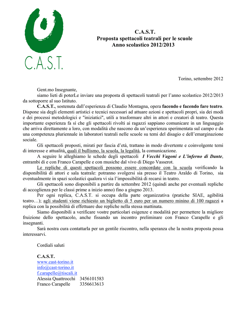 C.A.S.T. Proposta spettacoli teatrali per le scuole Anno scolastico 2012/2013 Torino, settembre 2012 Gent.mo Insegnante, siamo lieti di poterLe inviare una proposta di spettacoli teatrali per l’anno scolastico 2012/2013 da sottoporre al suo Istituto. C.A.S.T., sostenuta dall’esperienza di Claudio Montagna, opera facendo e facendo fare teatro. Dispone sia degli elementi artistici e tecnici necessari ad attuare azioni e spettacoli propri, sia dei modi e dei processi metodologici e "iniziatici", utili a trasformare altri in attori e creatori di teatro. Questa importante esperienza fa sì che gli spettacoli rivolti ai ragazzi sappiano comunicare in un linguaggio che arriva direttamente a loro, con modalità che nascono da un’esperienza sperimentata sul campo e da una competenza pluriennale in laboratori teatrali nelle scuole su temi del disagio e dell’emarginazione sociale. Gli spettacoli proposti, mirati per fascia d’età, trattano in modo divertente e coinvolgente temi di interesse e attualità, quali il bullismo, la scuola, la legalità, la comunicazione. A seguire le alleghiamo le schede degli spettacoli I Vecchi Vagoni e L’inferno di Dante, entrambi di e con Franco Carapelle e con musiche dal vivo di Diego Vasserot. Le repliche di questi spettacoli possono essere concordate con la scuola verificando la disponibilità di attori e sala teatrale: potranno svolgersi sia presso il Teatro Araldo di Torino, sia eventualmente in spazi scolastici qualora vi sia l’impossibilità di recarsi in teatro. Gli spettacoli sono disponibili a partire da settembre 2012 (quindi anche per eventuali repliche di accoglienza per le classi prime a inizio anno) fino a giugno 2013. Per ogni replica, C.A.S.T. si occupa della parte organizzativa (pratiche SIAE, agibilità teatro…); agli studenti viene richiesto un biglietto di 5 euro per un numero minino di 100 ragazzi a replica con la possibilità di effettuare due repliche nella stessa mattinata. Siamo disponibili a verificare vostre particolari esigenze e modalità per permettere la migliore fruizione dello spettacolo, anche fissando un incontro preliminare con Franco Carapelle e gli insegnanti. Sarà nostra cura contattarla per un gentile riscontro, nella speranza che la nostra proposta possa interessarvi. Cordiali saluti C.A.S.T. www.cast-torino.it [email protected] [email protected] Alessia Quattrocchi 3456101583 Franco Carapelle 3356613613 L’inferno di Dante di e con Franco Carapelle musiche dal vivo eseguite da Diego Vasserot Un matrimonio inaspettato, una lavanderia in ritardo nella consegna di un abito ed ecco che il protagonista si trova ad ingannare l'attesa osservando un pubblico di giovani studenti a teatro. Il suo inarrestabile flusso di pensieri si interroga su cosa sia veramente importante per i giovani e, per farlo, utilizza episodi della vita quotidiana come la scuola, la poesia, i linguaggi ma anche gli scritti di Dante Alighieri, raccontati e analizzati dallo sguardo critico e ironico del protagonista... L’attore instaura così un dialogo diretto con il pubblico, intervallando le sue storie a momenti musicali, eseguiti dal vivo da Diego Vasserot (con tastiera e tromba). L’attore/spettatore apre un’interessante riflessione sul linguaggio poetico, e sul modo di comunicare degli adolescenti, lasciando ai ragazzi un tema aperto e attuale, legato alla vita e ai problemi della quotidianità: le difficoltà vanno affrontate e risolte oppure bisogna far finta di nulla e conviverci? SCHEDA TECNICA Spettacolo per ragazzi 12-19 anni Durata: 60 minuti Spazio: lo spettacolo è nato nelle aule scolastiche e quindi può essere presentato in luoghi non convenzionali (purché venga garantita una buona visibilità e acustica). Potenza elettrica: 3 kw Costi per la scuola: biglietto per gli studenti 5 euro (minimo 100 ragazzi a replica con possibilità di doppia replica nella stessa mattinata) Pratiche S.I.A.E. ed eventuali altre incombenze di legge a carico di CAST. I testi e le musiche dello spettacolo sono originali e non sono tutelati dalla S.I.A.E. Autore dei testi: Franco Carapelle Musiche di Diego Vasserot I Vecchi vagoni Spettacolo sul bullismo di e con Franco Carapelle musiche dal vivo di Diego Vasserot C.A.S.T. propone per le scuole superiori “I Vecchi vagoni”: uno spettacolo, unico nel suo genere, perché non è solo teatro ma “teatro che fa scuola”, un modo nuovo di fare scuola, accattivante e coinvolgente; il teatro diventa uno strumento particolarmente efficace per comunicare o acquisire contenuti, riflettere o far riflettere, attivare percorsi di conoscenza. Con triste regolarità la cronaca testimonia le drammatiche conseguenze che possono derivare dal bullismo, fenomeno sociale che coinvolge non solo i ragazzi ma anche la comunità di appartenenza, pertanto è necessario affrontare il problema anche attraverso il rafforzamento della cultura della legalità e della responsabilità, individuale e collettiva. “I Vecchi vagoni” è il monologo di un attore che ripercorre gli anni della sua adolescenza in tutte le tappe che lo hanno reso adulto, portando alla luce gli stessi problemi di un ragazzo di oggi: il rapporto con i genitori, le difficoltà di comunicazione con i compagni, i conflitti con la scuola, il gruppo, la voglia di ribellarsi o semplicemente di farsi notare... I ragazzi - spettatori, avranno la possibilità di vivere in prima persona i dubbi e le incertezze e saranno accompagnati dall'attore, loro complice, a riflettere su se stessi e sulla necessità di vivere da protagonisti la propria esperienza di vita. SCHEDA TECNICA Spettacolo per ragazzi 12-19 anni Durata: 60 minuti Spazio: lo spettacolo può essere presentato in luoghi non convenzionali (purché venga garantita una buona visibilità e acustica). Potenza elettrica: 3 kw Costi per la scuola: biglietto per gli studenti 5 euro (minimo 100 ragazzi a replica con possibilità di doppia replica nella stessa mattinata) Pratiche S.I.A.E. ed eventuali altr