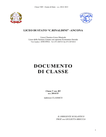 Classe VBT - Esame di Stato – a.s. 2014/ 2015 LICEO DI STATO “C.RINALDINI” -ANCONA Liceo Classico-Liceo Musicale Liceo delle Scienze Umane con opzione Economico Sociale Via Canale,1 ANCONA - Tel .071/204723 fax 071/2072014 DOCUMENTO DI CLASSE Classe V sez. BT a.s. 2014/15 indirizzo CLASSICO IL DIRIGENTE SCOLASTICO PROF.ssa GIULIETTA BRECCIA 1 Classe VBT - Esame di Stato – a.s. 2014/ 2015 SOMMARIO 1. PRESENTAZIONE 1.1 LA CLASSE 1.2 GLI ALUNNI/E 1.3 I/LE DOCENTI 2. METODOLOGIA 2.1 LA PROGRAMMAZIONE 2.2 LA LEZIONE e LA VALUTAZIONE 2.3 LE VERIFICHE e IL RECUPERO 3. ATTIVITÀ 3.1 PROGETTI DI ISTITUTO 3.2 VISITE DI ISTRUZIONE 3.3 SIMULAZIONI D’ESAME 4. PROGRAMMI 4.1 AREA LINGUISTICO-LETTERARIA • Lingua e Letteratura Italiana • Lingua e Letteratura Latina • Lingua e Letteratura Greca • Lingua e Letteratura Inglese 4.2 AREA STORICO-FILOSOFICA • Storia • Filosofia • Storia dell’Arte 4.3 AREA TECNICO-SCIENTIFICA • Matematica • Fisica • Scienze della Terra • Educazione Fisica 5. ALLEGATI 5.1 SIMULAZIONI DELLA TERZA PROVA • Prova del 23/01/2015 • Prova del 20/04/2015 5.2 GRIGLIE DI VALUTAZIONE • Prima prova • Seconda prova • Terza prova • Colloquio • Tabella di conversione • Criteri di valutazione - tabella pag. pag. pag. 4 5 6 pag. pag. pag. 7 7 10 pag. pag. pag. 10 11 12 pag. pag. pag. pag. 14 18 22 24 pag. pag. pag. 28 32 33 pag. pag. pag. pag. 36 38 40 44 pag. pag. 45 45 pag. pag. pag. pag. pag. pag. 47 48 49 50 51 52 2 Classe VBT - Esame di Stato – a.s. 2014/ 2015 Il Consiglio di Classe della Classe V BT Docenti Baldini Nadia Ciambrignoni Nadia D’Amico Matteo Materia Firma Educazione Fisica Lingua e Letteratura Italiana Storia D’Orsi Elvira Matematica e Fisica Graziani Irene Lingua e Letteratura Latina Orsetti Marco Filosofia Piattella Maria Paola Lingua e Letteratura Inglese Pignocchi Renata Lingua e Letteratura Greca Pisano Caterina Puca Lorenzo Sandroni Claudia Tenti Lorenzo Sostegno Scienze della Terra Storia dell’Arte Religione Rappresentanti degli alunni/e Firme Duca Emanuele Sardella Giuliana Ancona, 15 maggio 2015 IL DIRIGENTE SCOLASTICO Prof.ssa Giulietta Breccia _____________________________ 3 Classe VBT - Esame di Stato – a.s. 2014/ 2015 1. PRESENTAZIONE 1.1 LA CLASSE La situazione La fisionomia attuale della classe, composta da 28 alunni (18 femmine e 10 maschi) è il risultato di un accorpamento tra due classi a loro volta smembrate, avvenuto in seconda Liceo. Nonostante l’origine composita della classe, l’elevato numero di alunni e la conseguente disomogeneità nei livelli di competenze e conoscenze man mano raggiunti nel corso del quinquennio, gli studenti della 5 BT evidenziano oggi, alla conclusione del triennio, di aver seguito un graduale percorso di crescita e maturazione nel lavoro di consolidamento del proprio profilo educativo-culturale. Anche la maturazione dell’aspetto socio-educativo, che si è manifestata attraverso la ricerca di un equilibrato affiatamento nei rapporti interpersonali, è avvenuta nel corso di quest’ultimo anno, con un complessivo miglioramento delle capacità di relazione e di lavoro d’équipe. Permangono tuttavia le differenze, sia nella continuità e profondità dell’impegno profuso sia nei risultati conseguiti, variabili anche da disciplina a disciplina, sia nell’autonomo sviluppo di interessi culturali radicati in profondità. Pertanto la maggioranza degli studenti si attesta, in generale, su un livello di profitto mediamente discreto, a fronte di un gruppo di allievi maggiormente motivati e supportati nelle produzioni da una preparazione più accurata, una padronanza più sicura nelle competenze, e alcuni anche da una capacità di rielaborazione e di approfondimento autonomamente motivata. Per alcuni studenti, soprattutto a causa delle difficoltà riscontrate nella traduzione dal Latino e dal Greco, si è reso necessario un costante lavoro di recupero, al fine di rafforzare almeno in parte certe debolezze pregresse, con risultati sul miglioramento delle competenze mediamente positivi, stante la permanenza di alcune problematicità. Tuttavia, la disponibilità della maggioranza della 5 BT al dialogo educativo e la curiosità intellettuale cresciuta gradualmente in alcuni, hanno sostenuto lo svolgimento del lavoro didattico, consentendo di portare a compimento un percorso formativo complessivamente di buon livello. Per quanto riguarda la composizione della classe nel corso del triennio, si segnalano le seguenti dinamiche. Nella quarta Liceo si sono iscritti tre nuovi alunni, uno da una sezione parallela del Liceo “Rinaldini” e due provenienti da altri Licei, mentre un’alunna della classe si è trasferita in altra sezione. In quinta Liceo, infine, all’inizio dell’anno scolastico, provenienti da altri istituti, si sono iscritti due studenti, di cui uno si è però di nuovo trasferito in altro Liceo in data 25/10/2015. Si rinvia infine al documento allegato per quanto attiene a una specifica situazione di un’alunna della classe. CLASSE III IV V ALUNNI ISCRITTI ALLA CLASSE PROVENIENTI DA ALTRA CLASSE TRASFERITI IN ALTRA CLASSE PROMOSSI A GIUGNO PROMOSSI CON GIUDIZIO SOSPESO 25 0 0 19 6 0 27 3 1 16 11 0 28 2 1 NON AMMESSI 4 Classe VBT - Esame di Stato – a.s. 2014/ 2015 1.2 GLI ALUNNI/E Elenco complessivo 1 2 3 4 5 6 7 8 9 10 11 12 13 14 15 16 17 18 19 20 21 22 23 24 25 26 27 28 BARBIERATO Allegra BELLESI Gaia BETTI Maria Sole BRANCATELLO Beatrice BUTICCHI Flavia CAPORALINI Sara CARRIERI Nicoletta D’ANTONIO Lorenzo DAZJ Andrea DISCEPOLO Lara DROC Alexandra-medina DUCA Emanuele FANFARILLO Linda GAMBELLA Costanza IAVARONE Fabiana LILLINI Giulia MALAJ Megi MANZOTTI Elia MIGLIOSI Marta MILLOZZI Giacomo Maria MORUZZI Daniele PRINCIPI Marco RAFFAELLI Davide SARDELLA Giuliana SCHIASSELLONI Linda SCIULLI Erica SPAHIC Maid VASSALLO Davide 5 Classe VBT - Esame di Stato – a.s. 2014/ 2015 1.3 I/LE DOCENTI Il Consiglio di Classe La composizione del Consiglio di Classe ha subi