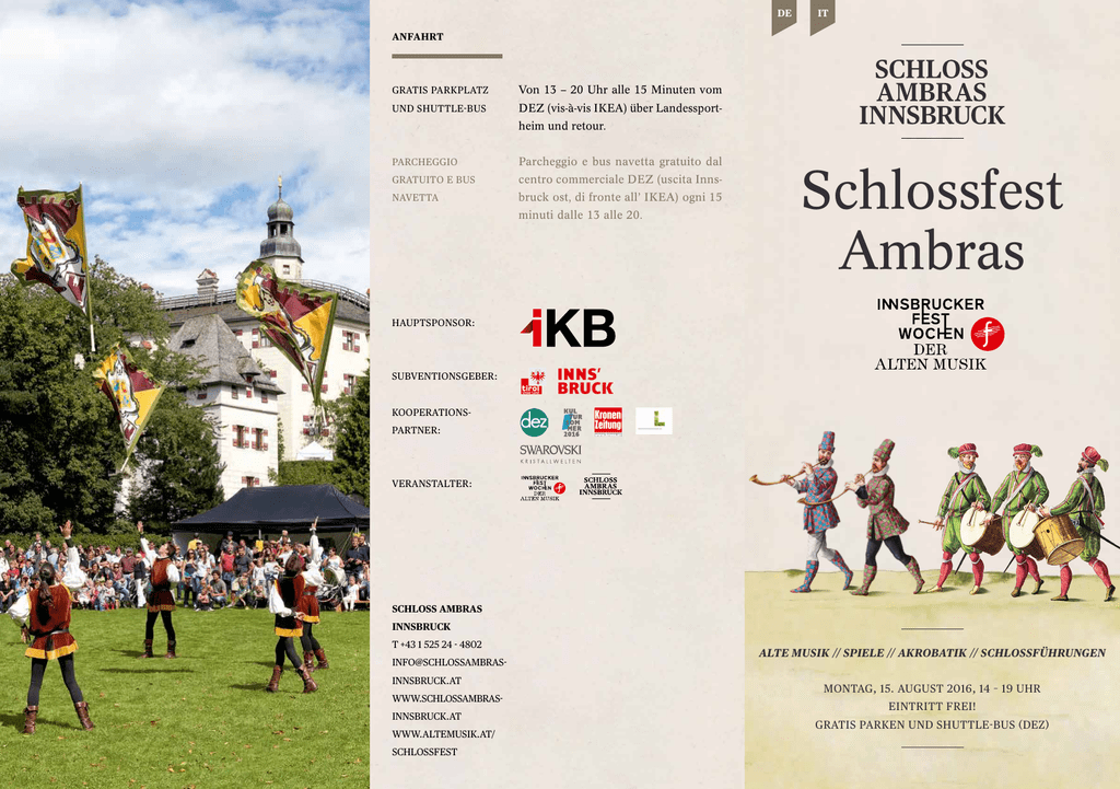 DE IT ANFAHRT GRATIS PARKPLATZ Von 13 – 20 Uhr alle 15 Minuten vom UND SHUTTLE-BUS DEZ (vis-à-vis IKEA) über Landessportheim und retour. PARCHEGGIO Parcheggio e bus navetta gratuito dal GRATUITO E BUS centro commerciale DEZ (uscita Inns- NAVETTA bruck ost, di fronte all’ IKEA) ogni 15 minuti dalle 13 alle 20. Schlossfest Ambras HAUPTSPONSOR: SUBVENTIONSGEBER: KOOPERATIONSPARTNER: VERANSTALTER: SCHLOSS AMBRAS INNSBRUCK T +43 1 525 24 - 4802 [email protected] WWW.SCHLOSSAMBRASINNSBRUCK.AT WWW.ALTEMUSIK.AT/ SCHLOSSFEST ALTE MUSIK // SPIELE // AKROBATIK // SCHLOSSFÜHRUNGEN MONTAG, 15. AUGUST 2016, 14 – 19 UHR EINTRITT FREI! GRATIS PARKEN UND SHUTTLE-BUS (DEZ) Termine // Appuntamenti Den ganzen Tag // Tutto il giorno GROSSER Der ganze Hofstaat, die Akrobaten, IKB KOSTÜMSCHAU // Verkleide dich und lass dich bis 17.30 un- DARBIETUNGEN, FESTUMZUG Fahnenschwinger und Musiker ziehen SFILATA DI COSTUMI ter den Arkaden SPIELE UND Standorte der verschiedenen akroba- feierlich von den Arkaden vorbei an der IKB tolles Foto machen, das du gratis mit nach WORKSHOPS tischen Einlagen, Bastel- und Spiel- 15 UHR 9 11 Spanischen Treppe zur Großen Wiese. 6 9 registrieren und ein Hause nehmen kannst! Um 18 Uhr geht Grande sfilata con il corteo, sbandie- 18 UHR ratori e musicisti dai portici fino al pra- GROSSE WIESE 6 to grande. Einen Überblick über die zahlreichen möglichkeiten finden Sie am Lageplan die Kostümschau auf der Großen Wiese UNTERSCHIEDLICHE los. Tipp: Das Motto heuer lautet: STANDORTE auf der Rückseite. »Spiel«. Wir freuen uns auf eure Ideen! Indossa un costume, iscriviti fino alle FÜHRUNGEN 17.30 alla sfilata sotto il porticato SCHLOSS AMBRAS sciati scattare una foto, che potrai porta- INNSBRUCK 11 re a casa gratuitamente! La sfilata comin- 14, 14.30, 16, 17, 18 UHR Familienführung »Spiel!« 14.30, 15.30, 16.30, Familienführung »Wunderwelt der 18 UHR Renaissance« ORE 16.30, 17.30, 18 Visita guidata per famiglie in lingua italiana 9 e la- -Wandelmusiker Il fait bon danser SCHLOSSPARK - Ambraser Elefant und Rhinozeros Die Ambraser Wüstenspringmaus Jacu- KRISTALLWELTEN lus versteckt sich im Schloss. Wenn du MÄUSESUCHSPIEL // sie findest, gewinnst du eine Swarovski SWAROVSKI – CERCA Kristallmaus. Die Gewinnspielkarte und IL TOPOLINO mehr Infos bekommst du beim Swarovski 14.30, 16, 17 UHR KAPELLE Ensemble rosarum flores 15 14, 16.30, 18.30 UHR Mozarteum Baroque Collective SPANISCHER SAAL 12 PUPPENTHEATER 15.30 UND 17.30 UHR 15 HOCHSCHLOSS Ferdinands Fest GROSSE WIESE 4 Chi trova il topolino Jaculus di Ambras CA. 18.15 UHR vince un topolino dei mondi di cristallo 6 Possenreißer QUER DURCH DEN SWAROVSKI VERLOSUNG - Pill & Pankratz – die singenden Piccolo consiglio: il motto è »gioco«. Non Kristallwelten Stand. FESTWOCHEN - Stelzenensemble Ristretto FESTBEGLEITER cerà alle ore 18 davanti alla Sala Spagnola. vediamo l’ora di vedere le tue idee! KONZERTE DER STÄNDIGE Swarovski. erwecken wieder Aufsehen LAGEPLAN 15 19 1 Haupttor Aldranser Straße Portone Aldranser Straße 2 Weiher Laghetto 3 Spielwiese Prato dei giochi 4 Kleine Spielwiese und IKB-Bereich Piccolo prato dei giochi 5 Ausstellermeile Vari espositori 6 Große Wiese Prato grande 7 Parktor Portone parco 8 Schlosstor Portone castello 9 Arkaden und unterer Hof Porticato e cortile 18 16 14 12 17 13 11 10 20 9 6 10 Rüstkammern Armerie 11 Platzkartenverkauf Vendita posti prenotati 12 Spanischer Saal Sala Spagnola 13 Bauernrüstkammer Armeria d’utilità 14 Aufgang zum Hochschloss Salita del Castello Alto 15 Hochschloss Castello Alto 16 Bacchusgrotte Grotta di Baccho 17 Keuchengarten Giardino formale 18 Spanischer Saal: Eingang bei Regen Sala Spagnola: Entrata in caso di pioggia 19 Terrassenstöckl Belvedere 20 Kunst- und Wunderkammer Camera d‘arte e di oggetti curiosi 8 7 5 Behinderten WC WC per disabili Sanitäter Infermeria 4 Shuttle Bus Bus navetta 3 Gastronomie Ristorazione WC WC Infopoint Informazione STANDORTE DARBIETUNGEN, SPIELE UND WORKSHOPS 2 - Krone Zelt: Aus Ton und Naturmaterialien werden phantasievolle Tiere, Königinnen, Ritter und Fabelwesen gefertigt und aus Kisten, Karton, etc. ein Theater mit Bühne, Bühnenbild und Figuren gebaut. 3 - Kinder- und Erwachsenenspiele mit dem Spielbus 4 - IKB Wasser- und Bastelzelt - Werkstatt für kreatives Arbeiten mit Kristall (Swarovski Kristallwelten) 6 2 9 1 - Durch das Fest führt Antonella Placheta mit Trommelwirbler und Paukenschläger - Fausto Tenorio, der brasilianische Akrobat, verführt, berauscht und umgarnt das Publikum - Artisten vom Zirkus Meer lassen einen 3,5 m hohen Riesenkreisel rotieren und einen imposanten Ring über die Wiese rollen -Die Three Funky Monkeys legen am chinesischen Mast so richtig los. In ihrer Performance paaren sie Kraft, Breakdance und Artistik. - Große Fahnenschwingergruppe aus Feltre - IKB Fotostation - 15 Uhr Großer Festeinzug von den Arkaden bei der Spanischen Treppe vorbei zur Großen Wiese 14 - Wunschbaum der Hofgartenfreunde 15 - Das Hochschloss wird mit dem historischen Gänsespiel zum riesigen Spielplatz - Puppentheater »Ferdinand und Philippine« 16 - Riesenlaufrad mit NEU entwickeltem Zirben-Karussell 19 - Instrumente entdecken und erleben