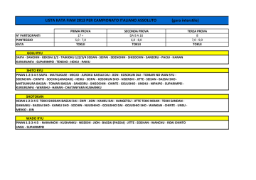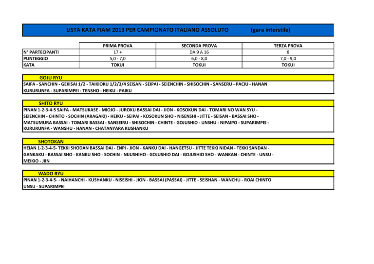 LISTA KATA FIAM 2013 PER CAMPIONATO ITALIANO ASSOLUTO N° PARTECIPANTI PUNTEGGIO KATA PRIMA PROVA 17 + 5,0 - 7,0 TOKUI (gara interstile) SECONDA PROVA DA 9 A 16 6,0 - 8,0 TOKUI GOJU RYU SAIFA ‐ SANCHIN ‐ GEKISAI 1/2 ‐ TAIKIOKU 1/2/3/4 SEISAN ‐ SEIPAI ‐ SEIENCHIN ‐ SHISOCHIN ‐ SANSERU ‐ PACIU ‐ HANAN KURURUNFA ‐ SUPARIMPEI ‐ TENSHO ‐ HEIKU ‐ PAIKU SHITO RYU PINAN 1‐2‐3‐4‐5 SAIFA ‐ MATSUKASE ‐ MIOJO ‐ JUROKU BASSAI DAI ‐ JION ‐ KOSOKUN DAI ‐ TOMARI NO WAN SYU ‐ SEIENCHIN ‐ CHINTO ‐ SOCHIN (ARAGAKI) ‐ HEIKU ‐ SEIPAI ‐ KOSOKUN SHO ‐ NISENSHI ‐ JITTE ‐ SEISAN ‐ BASSAI SHO ‐ MATSUMURA BASSAI ‐ TOMARI BASSAI ‐ SANSEIRU ‐ SHISOCHIN ‐ CHINTE ‐ GOJUSHIO ‐ UNSHU ‐ NIPAIPO ‐ SUPARIMPEI ‐ KURURUNFA ‐ WANSHU ‐ HANAN ‐ CHATANYARA KUSHANKU SHOTOKAN HEIAN 1‐2‐3‐4‐5‐ TEKKI SHODAN BASSAI DAI ‐ ENPI ‐ JION ‐ KANKU DAI ‐ HANGETSU ‐ JITTE TEKKI NIDAN ‐ TEKKI SANDAN ‐ GANKAKU ‐ BASSAI SHO ‐ KANKU SHO ‐ SOCHIN ‐ NIJUSHIHO ‐ GOJUSHIO DAI ‐ GOJUSHIO SHO ‐ WANKAN ‐ CHINTE ‐ UNSU ‐ MEIKIO ‐ JIIN WADO RYU PINAN 1‐2‐3‐4‐5‐ ‐ NAIHANCHI ‐ KUSHANKU ‐ NISEISHI ‐ JION ‐ BASSAI (PASSAI) ‐ JITTE ‐ SEISHAN ‐ WANCHU ‐ ROAI CHINTO UNSU ‐ SUPARIMPEI TERZA PROVA 8 7,0 - 9,0 TOKUI