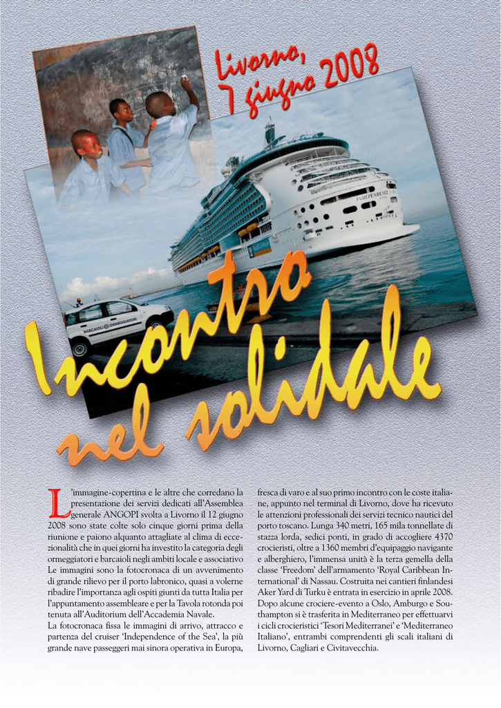 L ’immagine-copertina e le altre che corredano la presentazione dei servizi dedicati all’Assemblea generale ANGOPI svolta a Livorno il 12 giugno 2008 sono state colte solo cinque giorni prima della riunione e paiono alquanto attagliate al clima di eccezionalità che in quei giorni ha investito la categoria degli ormeggiatori e barcaioli negli ambiti locale e associativo Le immagini sono la fotocronaca di un avvenimento di grande rilievo per il porto labronico, quasi a volerne ribadire l’importanza agli ospiti giunti da tutta Italia per l’appuntamento assembleare e per la Tavola rotonda poi tenuta all’Auditorium dell’Accademia Navale. La fotocronaca fissa le immagini di arrivo, attracco e partenza del cruiser ‘Independence of the Sea’, la più grande nave passeggeri mai sinora operativa in Europa, fresca di varo e al suo primo incontro con le coste italiane, appunto nel terminal di Livorno, dove ha ricevuto le attenzioni professionali dei servizi tecnico nautici del porto toscano. Lunga 340 metri, 165 mila tonnellate di stazza lorda, sedici ponti, in grado di accogliere 4370 crocieristi, oltre a 1360 membri d’equipaggio navigante e alberghiero, l’immensa unità è la terza gemella della classe ‘Freedom’ dell’armamento ‘Royal Caribbean International’ di Nassau. Costruita nei cantieri finlandesi Aker Yard di Turku è entrata in esercizio in aprile 2008. Dopo alcune crociere-evento a Oslo, Amburgo e Southampton si è trasferita in Mediterraneo per effettuarvi i cicli crocieristici ‘Tesori Mediterranei’ e ‘Mediterraneo Italiano’, entrambi comprendenti gli scali italiani di Livorno, Cagliari e Civitavecchia. Una delle caratteristiche più evidenti del cruiser è il taglio sportivo delle sue offerte di svago: simulatore di surf, parco acquatico, pattinaggio su ghiaccio, freeclimbing, boxe… E ovviamente fumo rigorosamente off-limits. Ma la Independence of the Sea vanta anche un’altra innovativa particolarità, questa volta di deciso sentore solidaristico, rivelata durante il battesimo di Southampton. Madrina della nave non è stata la solita persona famosa, oppure di cerchia famigliare o d’ambiente marittimo. Al contrario, è stata Elizabeth Hill da Chesterfield, Inghilterra, scelta attraverso un concorso dello ‘Steve Redgrave Fund’, associazione benefica partner di Royal Caribbean, che ha così inteso premiare una persona comune impegnata nell’aiuto a gioNelle foto di Villi Mattei: (questa pagina) la Independence of the Seas nel porto di Livorno. Lavori per la costruzione di tre aule alla scuola d’Azové. L’edificio con le aule ormai ultimate e in uso dai ragazzi. (Pagina seguente) il primo edificio dell’orfanotrofio acquistato dalla onlus Cars for Africa in fase di ristrutturazione. Il secondo edificio dell’orfanotrofio ancora da ristrutturare vani in situazioni di disagio sociale. Ecco allora la signora Hill, segnalata dalla figlia dodicenne Alice per l’impegno svolto al Gamelea Countryside Training Trust, un’associazione con sede in una grande fattoria che aiuta e sostiene giovani disabili o con problemi di apprendimento e ragazzi con problemi scolastici a rischio di emarginazione sociale. E qui, complice l’attracco livornese della ‘Independence’, subentra la felice casualità dell’inatteso incrocio di due distinte strade della solidarietà nel pianeta dell’infanzia. Fotocamera in mano, assieme ai colleghi del Gruppo di Livorno, ad attendere la nave c’era l’ormeggiatore Villi Valter Mattei, fondatore dell’associazione ‘Cars for Africa’ – Onlus’, assieme alla moglie Anna, biologa, e all’amico Gigi, giornalista, tutti appassionati di auto e dell’Africa. Definendone l’azione come ‘una piccola goccia …di solidarietà’ è lo stesso Mattei che illustra la genesi e gli indirizzi solidali dell’Associazione, attiva dal 2003. E che, basandosi sui principi della solidarietà e della carità cristiana e della visione della vita come ‘servizio verso i più bisognosi’, si propone di promuovere i valori dell’amore e della dignità umana che stanno alla base di ogni giustizia sociale attraverso opere di solidarietà e interventi umanitari rivolti ai paesi del terzo mondo. In particolare utilizzando i fondi raccolti attraverso diverse attività legate all’editoria ed al mondo delle auto d’epoca ha realizzato in Benin strutture di primaria necessità fra cui sei pozzi d’acqua e centri di accoglienza per bambini e ragazzi. L’opera della ‘Cars for Africa’ si affianca a quella svolta dalla missione italiana delle Sorelle Apostole della Consolata che già opera da 25 anni ad Azovè, piccolo centro agricolo della provincia di Monó, nel Sud del paese. “E la loro esperienza ci permette di venire in contatto diretto con la realtà del posto, così da permetterci di focalizzarci sulle necessità più urgenti ottimizzando al massimo i nostri interventi”. Poi, Villi Mattei sottolinea il fatto che nel 2005 grazie all’interesse dimostrato da ANGOPI verso gli obiettivi della onlus, “e soprattutto grazie alla realizzazione della ‘Agenda degli Ormeggiatori 2006’, siamo riusciti a reperire i fondi necessari per la costruzione di una scuola ad Azové e per altri progetti”. “Ad Azové è attiva una scuola con cicli di studio che vanno dalle elementari fino alle superiori. La carenza di aule però era evidente, e diverse classi erano costrette in spazi aperti ed a turni per lo svolgimento delle lezioni. Era stata così sottoposta alla nostra attenzione la necessità di costruire una nuova ala con almeno altre tre aule dove poter sistemare i ragazzi degli ultimi anni di studio. Abbiamo deciso così di impegnare i fondi ricavati dalla realizzazione dell’Agenda degli Ormeggiatori per portare avanti questo progetto dato che l’interesse dell’ANGOPI era rivolto principalmente alla costruzione di una scuola. I lavori sono iniziati a fine 2006, i tempi sono stati lunghi, ma alla fine durante l’ul