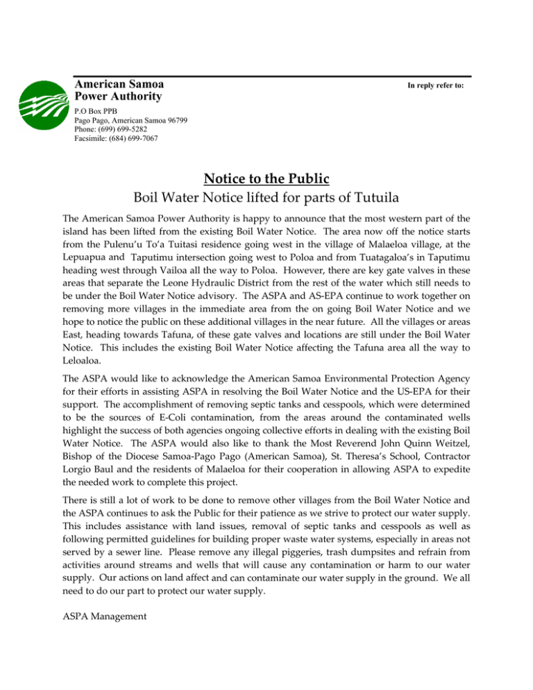 American Samoa Power Authority In reply refer to: P.O Box PPB Pago Pago, American Samoa 96799 Phone: (699) 699-5282 Facsimile: (684) 699-7067 Notice to the Public Boil Water Notice lifted for parts of Tutuila The American Samoa Power Authority is happy to announce that the most western part of the island has been lifted from the existing Boil Water Notice. The area now off the notice starts from the Pulenu’u To’a Tuitasi residence going west in the village of Malaeloa village, at the Lepuapua and Taputimu intersection going west to Poloa and from Tuatagaloa’s in Taputimu heading west through Vailoa all the way to Poloa. However, there are key gate valves in these areas that separate the Leone Hydraulic District from the rest of the water which still needs to be under the Boil Water Notice advisory. The ASPA and AS‐EPA continue to work together on removing more villages in the immediate area from the on going Boil Water Notice and we hope to notice the public on these additional villages in the near future. All the villages or areas East, heading towards Tafuna, of these gate valves and locations are still under the Boil Water Notice. This includes the existing Boil Water Notice affecting the Tafuna area all the way to Leloaloa. The ASPA would like to acknowledge the American Samoa Environmental Protection Agency for their efforts in assisting ASPA in resolving the Boil Water Notice and the US‐EPA for their support. The accomplishment of removing septic tanks and cesspools, which were determined to be the sources of E‐Coli contamination, from the areas around the contaminated wells highlight the success of both agencies ongoing collective efforts in dealing with the existing Boil Water Notice. The ASPA would also like to thank the Most Reverend John Quinn Weitzel, Bishop of the Diocese Samoa‐Pago Pago (American Samoa), St. Theresa’s School, Contractor Lorgio Baul and the residents of Malaeloa for their cooperation in allowing ASPA to expedite the needed work to complete this project. There is still a lot of work to be done to remove other villages from the Boil Water Notice and the ASPA continues to ask the Public for their patience as we strive to protect our water supply. This includes assistance with land issues, removal of septic tanks and cesspools as well as following permitted guidelines for building proper waste water systems, especially in areas not served by a sewer line. Please remove any illegal piggeries, trash dumpsites and refrain from activities around streams and wells that will cause any contamination or harm to our water supply. Our actions on land affect and can contaminate our water supply in the ground. We all need to do our part to protect our water supply. ASPA Management Fa’aaliga mo Tagata Lautele Aveesea Lapataiga o le Fa’apunaina o le Suavai Taumafa i ni vaega o le Motu o Tutuila I le ava ma le fa’aaloalo e tatau ai, ua fiafia le Matagaluega o le Eletise ma le Suavai Taumafa e fa’ailoa atu – ua mafai ona taofia le fa’apupunaina o le suavai po’o le Boil Water Notice (BWN) mo pa’aga totogi pili o lo’o alaala i nu’u i le itu i sisifo o Tutuila. O lenei fa’asilasilaga e a’afia ai aiga uma e amata mai i le Laoa o Tuitasi (pulenu’u) i le a’ai i Malaeloa e aga’i atu i sisifo (Leone); le magatolu o Lepuapua ma Taputimu e aga’i atu i Poloa; ma le maota o Tuatagaloa i Taputimu e aga’i atu i Vailoa ma fa’asolo atu ai i Poloa. O lo’o galulue so’otau’au pea le ASPA ma le Ofisa mo le Puipuiga o le Si’osi’omaga (AS‐EPA) ina ia mafai ona ave ese isi alaalafaga i lenei itu o le motu, mai le fa’apupunaina o le suavai. Ua iai nei galuega o lo’o fa’atinoina ma o lo o iai le fa’amoemoe e toe vave o’o atu se isi fa’asilasilaga i se taimi lata mai. Ae mo le taimi nei, o nu’u uma i Sasa’e o alaalafaga ua ta’ua i luga e aga’i atu i Tafuna – fa’amolemole fa’aauau pea le fa’apupunaina o le suavai. O alaalafaga uma fo’i e amata mai Tafuna se’i pa’ia Leloaloa o lo’o iai pea i lalo o le fa’asilasilaga e fa’apupuna le suavai taumafa (BWN). E fia fa’ailoa atu fo’i lo matou agaga fa’afetai tele i le Ofisa o le Puipuiga o le Si’osi’omaga (AS‐ EPA), ona o lo latou fesoasoani malosi i le taumafaiga a le ASPA, e si’itia le fa’asilasilaga mo le fa’apupunaina o le suavai. O le ave’eseina o tane tuai mo suavai lafoa’i mai fanua na a’afia ai vaieli i siama o le E‐Coli, e atagia mai ai le taua tele o le galulue fa’atasi o le ASPA, le AS‐EPA, ma le mamalu o le atunu’u ‐ ina ia puipuia le suavai taumafa. E momoli atu fo’i le matou fa’afetai tele i le afio’aga o Malaeloa, le a’oga fou o St. Theresa aemaise le Afioga I le Vaopunimatagi – le Tama Epikopo Quinn Weitzel, ma le Susuga ia Lorgio Baul i le lagolagoina o le galuega a le ASPA aua le puipuia o a tatou vaieli. Matou te fa’amalulu atu ona ua matou solivale i fanua, ae o le agaga lava ina ia saogalemu le suavai taumafa. O lo’o telē pea le galuega e mana’omia ona fa’atino ina ia mafai ona matua ave’ese uma alaalafaga o lo’o a’afia i lalo o le fa’asilasilaga e fa’apupunaina le suavai, ma e fa’atagisia pea lo outou fesoasoani a’o galulue le ASPA e puipui le suavai taumafa. Matou te fa’alatalata atu pea i le paia ma le mamalu o le tatou atunu’u, ina ia fa’autagia lelei tulafono mo le fausia o lo’ilo’i (sai o mea tua’olō) ma tane mo le suavai lafoa’i – aemaise vaega o le atunu’u e le o o’o atu ai le laina mo le suavai lafoa’i (sewer line). Fa’amolemole, ‘aua ne’i lafoa’i ni otaota pe fa’alatalata ni nofoaga mo lapisi i a tatou ala vai ma vaieli – aua o nei gaioiga e a’afia ai ma fa’aleagaina ai le suavai taumafa. O a tatou galuega fa’atino i luga o le eleele e matua a’afia ai le suavai o lo’o pamuina mai i luga mo le tatou fa’aaogaina. O le tatou tiute tauave o le galulue fa’atasi e fa’asaogalemu ma puipui le suavai taumafa mo nei ma le l