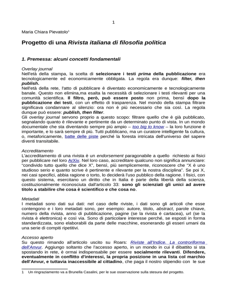 1 Maria Chiara Pievatolo1 Progetto di una Rivista italiana di filosofia politica 1. Premessa: alcuni concetti fondamentali Overlay journal Nell'età della stampa, la scelta di selezionare i testi prima della pubblicazione era tecnologicamente ed economicamente obbligata. La regola era dunque: filter, then publish. Nell'età della rete, l'atto di pubblicare è diventato economicamente e tecnologicamente banale. Questo non elimina,ma esalta la necessità di selezionare i testi rilevanti per una comunità scientifica. Il filtro, però, può essere posto non prima, bensì dopo la pubblicazione dei testi, con un effetto di trasparenza. Nel mondo della stampa filtrare significava condannare al silenzio: ora non è più necessario che sia così. La regola dunque può essere: publish, then filter. Gli overlay journal servono proprio a questo scopo: filtrare quello che è già pubblicato, segnalando quanto è rilevante e pertinente da un determinato punto di vista. In un mondo documentale che sta diventando sempre più ampio – too big to know – la loro funzione è importante, e lo sarà sempre di più. Tutti pubblicano, ma un curatore intelligente fa cultura, o, metaforicamente, batte delle piste perché la foresta intricata dell'universo del sapere diventi transitabile. Accreditamento L'accreditamento di una rivista è un endorsement paragonabile a quello richiesto ai fisici per pubblicare nel loro ArXiv. Nel loro caso, accreditare qualcuno non significa annunciare: “condivido tutto quello che dice X”, bensì, più semplicemente, riconoscere che “X è uno studioso serio e quanto scrive è pertinente e rilevante per la nostra disciplina”. Se poi X, nei casi specifici, abbia ragione o torto, lo deciderà l'uso pubblico della ragione. I fisici, con questo sistema, esercitano un diritto che in Italia è parte della libertà della scienza, costituzionalmente riconosciuta dall'articolo 33: sono gli scienziati gli unici ad avere titolo a stabilire che cosa è scientifico e che cosa no. Metadati I metadati sono dati sui dati: nel caso delle riviste, i dati sono gli articoli che esse contengono e i loro metadati sono, per esempio: autore, titolo, abstract, parole chiave, numero della rivista, anno di pubblicazione, pagine (se la rivista è cartacea), url (se la rivista è elettronica) e così via. Sono di particolare interesse perché, se esposti in forma standardizzata, sono elaborabili da parte delle macchine, esonerando gli esseri umani da una serie di compiti ripetitivi. Accesso aperto Su questo rimando all'articolo uscito su Roars: Riviste all’Indice. La controriforma dell’Anvur. Aggiungo soltanto che l'accesso aperto, in un mondo in cui il dibattito si sta spostando in rete, è ormai indispensabile per essere socialmente rilevanti. Difendere, eventualmente in conflitto d'interessi, la propria posizione in una lista col marchio dell'Anvur, e tuttavia inaccessibile al cittadino, che paga il nostro stipendio con le sue 1 Un ringraziamento va a Brunella Casalini, per le sue osservazione sulla stesura del progetto. 2 imposte, significa: a) essere letti da pochissimi b) poter essere spazzati via in modo indolore e senza nessuna reazione dell'opinione pubblica quando chi ci governa deciderà che il poco che spende l'Italia per la ricerca è ancora troppo. Quando It.wikipedia si è auto-oscurata per protestare contro la legge sulle intercettazioni, tutti se ne sono accorti: se facesse lo stesso una rivista chiusa nei recinti dell'Anvur, chi lo noterebbe? OAI-PMH E' l'acronimo di Open Archives Initiative Protocol for Metadata Harvesting: è un protocollo di standardizzazione dei metadati che permette (a) a chi pubblica gli articoli (data providers) di distribuirli in modo tale che possano essere usati ed elaborati dai computer; (b) a chi cataloga gli articoli (service providers), di organizzarli e ripubblicarli con procedure automatizzate, cioè senza intervento umano Il progetto è diviso in due sezioni: una teorica, discorsiva, e una tecnica, che richiede qualche semplice nozione informatica. La proposta è stratificata, in modo tale che sia possibile accettarne o soltanto il nucleo, oppure il nucleo e, a scelta, qualcosa di più. 2. Un overlay journal per la filosofia politica: progetto teorico Una rivista accreditata è una rivista il cui funzionamento risponde ai requisiti di trasparenza propri dell'uso pubblico della ragione e i cui contenuti sono pertinenti e rilevanti per la filosofia politica. Il primo requisito comporta un controllo amministrativo, il secondo una valutazione culturale. a. Controllo amministrativo: – La rivista risponde, e risponde tempestivamente, a coloro che le sottopongono un articolo? – Che tipo di revisione paritaria pratica? – Garantisce l'anonimato degli autori? – Rende pubblico l'elenco dei revisori e/o il suo comitato scientifico? – Le risposte dei revisori paritari sono costruttive, o sono del tipo descritto per esempio qui? – Che tipo di contratto impone agli autori? E' ad accesso aperto? Se no, chiede la cessione dei diritti, impone un embargo, o accetta la disciplina dell'articolo 42 della legge italiana sul diritto d'autore? Questi criteri sono solo esemplificativi. La discussione fra i soci Sifp ne potrà aggiungere altri. b. Valutazione culturale Un collegio composto da un numero funzionale di soci (cinque?), eletti fra tutte le componenti accademiche della discipline, in carica per un periodo limitato di tempo (due anni?) e i cui membri possono essere rieletti solo dopo quattro anni dalla cessazione della carica, valuta: – l'accredito delle riviste: in questo caso, si stabilisce se il contenitore, soddisfatti i requisiti amministrativi, è rilevante e pertinente per la disciplina. Se sì, la rivista può essere ammessa all'indicizzazione automatica sull'overlay journal, di cui alla parte tecnica del progetto; 3 – solo qualora il contenitore non sia accreditato il comitato può valutare, su richiesta degli interessati, l'accredito di
