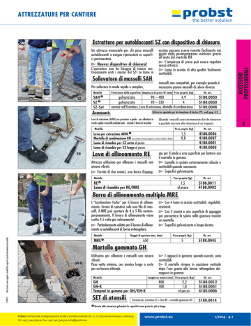 ATTREZZATURE PER CANTIERE Un attrezzo essenziale per chi posa masselli autobloccanti o esegue riparazioni su superfici pavimentate. Nuovo: dispositivo di chiusura! L’operatore non ha bisogno di tenere continuamente uniti i manici del SZ! Le lame in Sollevatore di masselli SAH masselli non compattati, per esempio quando è necessario posare masselli di colore diverso. Per sollevare in modo rapido e semplice, SZ AHW acciaio possono essere inserite facilmente nei giunti dalla pavimentazione esistente grazie all’aiuto del martello KH. L’ampiezza di presa può essere regolata senza attrezzi. Lame in acciaio di alta qualità facilmente sostituibili. Modello Protezione della superficie Ampiezza di presa W (mm) Peso proprio (kg) Nr. art. SAH n SZ n SZ-Set galvanizzato 90 – 400 4,9 galvanizzato 90 – 330 4 consiste nell‘Estrattore, Leva di estrazione, Martello di combinazione 5180.0050 5180.0030 5180.0048 Accessori: Attrezzo speciale per la rimozione di lastre, PZ, vedi pag. 4.5 Leva di estrazione (AHW) con pressione a piede - per allentare in modo rapido i masselli autobloccanti - include 2 lame di ricambio (Quando i masselli sono estremamente duri da rimuovere è possibile ricorrere alla vibrazione di un trapano). Modello Peso proprio (kg) Leva per estrazione AHW n Martello di combinazione KH (con un lato in acciaio temprato e un lato morbido in Nylon) Lama di ricambio per SZ corta al pezzo Lama di ricambio per SZ lunga al pezzo KH Leva di allineamento RE Attrezzo utilissimo per allineare i masselli non ancora vibrati. Fornita di due manici, una barra d’appog- RE Nr. art. 1,5 0,8 4180.0036 4180.0037 4180.0001 4180.0003 gio per il piede e una superficie per battere con il martello in gomma. Lamelle in acciaio estremamente robuste e sostituibili quando necessario. Superfici galvanizzate. Modello Peso proprio (kg) Nr. art. RE n 1,5 al pezzo 5180.0011 4180.0002 Lama di ricambio per RE/MRE Barra di allineamento multipla MRE 120913 I dati tecnici sono soggetti a modifiche seguite al perfezionamento dei prodotti MRE GH L’”Acceleratore Turbo” per il lavoro di allineamento. Invece di spostare solo una fila di masselli, il MRE può spostare da 4 a 5 file contemporaneamente. Il lavoro di allineamento viene svolto 4-5 volte più velocemente! Particolarmente adatto per il lavoro di allineamento su autobloccanti di forma rettangolare. Con 4 lame in acciaio sostituibili, regolabili, resistenti. Con 2 manici e una superficie di appoggio per permettere la spinta nelle giuntura tramite un martello. Superfici galvanizzate a lunga durata. Modello Raggio di apertura max. (mm) Peso proprio (kg) Nr. art. MRE n 650 5 5180.0045 Martello gommato GH GH-K Utilissimo per allineare i masselli non ancora vibrati. Peso netto minimo, con manico lungo o corto per un lavoro ottimale. Modello I cappucci in gomma, quando usurati, sono sostituibili. Il martello rimane in posizione verticale dopo l’uso grazie alla forma rettangolare deicappucci in gomma. Lunghezza manico (mm) Peso proprio (kg) GH GH-K Tamponi in gomma per GH/GH-K SET di utensili ACCESSORI PROFESSIONALI Estrattore per autobloccanti SZ con dispositivo di chiusura SAH 800 400 2,2 1,8 al pezzo Formato da: estrattore SZ + leva RE + martello gommato GH Nr. art. 5180.0012 5180.0051 4180.0006 5180.0014 n Grazie alla zincatura galvanica le superfici sono protette più a lungo Probst Greiftechnik Verlegesysteme GmbH, Gottlieb-Daimler-Str. 6, 71729 Erdmannhausen, Germany, Tel. +49 7144-3309-0, Fax +49 7144-3309-50, [email protected] www.probst.eu 1/2014 - 4.1 4