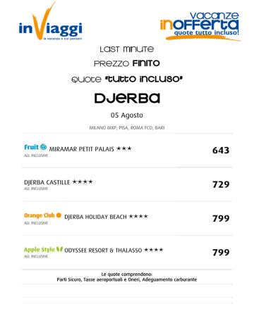 LAST MINUTE PREZZO fINITO quote “tutto incluso” DJERBA 05 Agosto MILANO MXP, PISA, ROMA FCO, BARI MIRAMAR PETIT PALAIS *** ALL INCLUSIVE DJERBA CASTILLE **** ALL INCLUSIVE 643 729 DJERBA HOLIDAY BEACH **** 799 ODYSSEE RESORT & THALASSO **** 799 ALL INCLUSIVE ALL INCLUSIVE Le quote comprendono: Parti Sicuro, Tasse aeroportuali e Oneri, Adeguamento carburante