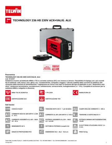 TECHNOLOGY 236 HD 230V ACX+VALIG. ALU Panoramica TECHNOLOGY 236 HD 230V ACX+VALIG. ALU cod. 816207 Saldatrice inverter ad elettrodo MMA e TIG in corrente continua (DC) con innesco a striscio. Flessibilità di impiego con i più svariati tipi di elettrodi: rutili, basici, inox, ghisa, ecc. Caratteristiche: compatta e leggera * elevata stabilità della corrente di saldatura alle variazioni della tensione di alimentazione * regolazione arc force e hot start in funzione del tipo di elettrodo in uso * dispositivo antistick * protezioni termostatica, sovratensione, sottotensione, sovracorrente, motogeneratore (+/- 15%). Completa di accessori per la saldatura MMA e valigetta in alluminio. MMA TIG DC SCRATCH 1 PH 230V CERTIFICAZIONE EAC CERTIFICAZIONE TÜV MARCATURA CE Dati tecnici CODICE 816207 TENSIONE RETE 230 V - 1 ph 50/60Hz CAMPO REG.NE CORRENTE 5 - 200 A CORRENTE MAX DC (EN 60974-1) 200 A - 35 % CORRENTE AL 60% (EN 60974-1) 140 A TENSIONE A VUOTO MAX 81 V CORRENTE ASSORBITA AL 60% - MAX 24 - 42 A POTENZA ASSORBITA AL 60% - MAX 4,2 - 6,6 kW POTENZA MINIMA MOTOGENERATORE 10 kW RENDIMENTO 84 % FATTORE DI POTENZA (cosphi) 0,8 D.ELETTRODI UTILIZZABILI IN DC 1,6 4 mm GRADO DI PROTEZIONE IP23 DIMENSIONI 35,5 - 46,5 - 18,5 cm PESO 9,8 kg Telwin SPA | Via della Tecnica 3 - 36030 VILLAVERLA (VI) ITALY - Tel. +39-0445-858811 - Fax +39-0445-858800/801 - www.telwin.com 15-mar-2017 1 TECHNOLOGY 236 HD 230V ACX+VALIG. ALU CODICE EAN 800489781005 8 PEZZI / PALLET 30 pz/pallet Accessori in dotazione CAVO 25 MMQ 2 M DINSE 25 - 124465 CAVO 25 MMQ 3 M DINSE DX 25 - 124466 DALLAS 300 PINZA PORTAELETTRODI 300A - 712260 TOLEDO 300 PINZA DI MASSA - 712231 VALIGETTA ALLUMINIO - 733510 Telwin SPA | Via della Tecnica 3 - 36030 VILLAVERLA (VI) ITALY - Tel. +39-0445-858811 - Fax +39-0445-858800/801 - www.telwin.com 15-mar-2017 2