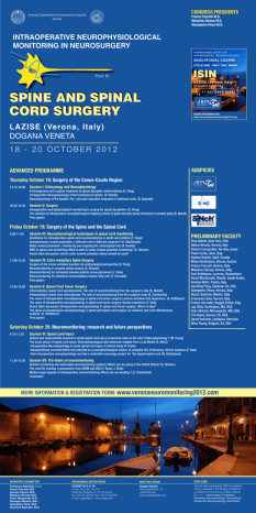 CONGRESS PRESIDENTS Franco Faccioli M.D. Massimo Gerosa M.D. Giampietro Pinna M.D. Intraoperative Neurophysiological Monitoring in Neurosurgery INTERNATIONAL SOCIETY OF INTRAOPERATIVE NEUROPHYSIOLOGY Educational Course Cycle One - part two: BRAIN ISIN Part III LAZISE (Verona, Italy) Dogana Veneta Spine and Spinal Cord Surgery 15 - 17 OCTOBER 2012 MORE INFORMATION: www.veronaneuromonitoring2012.com LAZISE (Verona, Italy) Dogana Veneta 18 - 20 OCTOBER 2012 AUSPICIES ADVANCED PROGRAMME Thursday October 18: Surgery of the Conus-Cauda Region 14.15-16.00 Session I: Embryology and Neurophysiology 16.30-18.30 Session II: Surgery Embryogenesis and surgical treatment of spinal dysraphic malformations (D. Pang) Intraoperative Neurophysiology of the lumbosacral system (V. Deletis) Neurophysiology of the bladder. Pre- and post-operative evaluation in tethered cords (D. Vodusek) Intraoperative neurophysiological monitoring in surgery for spinal dysaphism. (D. Pang) The evolution of intraoperative neurophysiological mapping criteria to guide selective dorsal rhizotomy in cerebral palsy (R. Abbott) Free papers Friday October 19: Surgery of the Spine and the Spinal Cord 8.00-11.00 11.00-13.30 Session III: Neurophysiological techniques in spinal cord monitoring 14.30-16.50 Session V: Spinal Cord Tumor Surgery Anesthesia for intraoperative spinal cord neuromonitoring in adults and children (T. Sloan) Somatosensory evoked potentials: a different role in different surgeries? (D. MacDonald) Motor evoked potentials : monitoring and mapping the corticospinal tract (V. Deletis) EMG in spinal cord monitoring: What it adds to motor evoked potential monitoring? (S. Skinner) Round table discussion: which motor evoked potential criteria should be used? Session IV: Extra-medullary Spine Surgery Surgery of the cranio-vertebral junction: An embryological perspective (D. Pang) Neuromonitoring in complex spinal surgery (S. Skinner) Neuromonitoring for minimally invasive pedicle screw placement (J. Shils) Neuromonitoring for intradural extramedullary lesions: Why not? (F. Servadei) Free papers Intramedullary spinal cord ependymomas: The role of neuromonitoring from the surgeon’s side (R. Abbott) Intramedullary spinal cord astrocytomas: The role of neuromonitoring from the surgeon’s side (S. Constantini) The value of intraoperative neurophysiology in spinal cord tumor surgery: Lucerne and New York experience (K. Kothbauer) The value of intraoperative neurophysiology in spinal cord tumor surgery: Verona experience (F. Sala) Round table discussion: Intraoperative neurophysiology in spinal cord tumor surgery: When to stop? The value of intraoperative neurophysiology in spinal and spinal cord surgery: an evidence and cost-effectiveness analysis (K. Kothbauer) Free papers Saturday October 20: Neuromonitoring: research and future perspectives 8.15-11.30 Session VI: Spinal cord injury PRELIMINARY FACULTY Rick Abbott, New York, USA Albino Bricolo, Verona, Italy Shlomi Constantini, Tel-Aviv, Israel Paolo Costa, Turin, Italy Vedran Deletis, Split, Croatia Milan Dimitrijevic, Vienna, Austria Franco Faccioli, Verona, Italy Massimo Gerosa, Verona, Italy Karl Kothbauer, Lucerne, Switzerland David MacDonald, Riyadh, Saudi Arabia Andrea Nistri, Trieste, Italy Dachling Pang, Oakland, CA, USA Giampietro Pinna, Verona, Italy Rocco Quatrale, Mestre, Italy Francesco Sala, Verona, Italy Franco Servadei, Reggio Emilia, Italy Jay Shils, Burlington, MA, USA Stan Skinner, Minneapolis, MN, USA Tod Sloan, Denver, CO, USA David Vodusek, Ljubljana, Slovenia Wise Young, Rutgers, NJ, USA Clinical and experimental research in acute spinal cord injury: A personal view on the role of Neurophysiology ? (W. Young) The acute phase of spinal cord injury: Electrophysiological and molecular insights from a Lab Model (A. Nistri) Intraoperative Neurophysiology in acute spinal cord injury: A clinical study (P. Costa) Intraoperatively recorded killed-end potential as a neurophysiological marker of complete SCI: Preliminary clinical evidence (F. Sala) How intraoperative neurophysiology can help a restorative neurology project for the injured spinal cord (M. Dimitrijevic) 11.30-13.30 Session VII: The future of neuromonitoring Remote monitoring and automated neuromonitoring systems: Where are we going in the United States? (S. Skinner) The need for training: a perspective from ASNM and ISIN (T. Sloan, J. Shils) Medico-legal aspects of intraoperative neuromonitoring: Where are we heading ? (S. Constantini) Conclusion MORE INFORMATION & REGISTRATION FORM: www.veronaneuromonitoring2012.com Scientific Committee Organizing Secretariat Meeting venue ECM (CME) Francesco Sala M.D. (Chair) Franco Faccioli, M.D. Antonio Fiaschi, M.D. Massimo Gerosa. M.D. Paolo Manganotti, M.D. Giuseppe Moretto, M.D. Giampietro Pinna, M.D. Giovanna Squintani, M.D. COGEST M. & C. Srl Dogana Veneta Piazzetta Partenio, 10 Lazise (Verona) www.doganaveneta.com Only for Italian participants CME accreditation will be requested to the Ministry of Health for a maximum of 150 among medical doctors (specialties: Neurosurgery, Anesthesia, Neurology, Neurophysiology, Orthopedics), Nurses and Neurophysiology Technicians (Provider Provv. Res. Cod. 979) Vicolo San Silvestro, 6 - 37122 Verona Tel. +39 045 597940 Fax +39 045 597265 e-mail: [email protected] - www.cogest.info