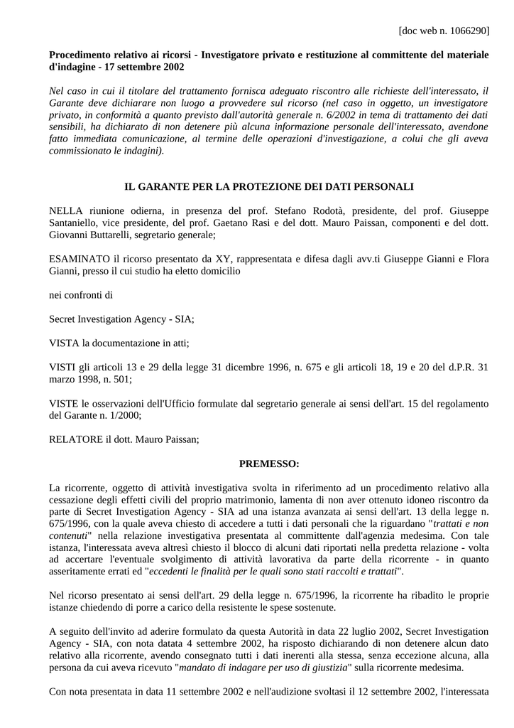 privato, in conformità a quanto previsto dall'autorità generale n. 6/2002 in tema di trattamento dei dati
