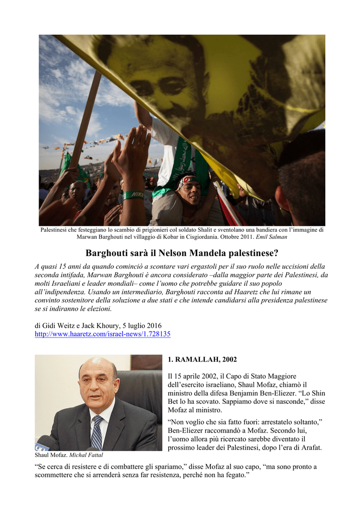 Palestinesi che festeggiano lo scambio di prigionieri col soldato Shalit e sventolano una bandiera con l’immagine di Marwan Barghouti nel villaggio di Kobar in Cisgiordania. Ottobre 2011. Emil Salman Barghouti sarà il Nelson Mandela palestinese? A quasi 15 anni da quando cominciò a scontare vari ergastoli per il suo ruolo nelle uccisioni della seconda intifada, Marwan Barghouti è ancora considerato –dalla maggior parte dei Palestinesi, da molti Israeliani e leader mondiali– come l’uomo che potrebbe guidare il suo popolo all’indipendenza. Usando un intermediario, Barghouti racconta ad Haaretz che lui rimane un convinto sostenitore della soluzione a due stati e che intende candidarsi alla presidenza palestinese se si indiranno le elezioni. di Gidi Weitz e Jack Khoury, 5 luglio 2016 http://www.haaretz.com/israel-news/1.728135 1. RAMALLAH, 2002 Il 15 aprile 2002, il Capo di Stato Maggiore dell’esercito israeliano, Shaul Mofaz, chiamò il ministro della difesa Benjamin Ben-Eliezer. “Lo Shin Bet lo ha scovato. Sappiamo dove si nasconde,” disse Mofaz al ministro. “Non voglio che sia fatto fuori: arrestatelo soltanto,” Ben-Eliezer raccomandò a Mofaz. Secondo lui, l’uomo allora più ricercato sarebbe diventato il prossimo leader dei Palestinesi, dopo l’era di Arafat. Shaul Mofaz. Michal Fattal “Se cerca di resistere e di combattere gli spariamo,” disse Mofaz al suo capo, “ma sono pronto a scommettere che si arrenderà senza far resistenza, perché non ha fegato.” Il parlamentare Benjamin Ben-Eliezer a una riunione di corrente del Labor. Maggio 2014. Emil Salman Nei mesi prima che lo scoprissero, Marwan Barghouti faceva la vita di un uomo braccato. “Abbiamo cercato di eliminarlo due volte, abbiamo fatto fuori i suoi uomini a destra e a manca,” ha raccontato a Haaretz Avi Dichter, che all’epoca era il capo del servizio di sicurezza Shin Bet. Il 29 marzo 2002 l’esercito israeliano (IDF) lanciò l’operazione Scudo Difensivo, per conquistare le città palestinesi della Cisgiordania. Il primo mese della primavera sarebbe stato ricordato in Israele come “il marzo nero”: 110 tra civili e soldati furono uccisi in attacchi terroristici, per lo più in attentati suicidi. Quando l’esercito riprese il controllo di Ramallah, Marwan Barghouti, membro del parlamento palestinese, segretario generale di Fatah e capo dei miliziani Tanzim –il “capo di stato maggiore dell’intifada,” secondo gli Israeliani– scomparve come se la terra lo avesse inghiottito. “Ci dissero una cosa che avevamo sentito raramente, cioè che l’ordine di catturarlo era una direttiva del primo ministro Ariel Sharon,” ha raccontato ad Haaretz il capitano A. dell’unità segreta Duvdevan. Intercettazioni telefoniche rivelarono che Barghouti si nascondeva in un rifugio sicuro. Il Generale di Brigata Ilan Paz, che all’epoca comandava la Brigata Ramallah dell’esercito, ha raccontato ad Haaretz: “Quando il servizio informazioni capì che si trovava nella casa di un quartiere di Ramallah, le forze di una brigata corazzata circondarono il sito e il testimone fu passato a me. Io comandavo l’unità Duvdevan. Abbiamo capito che lui era dentro la casa, perché uno dei soldati l’ha visto attraverso la finestra mentre si nascondeva vicino a quella che, almeno a noi, sembrava una donna anziana distesa su un letto. Abbiamo evacuato tutti quelli che erano nell’edificio. Ho chiamato il comandante della divisione, Yitzhak Gershon, e gli ho detto che, se fossi stato al posto suo, ci avrei ripensato.” Marwan Barghouti. Illustrazione. Durar Bacri “Mettere in carcere un leader politico non è una cosa di poco conto,” ha continuato Paz. “Alla fin dei conti, non aveva ucciso nessuno con le sue mani. Mi chiedevo che bisogno c’era di fare quell’operazione, che poteva finire con l’uccisione di Barghouti. Ma la risposta che ho avuto è stata: ‘Andiamo avanti.’ In casi di questo tipo, si mette in atto la procedura della ‘pentola a pressione’. Si lascia sbollire gradualmente l’evento per non mettere a rischio la vita dei soldati, finché non ci sono armi anticarro piazzate contro la casa o non sono stati messi in campo i bulldozer. In questo caso l’azione si concluse quando andammo, armati e con i cani, alla porta della casa in cui si nascondeva. Lui uscì fuori, con un aria spaventata.” Gershon, il comandante della divisione, prese Barghouti per mano e lo portò fuori dall’appartamento. “Lo misi nell’auto del comando,” ha raccontato Gershon ad Haaretz. “Tirai fuori la mia borraccia e gli detti dell’acqua. Lui sembrava come fuori di testa. Molto impaurito. Gli dissi: Non ti preoccupare. Non ti faremo quello che tu avresti fatto a noi.” Gershon ha aggiunto: “Secondo me, a questo punto dovrebbe essere rilasciato senza condizioni. E non come un nostro collaboratore, ma come qualcuno che si occuperà del futuro del popolo palestinese, ammesso che ci sia anche una piccola probabilità che lui diventi un leader dall’altra parte. Dico questo anche se so che nelle sue mani c’è del sangue, da quando era un leader dei Tanzim nella seconda intifada. Si fa pace con i nemici potenti il cui onore non sia stato calpestato.” Il mito crescerà Ehud Barak parla alla Conferenza di Herzliya, 16 giugno 2016. Ofer Vaknin Gli ufficiali dell’esercito che catturarono Barghouti sono convinti che ora dovrebbe essere lasciato libero. Anche Ehud Barak era della stessa opinione. Poco dopo che Barghouti era stato preso per essere interrogato dallo Shin Bet, Barak –che sarebbe diventato primo ministro al tempo della seconda intifada, ma che all’epoca era un semplice cittadino– parlò col capo di Stato Maggiore Mofaz. “Avete perso la testa? Cos’è questa storia di Barghouti?” chiese retoricamente Barak. “Se fa parte della vostra lotta contro il terrorismo, è una cosa insensata. Ma se fa parte di un grande piano per fare di lui un futuro leader nazionale dei Pal