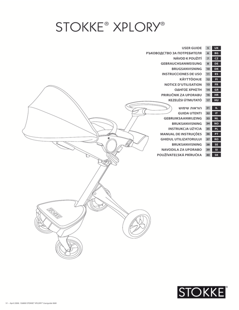 STOKKE ® XPLORY® ® STOKKE XPLORY ® USER GUIDE 5 UK РЪКОВОДСТВО ЗА ПОТРЕБИТЕЛЯ 6 BG NÁVOD K POUŽITÍ 7 CZ GEBRAUCHSANWEISUNG 8 DE BRUGSANVISNING 10 DK INSTRUCCIONES DE USO 11 ES KÄYTTÖOHJE 12 FI NOTICE D’UTILISATION 13 FR ΟΔΗΓΟΣ ΧΡΗΣΤΗ 14 GR PRIRUČNIK ZA UPORABU 16 HR KEZELÉSI ÚTMUTATÓ 17 HU הוראות שימוש 31 IL GUIDA UTENTI 32 IT GEBRUIKSAANWIJZING 33 NL BRUKSANVISNING 34 NO INSTRUKCJA UŻYCIA 35 PL MANUAL DE INSTRUÇÕES 36 PT GHIDUL UTILIZATORULUI 37 RO BRUKSANVISNING 38 SE NAVODILA ZA UPORABO 39 SI POUŽÍVATEĽSKÁ PRÍRUČKA 40 SK www.stokke.com V1 – April 2008. 136800 STOKKE® XPLORY® Userguide 06M STOKKE ® XPLORY ® 2 STOKKE ® XPLORY ® 3 1 3 ENG Materials: Aluminium profiles Various types of plastic Fabrics: Polyester Weight: 10,5 kg Folded size: 57x42x99cm/ 22,4x16,5x 39,0 inch (incl. wheels) BG CZ Материали: Алуминиеви профили Различни типове пластмаса Materiály: Hliníkové profily Různé typy plastu Материя: Полиестер Tkanina: Polyester Тегло: 10,5 kg Hmotnost: 10,5 kg Размер в сгънато положение: 57x42x99cm (вкл. колелетата) Rozměry po složení: 57x42x99 cm (včetně koleček) DE Material: Kunststoff Profile aus Aluminium Textilien: Polyester Gewicht: 10,5 kg Grösse geklappt: 57x42x99 cm (mit Rädern) DK Materialer: Aluminiumprofiler Forskellige plasttyper Tekstiler: Polyester Vægt: 10,5 kg Størrelse, sammenfoldet: 57x42x99cm (inkl. hjul) ES Materiales: Perfiles de aluminio Diferentes tipos de plasticos Tejidos: Poliéster Peso : 10,5 kg Tamaño plegado: 57x42x99 cm (ruedas incluidas) FI Materiaalit: Alumiiniprofiilit Eri Kankaat: Polyesteri Paino: 10,5 kg Koko taitettuna: 57x42x99 cm (pyörät mukaan lukien) FR GR HR Matériaux : Aluminium, différents types de plastique. Σκελετός αλουμίνιο Διάφοροι τύποι πλαστικού Tissus : Polyester Υλικό υφάσματος Πολυεστέρας Tkanina: Poliester Βάρος: 10,5 κιλά Masa: 10,5 kg Μέγεθος, αναδιπλωμένο: 57 x 42 x 99εκ. (συμπεριλαμβανομένων των τροχών) Dimenzije (sklopljena): 57x42x99 cm (s kotačima) Poids : 10,5 kg Dimensions poussette pliée : 57x42x99 cm/ 22,4x16,5x 39,0 inch (roues incluses) Materijali: Aluminijski profili Razne vrste plastika HU Használható: 6 hónapos kortól 2 Alapanyagok Alumíniumidomok Különböző Műanyagfajták Szövet: Poliészter • • • • • • Súly: 10,5 kg Méret összehajtott állapotban: 57x42x99 cm (kerekekkel) Quick start Бърз старт Rychlý začátek Pika-aloitusopas Γρήγορη εκκίνηση Brzi početak rada • התחלה מהירה • Szybki start • Start rapid • Hitri vodnik • Rýchly začiatok IL :חומרים אלומיניום פלסטיק :בד פוליאסטר :משקל ק“ג10,5 גודל במצב :מקופל ס“מ42x99x57 ()כולל גלגלים IT NL NO Materiali: Profili in alluminio Diversi tipi di plastica Materialen: Aluminium profielen Diverse soorten plastic Materialer: Aluminiumsprofiler Forskjellige typer plast Tessuti: Poliestere Stoffen: Polyester Tekstiler: Polyester Peso: 10,5 kg Gewicht: 10,5 kg Vekt: 10,5 kg Misure da chiuso: 57x42x99 cm (ruote incluse) Grootte volledig ingeklapt: 57x42x99 cm. (incl. wielen) Størrelse slått sammen: 57x42x99 cm (inkl. hjul) PL PT Materiały: Profile aluminiowe Różne rodzaje plastiku Materiais: Perfis de alumínio Diversos tipos de plástico Tkaniny: Poliester Ciężar: 10,5 kg Rozmiar po złożeniu: 57 x 42 x 99 cm (w tym kółka) Tecidos: Poliéster Peso: 10,5 kg Tamanho fechado: 57x42x99 cm (inculsive as rodas) RO Folosinţă: Începând cu 6 luni SE Material: Aluminiumprofiler Olika typer av plast Materiale: Profiluri de aluTyger: miniu Polyester Diferite tipuri de plastic Vikt: 10,5 kg Ţesături: Poliester Greutate: 10,5 kg Mărime pliat: 5 7x42x99 cm (inclusiv roţi) Mått hopvikt: 57x42x99 cm (inkl hjul) SI SK Material: Aluminijasti profili Različne vrste plastike Materiály: Hliníkové profily Rôzne typy plastu Blago: Poliester Tkanina: Polyester Teža: 10,5 kg Hmotnosť: 10,5 kg Velikost zloženega vozička: 57x42x99 cm(vključno s kolesi) Rozmery po zložení: 57x42x99 cm (vrátane kolies) 1 EN 1888:2003 + A1/A2/A3:2005 UK: BS 7409:1996 UK: Flammability: BS 5852 USA: ASTM F 833-01 AU: AS/NZS 2088:2000 Stokke ® Xplory ® Patent no.: 315230 4 STOKKE ® XPLORY ® ENG Quick start . . . . . . . . . . . . . . . . . . . . . . . . . . 33 5-17 Warnings/Complaints . . . . . . . . . . . . . . . . . . 5-17 18 Folding/Unfolding. . . . . . . . . . . . . . . . . . . . . 18 19 Adjusting the handle . . . . . . . . . . . . . . . . . . 19 20 Seat assembly . . . . . . . . . . . . . . . . . . . . . . . 20 21 Seat dissasembly . . . . . . . . . . . . . . . . . . . . . 21 22 Adjusting the seat height . . . . . . . . . . . . . . . 22 22 Mounting/Adjusting the foot reel . . . . . . . . . 22 23 Seat rail . . . . . . . . . . . . . . . . . . . . . . . . . . . . 23 23 Break . . . . . . . . . . . . . . . . . . . . . . . . . . . . . . 23 23 Attaching the back wheels . . . . . . . . . . . . . . 23 24 Use on stairs . . . . . . . . . . . . . . . . . . . . . . . . . 24 25 Fitting the textiles . . . . . . . . . . . . . . . . . . . . . 25 26 Baby Insert . . . . . . . . . . . . . . . . . . . . . . . . . . 26 26 Accessory pocket . . . . . . . . . . . . . . . . . . . . 26 27 Adjusting the harness . . . . . . . . . . . . . . . . . . 27 28 Maintenance . . . . . . . . . . . . . . . . . . . . . . . . . 28 DE Quick start . . . . . . . . . . . . . . . . . . . . . . . . . . 33 Wichtig/Reklamationen . . . . . . . . . . . . . . . . . 5-17 18 Hinterachse aus- und einklappen . . . . . . . . . 18 19 Schieber verstellen . . . . . . . . . . . . . . . . . . . . 19 20 Sitz abnehmen . . . . . . . . . . . . . . . . . . . . . . . 20 21 Benutzung des Sitzes oh