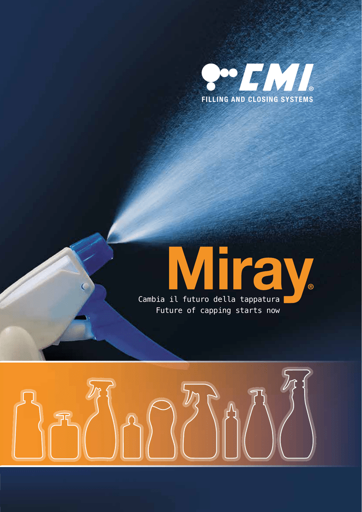 ® FIL LIN G AN D CL OSIN G SYSTEMS ® Cambia il futuro della tappatura Future of capping starts now Miray vuol dire futuro. ® Non c’è futuro senza tecnologia, ed è la tecnologia che da oltre 30 anni permette a CMI di progettare e realizzare sempre nuovi sistemi per il riempimento e la tappatura, che sanno anticipare le vostre aspettative. La tecnologia rende semplici le cose complesse, trova soluzioni per ridurre gli errori, rende più sicure le vostre azioni e dà risultati in tempi brevi. Con il rivoluzionario tappatore Miray, CMI ha raggiunto un nuovo obiettivo: mettere il futuro a vostra disposizione. Miray means future. We like the word future because it represents our daily goal. There is no future without technology, and technology has been supporting CMI for more than 30 years to design and build new filling and capping systems anticipating constantly your expectations. Technology makes complex simple, finds solutions to reduce errors, makes your actions safer and gives results quickly. With the revolutionary Miray capper, CMI has reached a new goal: putting the future at your disposal. Futuro è una parola che ci piace, perché rappresenta il nostro obiettivo di ogni giorno. 3 min Il cambio formato ultra rapido: più valore al vostro lavoro. La tecnologia costruttiva di Miray rivoluziona tutti i criteri di tappatura che avete conosciuto fino ad ora. Grazie alla gestione completamente automatica, Miray consente di effettuare un cambio formato facile e senza errori. L’estrema flessibilità operativa di Miray garantisce il passaggio da una tipologia di tappo e/o bottiglia alla successiva in circa tre minuti. The quickest size changeover: more value to your work. Miray’s construction technology revolutionizes all capping criteria you have ever known. Thanks to total automatic running, Miray allows easier and error-free changeover. Miray’s huge operational flexibility guarantees only three minutes’ switch from one type of cap and/or bottle to another. Procedura di cambio formato Size changeover procedure Sostituzione di stella e guida esterna senza utensili Sostituzione del sistema di presa tappo e guida senza utensili Rilevamento altezza della bottiglia tramite sensore Inserimento produzione oraria (pz/h) Starwheel and side rail tool-free replacement Cap-picking system and rail tool-free replacement Bottle height detection with sensor Hourly output typing (pcs/h) ® Gestione automatizzata: riduce i tempi e migliora l’efficienza. Miray è un tappatore rotativo monotesta completamente automatico ed autonomo, che può essere inserito in linee di confezionamento già esistenti, su richiesta anche rispondenti alle normative vigenti ATEX. La macchina, tramite il controllore multi asse, sincronizza i movimenti dei 6 motori brushless per ottenere elevate cadenze produttive nell’ordine dei 2.000 pezzi/ora* ed oltre. La gestione della macchina da parte dell’operatore è semplificata, poichè riduce i dati inseriti nel pannello solo all’altezza della bottiglia ed alla cadenza produttiva oraria. * Cadenze produttive diverse previa verifica vostra campionatura. Automated running: time-saving and efficiency-improving. Miray is a fully automatic and autonomous single-head rotary capping-machine, which can be inserted into existing packaging lines, in compliance with ATEX regulations upon request. By means of multi-axis controller, the machine synchronizes 6 brushless motors movements to achieve higher output rates up to more than 2.000 pcs/h*. Machine running by the operator is simplified, as it cuts to bottle height and hourly output rate data to be entered in control panel. * Various output rates upon checking your sample. Miray è adatto alla tappatura di bottiglie con tappo: Miray is suitable for capping bottles with following types of cap: www.mirayita.com A vite Dispenser Trigger Erogatore A pressione Screw Dispenser Trigger Dispenser Press-on 1 2 1 2 4 3 6 1 Trasporto tappi 2 Sistema automatico di presa del tappo 3 Pre-stiro e verifica altezza cannula automatici 4 Sistema esclusivo di avvitatura SCREWMASTER® 5 Sensore di rilevamento altezza bottiglia 6 Stella e guida esterna bottiglia 3 5 5 1 Caps handling 2 Cap-picking automatic system 3 Automatic pre-straighten and straw height check 4 SCREWMASTER® unique screwing system 5 Bottle height detection sensor 6 Bottle’s starwheel and side rail 4 Caratteristiche tecniche > Sistema automatico Pick&Place > Pre-stiro automatico della cannuccia > Algoritmo di avvitatura SCREWMASTER® > > > > controlla la coppia di serraggio del tappo ed il corretto orientamento rispetto alla bottiglia Sensore elettronico di rilevamento altezza bottiglia Sistema di lubrificazione programmata segnala all’operatore quando necessaria Sistema di autodiagnosi delle temperature degli assi gestita da pannello operativo Manuale d’istruzione consultabile on line dall’operatore anche con la macchina in funzione Specifications 6 > Automatic Pick&Place system > Straw automatic pre-straighten > SCREWMASTER® screwing algorithm > > > > checking cap tightening moments and its correct orientation over the bottle Electronic sensor for bottle height detection Scheduled lubrication system alerting operator when needed Self-diagnosis system for axis temperatures managed by operating panel User’s manual available online for the operator even when the machine is in operation Constant Machines Innovation www.mirayita.com CMI opera con un sistema di gestione certificato secondo la norma ISO 9001 CMI works with a certified management system according to ISO 9001 norm ® F IL L ING A ND CLO SING SY STEMS via Montegrappa, 5 28047 Oleggio (NO) ITALY Ph. +39 0321 91144 Fax +39 0321 992693 [email protected] www.cmiita.com www.mirayita.com CMI S.p.A. si riserva il diritto di effettuare modifiche tecniche atte al miglioramento dei propri macchinari senza alcun preavviso. MIRAY® e SCREWMASTER® sono marchi registrati di proprietà di CMI S.p.A. // CMI reserves the 