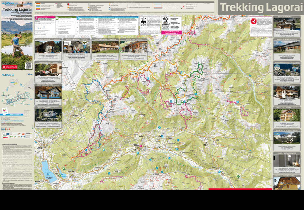 Alta Via del Granito con giro del Zimon Trekking Lagorai Trekking Alta via del Porfido Trekking Alta via del Porfido MUSEO / MUSEUM: Cimitero / Cemetery / Friedhof Ferrovia / Railway / Eisenbahn Albergo Hotel / Hotel Croce / Cross / Kreuz Stazione treni / Railway Station / Bahnhof Strade principali / Main roads / Hauptstraße Divieti strade / Prohibition / Verbot für Fahrzeuge aller Art Altri sentieri / Other tracks / Andere Wege Malga / Cheese farm/ Almhütte Oasi WWF Valtrigona WWF Oasis of Valtrigona WWF-Naturschutzgebiet Valtrigona Chiesa / Church / Kirche Riconoscimento Bandiera Blu d’Europa 2015 Awarded with European Blue Flag 2015 Auszeichnung Blaue Fahne Europas 2015 PUNTI D’INTERESSE GRANDE GUERRA / PLACES OF INTEREST OF THE GREAT WAR / INTERESSANTE PUNKTE DES ERSTEN WELTKRIEGES FORTI / FORTS / WERKE: Confine regione / Border region Grenze der Region Scala 1: 60.000 Sentiero della pace / Path of Peace / Friedenspfad Via Claudia Augusta 1. Forte di Tenna / Fort of Tenna Das Werk von Tenna 2. Forte Colle delle Benne / Fort Colle delle Benne / Das Werk Colle delle Benne 3. Forte Spitz Levico / Fort Spitz Levico Das Werk Spitz Levico 4. Forte Busa Verle / Fort Busa Verle Das Werk Busa Verle 5. Forte Leone di Cima Campo Fort Leone di Cima Campo Das Werk Leone Cima Campo 1.700m slm Loc. Prese, 1 - 38051 Roncegno Terme Cell. +39 347 8403522 www.rincher.com - [email protected] 2. 3. 4. 5. 1. Caposaldo Italiano di Monte Lefre Italian stronghold on mount Monte Lefre Italienische Stellung auf dem Berg Monte Lefre Caposaldo Austriaco di Monte Valpiana Ospedale “Herta Miller Haus” Austrian stronghold Hospital “Herta Miller Haus” on mount Monte Valpiana Österreichische Stellung auf dem Monte Valpiana Krankenhaus “Herta Miller Haus”” Caposaldo Croz di Cenon e di Primalunetta Croz di Cenon and Primalunetta strongholds Stellung Befestigung Croz di Cenon und Primalunetta Cippo Passo Brocon / Boundary stone Passo Brocon / Grenzstein Passo Brocon Caposaldo Austriaco e Italiano di Cima Ortigara Austrian and Italian strongholds on peak Cima Ortigara / Österreichische und Italienische Stellung auf dem Gipfel Cima Ortigara 6. Chiesetta di Sant’Osvaldo / Sant’Osvaldo tiny church / Kirchlein Sant’Osvaldo 7. Scalinata Tombolin di Rava / Staircase Tombolin di Rava / Freitreppe Tombolin di Rava 8. Trincee del Monte Panarotta / Trenches on mount Monte Panarotta / Schützengräben des Berges Monte Panarotta 9. Trincerone di Grigno / Fort of Grigno / kleiner Schützengraben von Grigno 10. Caposaldo di Zoparina / Zoparina stronghold Befestigung/Stellung Zoparina 11. Cimitero militare di Sorgazza / Military cemetery Sorgazza / Militärfriedhof Sorgazza 12. Caposaldo di Cima Socede e Lasteati Strongholds on peaks Cima Socede and Lasteati / Stellung auf dem Gipfel Cima Socede und Lasteati RIFUGIO SETTE SELLE 2.014m slm RISTORANTE MALGA BAESSA Valle dei Mocheni - Palù del Fersina Tel. +39 0461 550101 - Cell. +39 347 1594929 www.setteselle.altervista.org [email protected] Loc. Val Calamento - 38050 Telve Cell. +39 348 2847960 o Tel. +39 0461 766041 www.ristorantemalgabaessa.com 13. Stol del Prete / Stol del Prete / Stol del Prete 14 . Osservatorio Cima Manderiolo / Observatory on peak Cima Manderiolo / Beobachtungspunkt auf dem Gipfel Cima Manderiolo 15. Sasso Gambarile / Sasso Gambarile Sasso Gambarile 16. Bunker della Marangona / Marangona Bunker Bunker der Marangona 17. Capitello di Spera - Fatto di Carzano /Capital of Spera - Carzano war events / Kapitell in Spera den Kriegsereignissen in Carzano gewidmet 18. Cimitero di Monte Civeron / War cemetery on mount Monte Civeron/ Friedhof auf dem Berg Monte Civeron 19. Col del Fortin / Col del Fortin / Col del Fortin 20. La Rocchetta MALGA CERE Unica Oasi del Wwf dell’arco alpino, l’Oasi Wwf Vatrigona è situata in una valle laterale alla Val Calamento, ai piedi della catena del Lagorai. La notevole variazione climatica si riflette sulla flora e sulla fauna presenti, molto ricche; sono rappresentate tutte le specie tipiche alpine. The only WWF Oasis of the Alpine area, Valtrigona is located in a valley close to Val Calamento, at the footsteps of Lagorai mountain chain. The remarkable difference of climate enriches local flora and fauna. The area counts with all the alpine species. Als einziges Naturschutzgebiet im Alpenraum befindet sich die WWF-Oase-Valtrigona in einem Seitental des Val Calamento, am Fuße der Lagorai-Bergkette. Die bedeutenden klimatischen Bedingungen spiegeln sich auch in der hiesigen Fauna und Flora wieder, es gibt alle, für den Alpenraum typischen, Arten. Hai mai pensato di adottare una mucca? Have you ever considered to adopt a cow? adopt a cow adoptiere eine kuh adopteer een koe Hast du je daran gedacht, eine Kuh zu adoptieren? www.visitvalsugana.it /adottaunamucca Trekking Lagorai Il Sentiero della Pace del Trentino si snoda per oltre 450 chilometri di sentieri, strade forestali, trincee e camminamenti che congiungono lo Stelvio alla Marmolada, ripercorrendo la linea del fronte della Prima Guerra Mondiale. The Path of Peace of Trentino is more than 450 km long and connect on tracks, forest roads and communication trenches Stelvio with Marmolada, following the First War front line. Der Friedensweg des Trentino verläuft über 450 Kilometer auf Wegen, Forststraßen und durch Schützengräben. Er verbindet den Stelvio mit der Marmolada und folgt dabei der Frontlinie aus dem Ersten Weltkrieg. RIFUGIO REFAVAIE 1.116m slm DELL RO PACE Museo Mostra Permanente della Grande Guerra in Valsugana e sul Lagorai. Permanent Exhibition of Great War in Valsugana and Lagorai. Ein Museum mit einer Dauerausstellung über den Ersten Weltkrieg im Valsugana&Lagorai. AGRITUR RINCHER GB Ex Malga / Former Cheese Farm Info stagionale / Seasonal Information Saisonaler Infopoint La presente cartina e la relativa cartografia sono da considerarsi indicative e comunque da associare a cartine più specializzate e dettagliate (Kompass, Tabacco, 