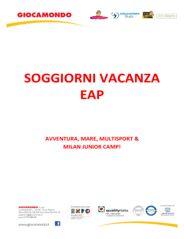 SOGGIORNI VACANZA EAP AVVENTURA, MARE, MULTISPORT & MILAN JUNIOR CAMP! CENTRO VACANZE OASI CARPINETO (AP) Gentili genitori, siamo lieti di avere come ospite suo/a figlio/a presso il nostro Soggiorno AVVENTURA, MARE, MULTISPORT & MILAN JUNIOR CAMP! al Centro Vacanze Oasi Carpineto (AP). Il presente opuscolo ha lo scopo di offrire notizie utili circa la documentazione da presentare all’atto della partenza nonché all’organizzazione dei soggiorni medesimi. PER LA PARTENZA Al momento della partenza il partecipante dovrà essere in possesso: RECAPITO DEI GENITORI SCHEDA SANITARIA PERSONALE IL PARTECIPANTE CHE VIAGGIA IN AEREO DEVE ESSERE MUNITO DI DOCUMENTO DI RICONOSCIMENTO (NB. Non mettere nel bagaglio a mano: forbicine, limette o tronchesine da manicure e contenitori liquidi, creme solari, dentifricio, ecc. per evitare il ritiro in aeroporto.) DENARO E OGGETTI PERSONALI Si invitano i genitori a non dare oggetti di valore (es. orologi, collane, ecc.). Il partecipante potrà portare con sé una cifra in denaro (si consiglia 80 euro) che potrà facoltativamente consegnare alla “banca del centro’’ oppure tenere con sé assumendosi la responsabilità di eventuali smarrimenti. OGGETTI SMARRITI Se al ritorno dalla vacanza notate l'assenza di una qualsiasi cosa, contattate immediatamente il centro vacanza. Vi saranno buone possibilità di ritrovare gli oggetti dimenticati. ALIMENTAZIONE In ogni centro vacanza si garantirà l’utilizzo di prodotti alimentari di prima qualità e la salubrità delle ASSISTENZA SANITARIA preparazioni alimentari nel rispetto delle disposizioni di legge. Verrà fornito un menù settimanale completo, con l’impegno di personalizzare i pasti nei confronti dei ragazzi con intolleranze alimentari segnalate e la preparazione di particolari menu in occasione di festività o ricorrenze. Il servizio di ristorazione deve essere garantito per i ragazzi e per il personale operante nel soggiorni. ASSISTENZA SANITARIA A disposizione dei nostri ragazzi ci sarà un servizio di assistenza medica e infermieristica 24 ore su 24. All’interno di ogni centro sarà allestita una infermeria con personale sanitario autorizzato che garantiràCON la presenza e la reperibilità per tutta la durata del soggiorno. CONTATTI I GENITORI CONTATTI TELEFONICI Nel caso avvertiate delle difficoltà riscontrate dai vostri figli, non indugiate a contattare la Direzione del Centro Vacanza: ViNumero ricordiamo che partecipando al soggiorno Milan Camp, i ragazzi riceveranno in Tel.334/6977751 Numero Tel. 329/8265345 Si possono effettuare chiamate durante ore pasti ( 13-14:00 / 20-21:00 ). E’ possibile fissare appuntamenti telefonici o lasciare comunicazioni da concordare con il responsabile . I partecipanti potranno portare con sé il cellulare personale (assumendosene la responsabilità in caso di smarrimento o rottura) e utilizzarlo solo in momenti di inattività didattica indicati dall’organizzazione. INDIRIZZO: SP 76 per Colle San Marco- Frazione Carpineto – 63100 Ascoli Piceno COSA METTERE IN VALIGIA Si consiglia di preparare il bagaglio pensando con razionalità e secondo le proprie abitudini, di solito la tendenza dei genitori è quella di fornire al ragazzo una esagerata quantità di indumenti; a tal proposito si ricorda che nella struttura è funzionante il servizio lavanderia. L'abbigliamento deve essere pratico ed essenziale, ben equilibrato tra situazioni di caldo del giorno e fresco della sera, facile da lavare e da non stirare, per le escursioni consigliamo scarpe comode, meglio se già usate. Importante che tutto il materiale sia riconosciuto dal ragazzo come di sua proprietà, quindi si sconsiglia materiale di recente acquisto INTIMO: N°12 paia di mutande, N°12 paia di calze, N°7 canottiere, magliette NOTTE: N°2 pigiami (suggeriamo 1 leggero e 1 più pesante), GIORNO: N°10 t-shirt, N°3 felpe, N°4 pantaloncini corti, N°3 pantaloni lunghi, N°1 tuta sportiva, N°1 giubbotto, N°1 k-way, scarpe da ginnastica, scarpe da passeggio BAGNO: accappatoio, phon, borsello da toilette con l’occorrente per l’igiene personale, ciabatte plastica, un asciugamano ad uso personale (gli asciugamani vengono comunque forniti dall’albergo) PISCINA: N°2 costumi da bagno, cuffia da bagno ESCURSIONI: borraccia, scarponcini leggeri per passeggiate o scarpe da ginnastica robuste, cappellino (importante e obbligatorio) ALTRO CONSIGLIATO: burro cacao, fazzoletti carta, creme solari, occhiali da sole, sacchetto di cotone per biancheria sporca ALTRO SCONSIGLIATO: grosse quantità di denaro, oggetti di grande valore (cellulari, macchinette fotografiche, videocamere, lettori Mp3, gioielli, consolle videogiochi, ecc.), in generale qualsiasi oggetto superfluo per una vacanza in montagna. TIPOLOGIA DI SOGGIORNO: Vi ricordiamo che partecipando al soggiorno, i ragazzi potranno aderire (compilando il modello scelta kit in allegato) ad uno dei seguenti programmi: AVVENTURA E MILAN JUNIOR CAMP verrà consegnato in regalo il KIT ufficiale A.C. Milan marcato Adidas AVVENTURA E MULTISPORT PER RAGAZZE E RAGAZZI verrà consegnato in regalo il KIT GIOCAMONDO. ATTIVITA’ DEL SOGGIORNO: Nell’ottica di tematizzare e far vivere un’esperienza emozionante e completa ai ragazzi, abbiamo deciso di proporre due diverse tematiche: 1. AVVENTURA E MILAN JUNIOR CAMP - La vacanza all’OASI CARPINETO sarà un’esperienza Magica. In compagnia di grandi amici, potrai partecipare all’originale SCUOLA CALCIO MILAN, con allenatori ufficiali di Milanello, e avrai in regalo il KIT MILAN di Adidas. 2. AVVENTURA E MULTISPORT PER RAGAZZE E RAGAZZI - La Vacanza all’Oasi Carpineto non è solo per i “maschietti” che vorranno giocare con il Milan: chi non aderirà al programma del Milan Junior Club potrà scegliere di divertirsi con le numerose attività sportive molto coinvolgenti: Tiro con l’Arco, Mini trekking a cavallo, Pallavolo, Nuoto, Pallanuoto, Basket e Tennis-Tavolo, giochi sportivi, le divertenti attività mo