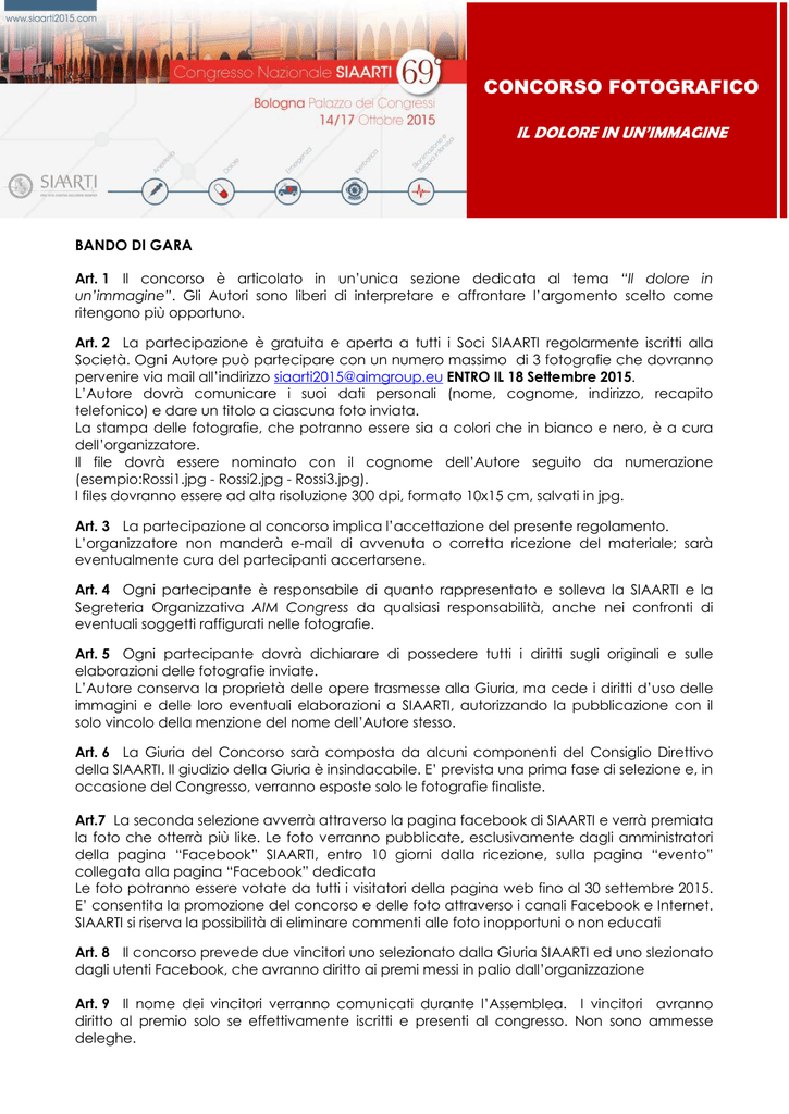 CONCORSO FOTOGRAFICO IL DOLORE IN UN’IMMAGINE BANDO DI GARA Art. 1 Il concorso è articolato in un’unica sezione dedicata al tema “Il dolore in un’immagine”. Gli Autori sono liberi di interpretare e affrontare l’argomento scelto come ritengono più opportuno. Art. 2 La partecipazione è gratuita e aperta a tutti i Soci SIAARTI regolarmente iscritti alla Società. Ogni Autore può partecipare con un numero massimo di 3 fotografie che dovranno pervenire via mail all’indirizzo [email protected] ENTRO IL 18 Settembre 2015. L’Autore dovrà comunicare i suoi dati personali (nome, cognome, indirizzo, recapito telefonico) e dare un titolo a ciascuna foto inviata. La stampa delle fotografie, che potranno essere sia a colori che in bianco e nero, è a cura dell’organizzatore. Il file dovrà essere nominato con il cognome dell’Autore seguito da numerazione (esempio:Rossi1.jpg - Rossi2.jpg - Rossi3.jpg). I files dovranno essere ad alta risoluzione 300 dpi, formato 10x15 cm, salvati in jpg. Art. 3 La partecipazione al concorso implica l’accettazione del presente regolamento. L’organizzatore non manderà e-mail di avvenuta o corretta ricezione del materiale; sarà eventualmente cura del partecipanti accertarsene. Art. 4 Ogni partecipante è responsabile di quanto rappresentato e solleva la SIAARTI e la Segreteria Organizzativa AIM Congress da qualsiasi responsabilità, anche nei confronti di eventuali soggetti raffigurati nelle fotografie. Art. 5 Ogni partecipante dovrà dichiarare di possedere tutti i diritti sugli originali e sulle elaborazioni delle fotografie inviate. L’Autore conserva la proprietà delle opere trasmesse alla Giuria, ma cede i diritti d’uso delle immagini e delle loro eventuali elaborazioni a SIAARTI, autorizzando la pubblicazione con il solo vincolo della menzione del nome dell’Autore stesso. Art. 6 La Giuria del Concorso sarà composta da alcuni componenti del Consiglio Direttivo della SIAARTI. Il giudizio della Giuria è insindacabile. E’ prevista una prima fase di selezione e, in occasione del Congresso, verranno esposte solo le fotografie finaliste. Art.7 La seconda selezione avverrà attraverso la pagina facebook di SIAARTI e verrà premiata la foto che otterrà più like. Le foto verranno pubblicate, esclusivamente dagli amministratori della pagina “Facebook” SIAARTI, entro 10 giorni dalla ricezione, sulla pagina “evento” collegata alla pagina “Facebook” dedicata Le foto potranno essere votate da tutti i visitatori della pagina web fino al 30 settembre 2015. E’ consentita la promozione del concorso e delle foto attraverso i canali Facebook e Internet. SIAARTI si riserva la possibilità di eliminare commenti alle foto inopportuni o non educati Art. 8 Il concorso prevede due vincitori uno selezionato dalla Giuria SIAARTI ed uno slezionato dagli utenti Facebook, che avranno diritto ai premi messi in palio dall’organizzazione Art. 9 Il nome dei vincitori verranno comunicati durante l’Assemblea. I vincitori avranno diritto al premio solo se effettivamente iscritti e presenti al congresso. Non sono ammesse deleghe.