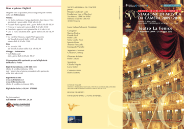 Dove acquistare i biglietti I biglietti sono acquistabili presso i seguenti punti vendita della rete Hellovenezia: Venezia • c/o Teatro La Fenice, Campo San Fantin, San Marco 1965 aperta tutti i giorni dalle 10.00 alle 18.00 • Piazzale Roma agenzia tutti i giorni dalle 8.30 alle 18.30 • Ferrovia S. Lucia tutti i giorni dalle 8.30 alle 18.30 • Tronchetto agenzia tutti i giorni dalle 8.30 alle 18.30 • Lido S. Maria Elisabetta tutti i giorni dalle 8.30 alle 18.30 Mestre • Via Cardinal Massaia, angolo Via Cappuccina dal lunedì al venerdì dalle 10.00 alle 16.00, sabato dalle 8.30 alle 13.00 Dolo • Via Mazzini 108 dal lunedì al sabato dalle 8.30 alle 18.30 Chioggia - Sottomarina • Viale Padova 22 tutti i giorni dalle 8.30 alle 18.30 Un’ora prima dello spettacolo presso la biglietteria del Teatro La Fenice Biglietteria telefonica (+39) 041 2424 (diritto di vendita telefonica 10%) tutti i giorni, fino al giorno precedente allo spettacolo, dalle 9.00 alle 18.00 Biglietteria on-line www.teatrolafenice.it www.hellovenezia.com (diritto di vendita via Internet 18%) Biglietteria via fax (+39) 041 2722663 SOCIETÀ VENEZIANA DI CONCERTI presso Palazzo Giustinian Lolin Fondazione Ugo e Olga Levi San Marco, 2893 San Vidal telefono e fax 041.786764 30100 Venezia call center (+39) 041.24.24 S TAGIONE DI MUSICA SVCDA CAMERA 2009 2010 • NOZZE D’ARGENTO 1984-2009 VENTICINQUE ANNI DI CONCERTI Ivano Nelson Salvarani, Presidente Consiglieri Marino Cortese Davide Croff Paolo Galli Sonia Guetta Finzi Ignazio Musu Antonio Paruzzolo Giampaolo Vianello Segretario Generale Cristiana Csermely Direttore Artistico Paolo Cossato Segreteria Claudia Volpato Lucia Sartori Comunicazione Studio Systema CITTÀ DI VENEZIA ATTIVITÀ E PRODUZIONI CULTURALI, SPETTACOLO, SISTEMA BIBLIOTECARIO AREA DELLE PRODUZIONI CULTURALI E DELLO SPETTACOLO REGIONE DEL VENETO Per informazioni: SOCIETÀ VENEZIANA DI CONCERTI FONDAZIONE TEATRO LA FENICE DI VENEZIA FONDAZIONE TEATRO LA FENICE DI VENEZIA Teatro La Fenice 9 novembre 2009 • 24 maggio 2010 Lunedì 9 novembre 2009 Alexander Lonquich pianoforte e direzione Francesco Tamiati tromba Orchestra di Mantova Musiche di: BEETHOVEN, ŠOSTAKOVIČ Giovedì 26 novembre 2009 Daniel Hope violino Sebastian Knauer pianoforte Musiche di: FALLA, BRAHMS, MENDELSSOHN, GRIEG Lunedì 14 dicembre 2009 Barbara Hannigan soprano Reinbert De Leeuw pianoforte Musiche di: SCHÖNBERG, BERG, WEBERN, ZEMLINSKJ, MAHLER Sabato 19 dicembre 2009 ore 20.00 Rudolf Buchbinder pianoforte Musiche di: SCHUBERT, BEETHOVEN Lunedì 8 febbraio 2010 Massimo Somenzi, Jorge Romero duo pianistico Musiche di: MOZART Lunedì 15 marzo 2010 Lorenzo Di Bella, Roberto Prosseda, Alessandro Cesaro, Alberto Nosé pianoforte Vincitori del Premio Venezia Programma da definire Lunedì 12 aprile 2010 Andrea Bacchetti, Olaf Laneri, Maurizio Baglini, Luca Trabucco pianoforte Vincitori del Premio Venezia Programma da definire Lunedì 19 aprile 2010 Davide Zagoli, Adriana Silva, Reana De Luca, Giuseppe Albanese pianoforte Vincitori del Premio Venezia Programma da definire Tessere e abbonamenti Posto unico numerato per 14 concerti (175 quota sociale + 75 abbonamento) € 250,00 Studenti fino ai 26 anni (platea esclusa) € 100,00 (60 quota sociale + 40 abbonamento) Modalità di acquisto Gli abbonati della stagione 2008-2009 possono esercitare il diritto di prelazione per la nuova stagione. La vendita degli abbonamenti viene effettuata presso la biglietteria del Teatro La Fenice dalle 15.00 alle 18.00 secondo il seguente calendario: • martedì 20 e mercoledì 21 ottobre rinnovo con diritto di prelazione • giovedì 22 ottobre cambio posto vecchi abbonati • venerdì 23 ottobre nuovi abbonamenti oppure tramite bonifico bancario cod. IBAN IT 93 Z 06345 02000 07400 650480L Termine ultimo per abbonarsi: il 9 novembre, data del 1° concerto della stagione, presso la biglietteria del Teatro La Fenice, dalle 18.00 alle 20.00. All’abbonato che porterà un nuovo abbonato verranno dati 2 biglietti omaggio per un concerto a scelta. Biglietti per i singoli concerti Lunedì 11 gennaio 2010 Sol Gabetta violoncello Mihaela Ursuleasa pianoforte Musiche di: ŠOSTAKOVIČ, PIAZZOLLA, FRANCK, GINASTERA Lunedì 18 gennaio 2010 Quartetto Artemis Musiche di: BEETHOVEN Lunedì 1 febbraio 2010 Christian Gerhaher baritono Daniel Huber pianoforte Musiche di: MAHLER Lunedì 3 maggio 2010 Daniil Trifonov pianoforte Vincitore del Concorso Pianistico Internazionale di San Marino ed. 2008 Musiche di: CHOPIN, SKRJABIN Lunedì 17 maggio 2010 Grigory Sokolov pianoforte Programma da definire Lunedì 24 maggio 2010 Yuja Wang pianoforte Musiche di: platea palco centrale palco laterale: posti di parapetto posti a scarsa visibilità posti di solo ascolto galleria e loggione: settore centrale posti a scarsa visibilità posti di solo ascolto € 40,00 € 40,00 € 30,00 € 15,00 € 10,00 € 20,00 € 15,00 € 10,00 ridotto studenti fino ai 26 anni in tutti i settori salvo la platea e i palchi centrali: € 10.00 SCHUMANN, LISZT, PROKOF’EV La Società Veneziana di Concerti si riserva il diritto di apportare ai programmi, alle date e agli orari le modifiche che si rendessero necessarie per esigenze artistiche, tecniche o per cause di forza maggiore. Società Veneziana di Concerti Tel. e fax 041.786764 E-mail: [email protected] www.societavenezianaconcerti.it